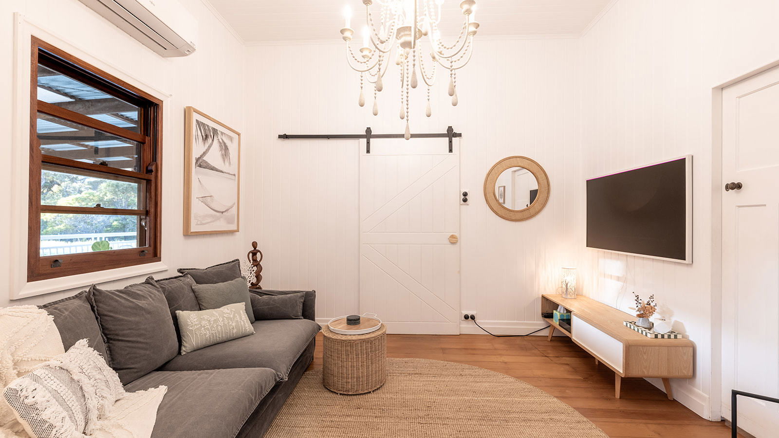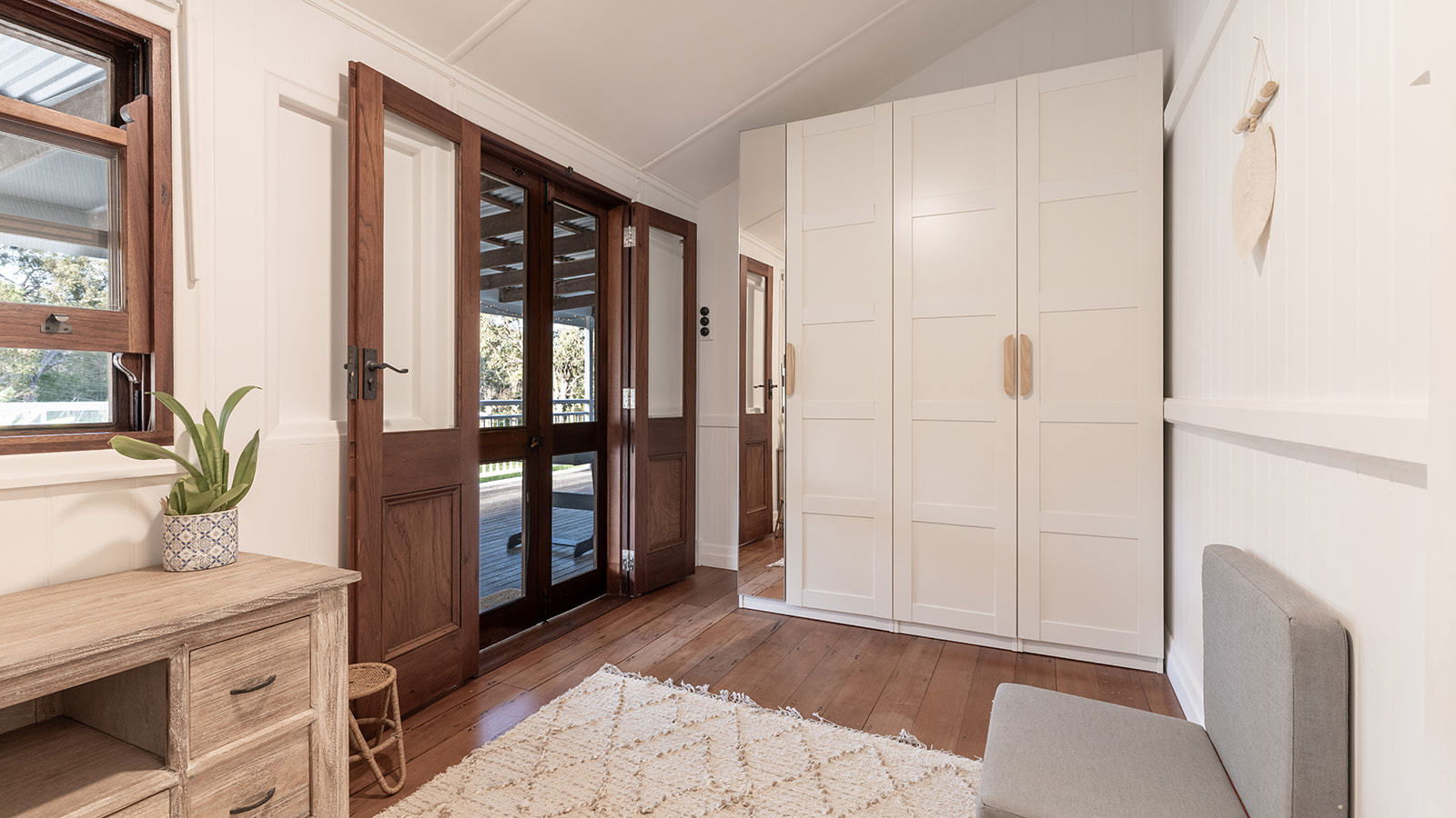 Step inside and the sense of space is immediate. Soaring 3.3-metre ceilings, hardwood VJ walls and rich hardwood timber flooring create an atmosphere that is both elegant and inviting, while cedar windows and doors frame the greenery beyond and allow natural light to pour through the home. Comfort has been carefully considered, with a split system air conditioner servicing the main living zone and ceiling fans positioned throughout.