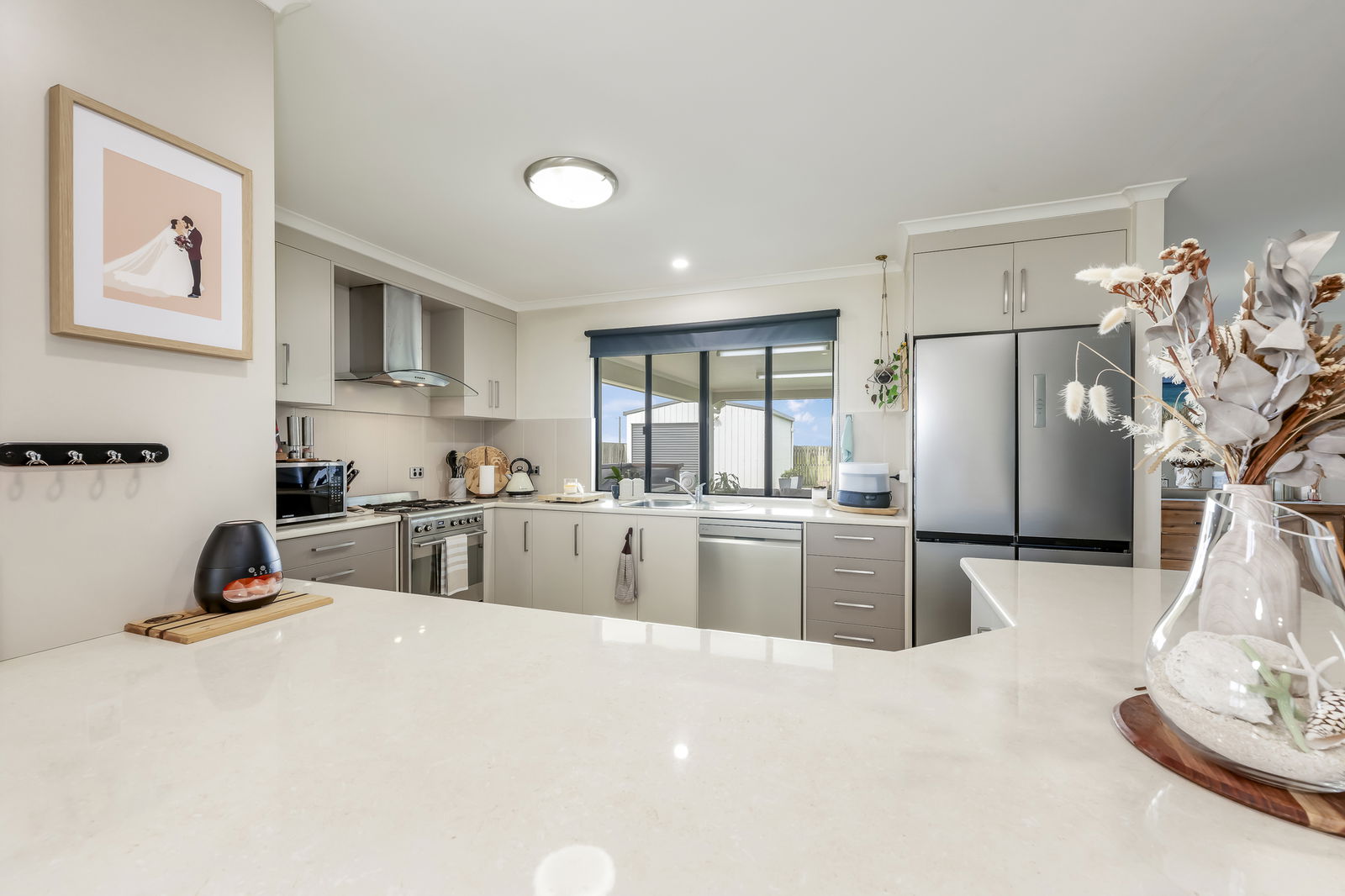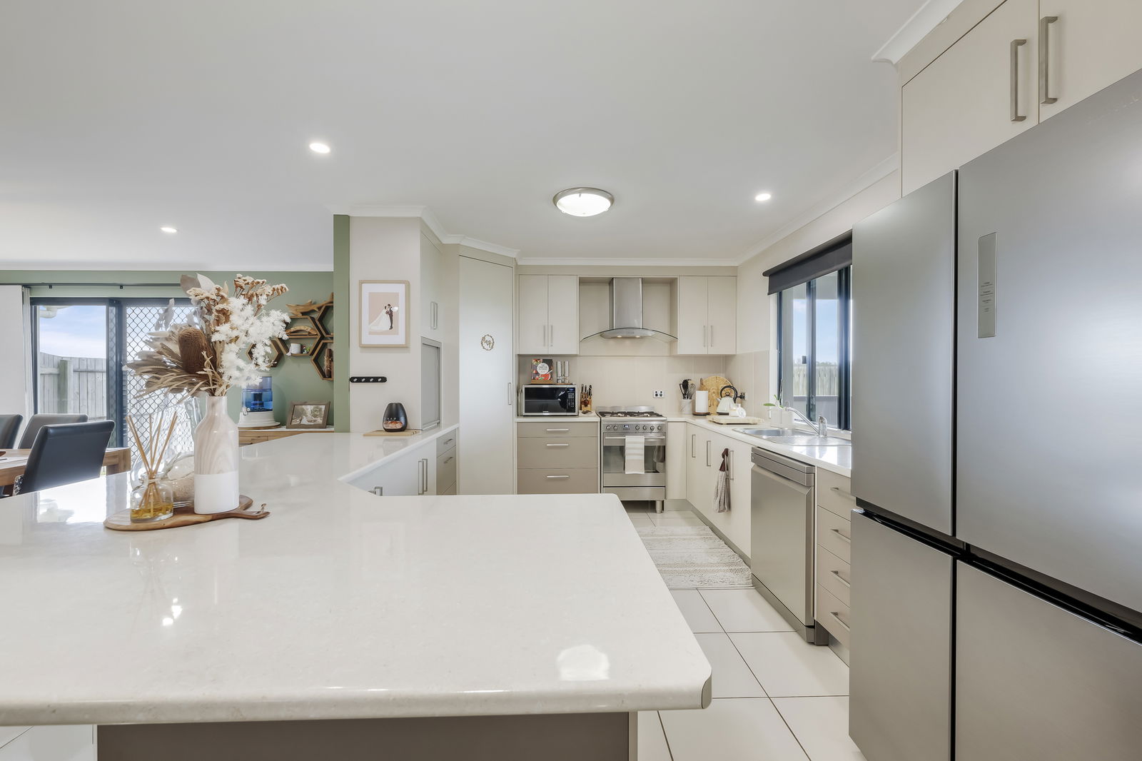 - Modern kitchen with gas cooking, dishwasher, large corner pantry, and room for a double fridge