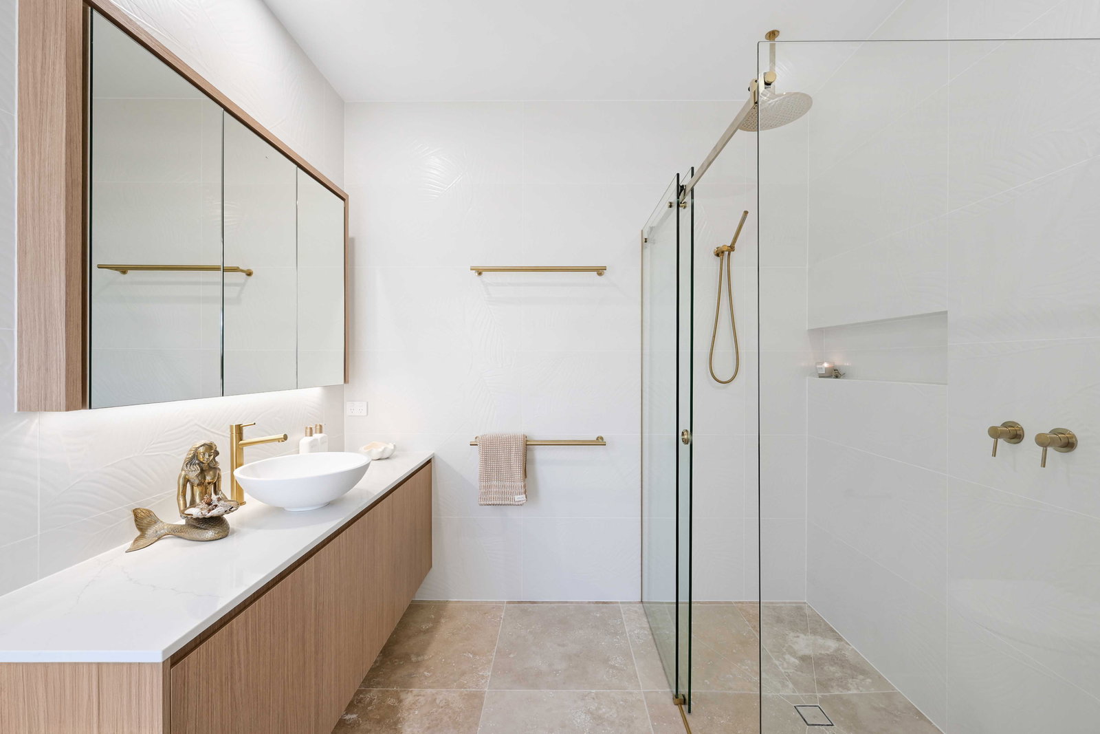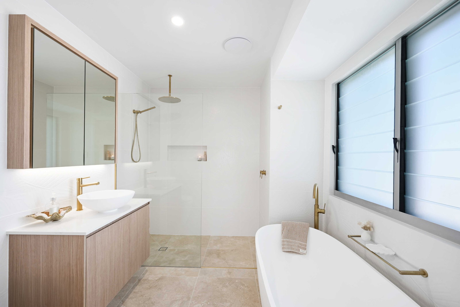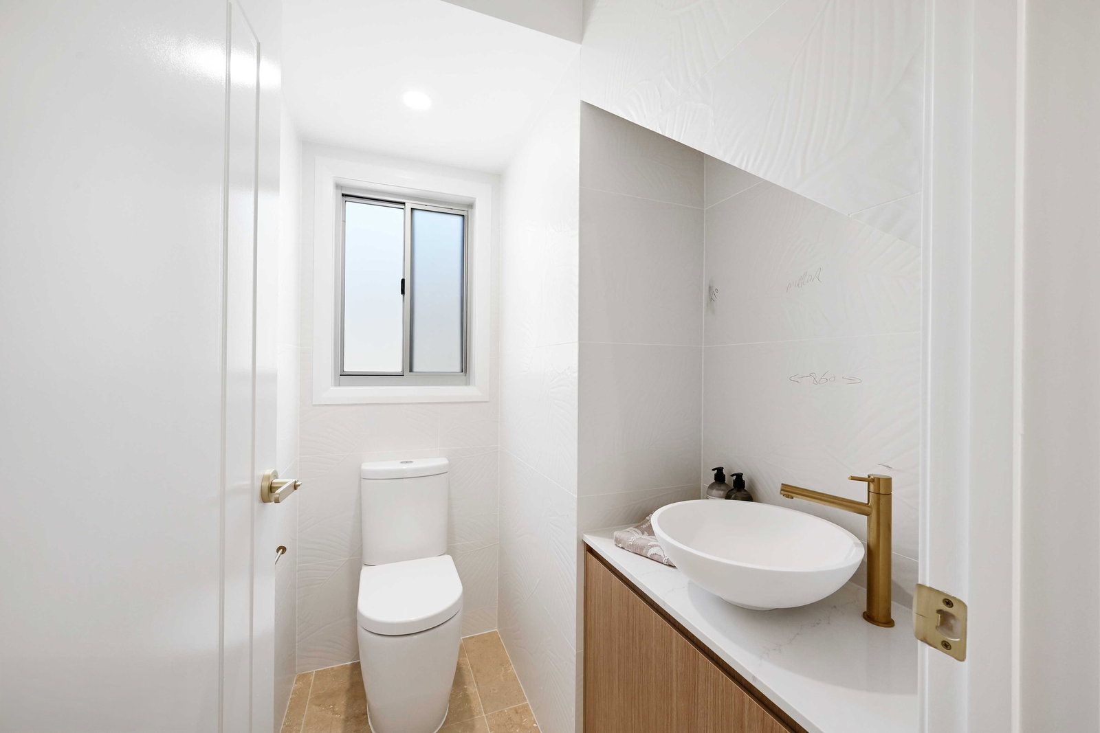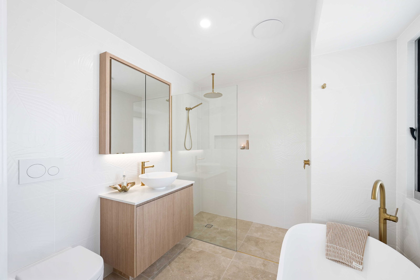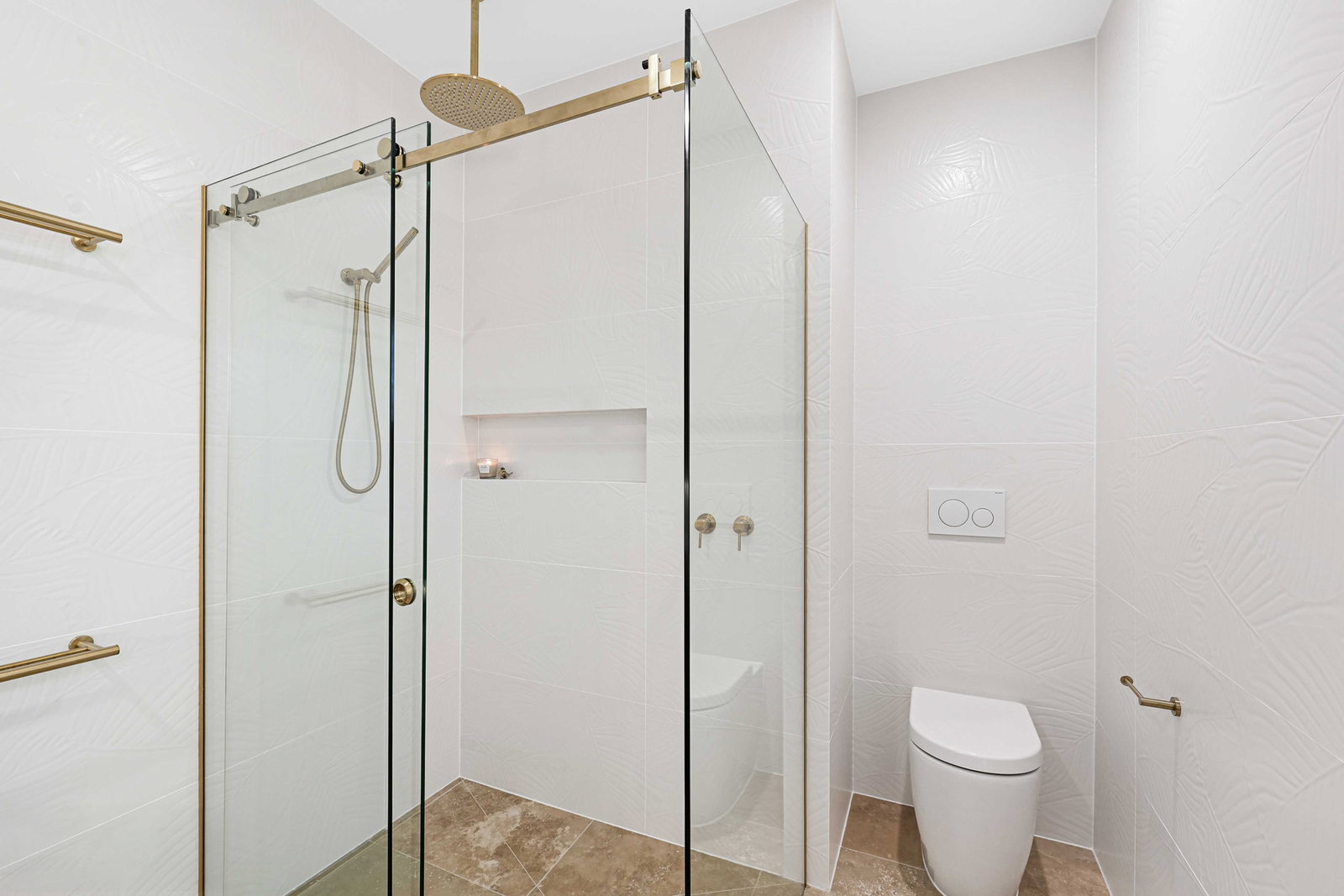 - Ensuite boasts stunning neutral palate with gold finishes, dual shower heads, floating cabinetry and built in toilet.