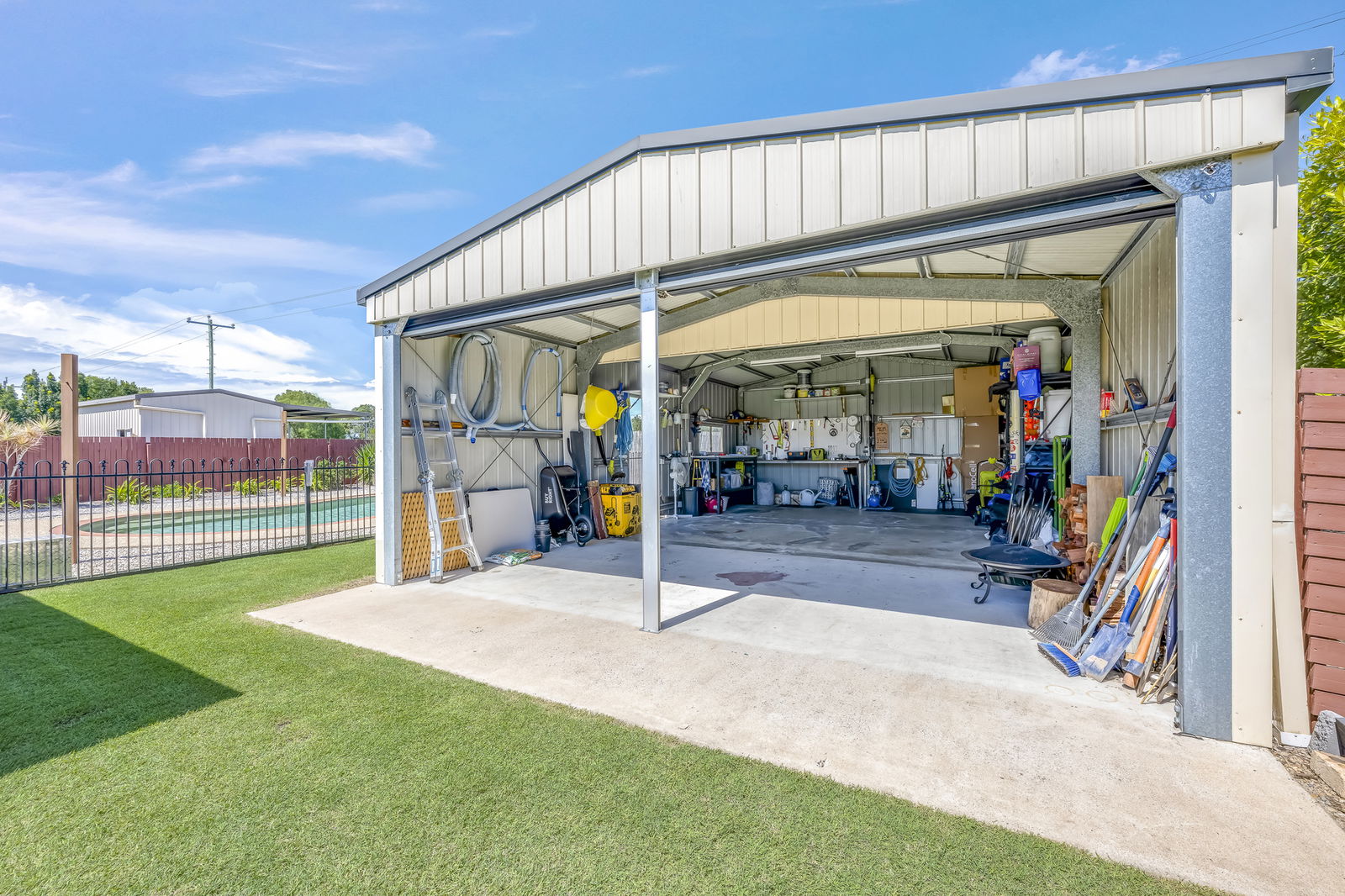 - 6m x 9m powered double-bay shed with drive-through access