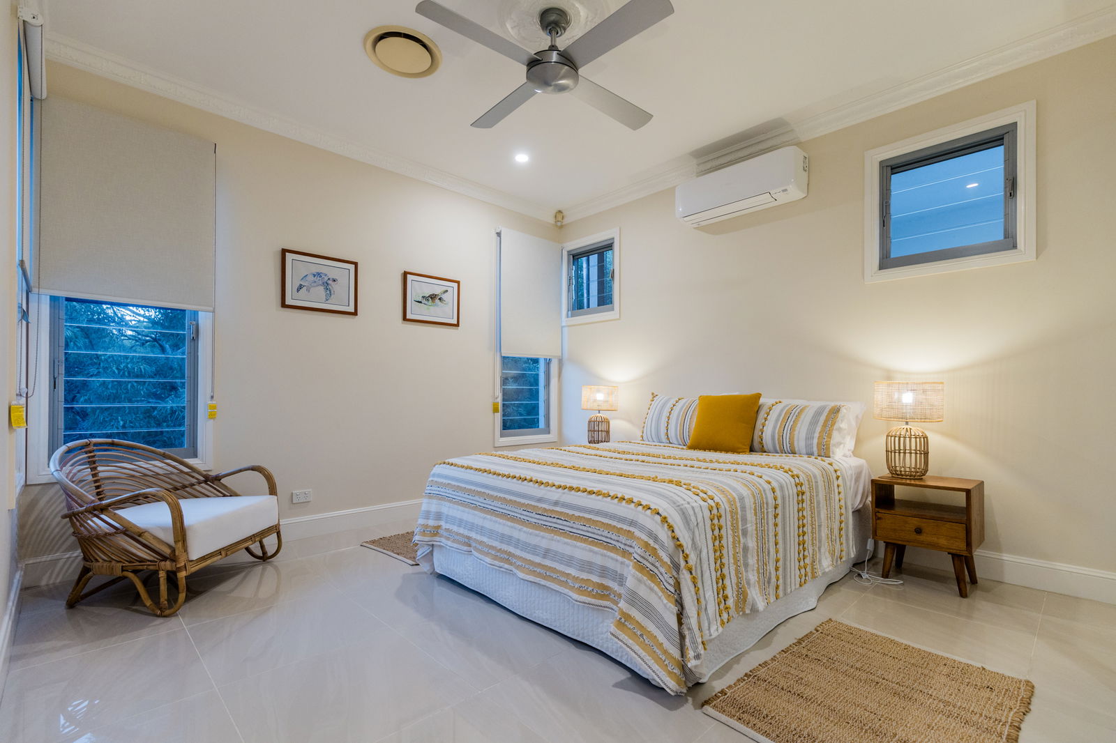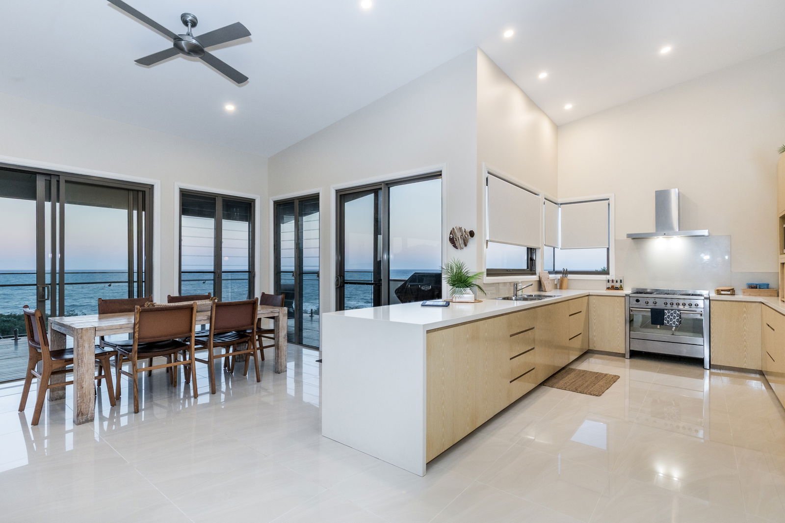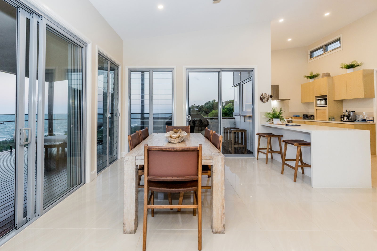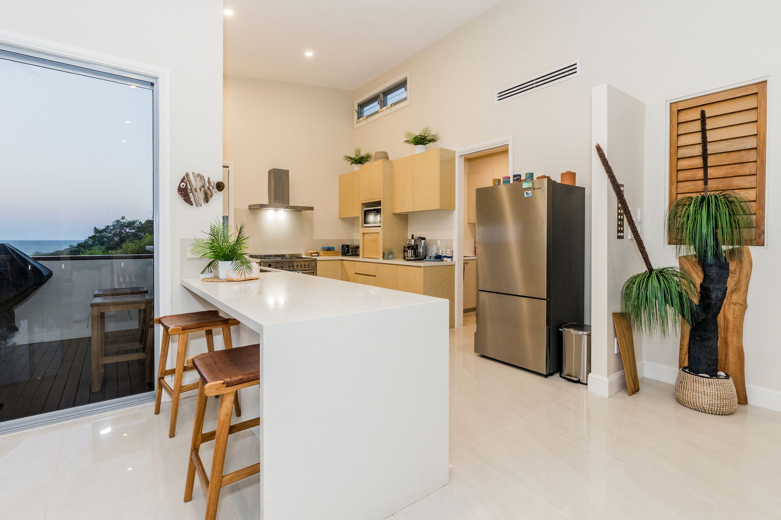 Designed for effortless living, the home features low-maintenance landscaping with automated irrigation, an outdoor shower, and a double lock-up garage with generous storage. The home is air-conditioned throughout and benefits from exceptional natural ventilation through banks of louvres, allowing cooling ocean breezes to flow through the home and often requiring little or no use of the air conditioning.