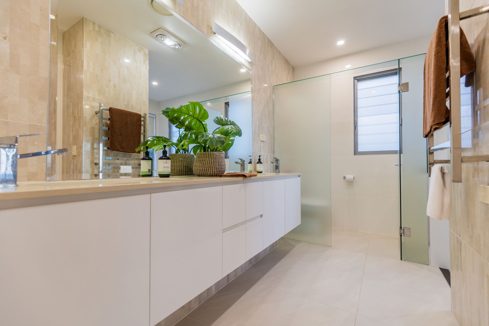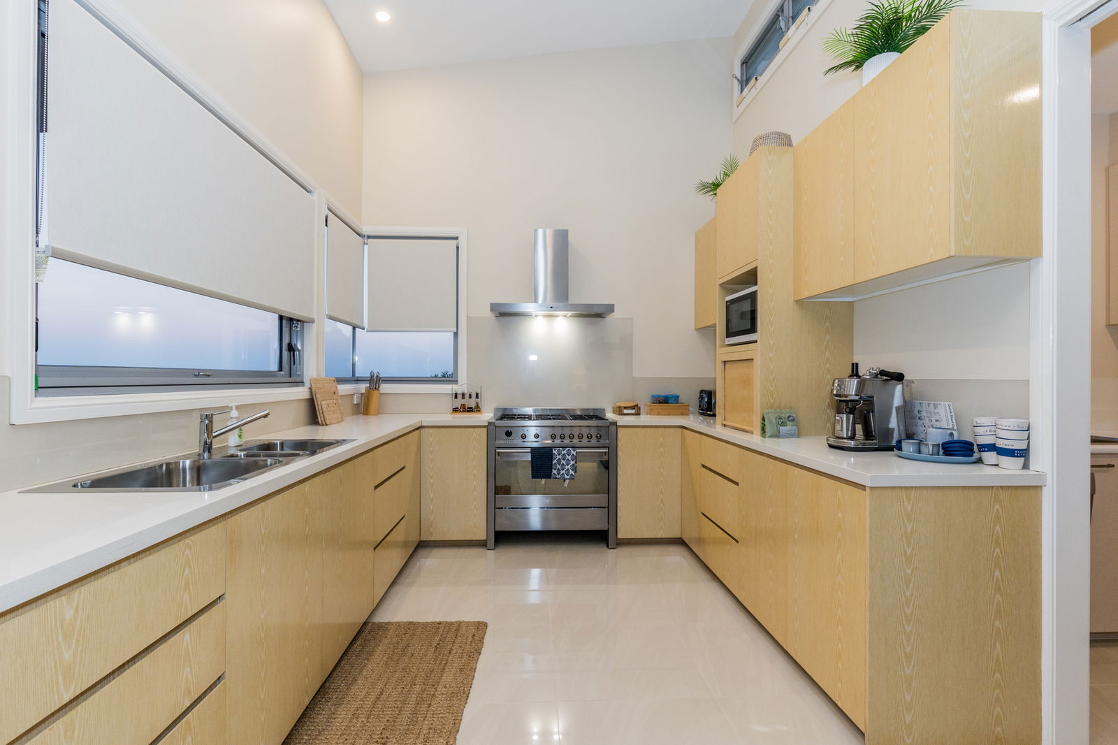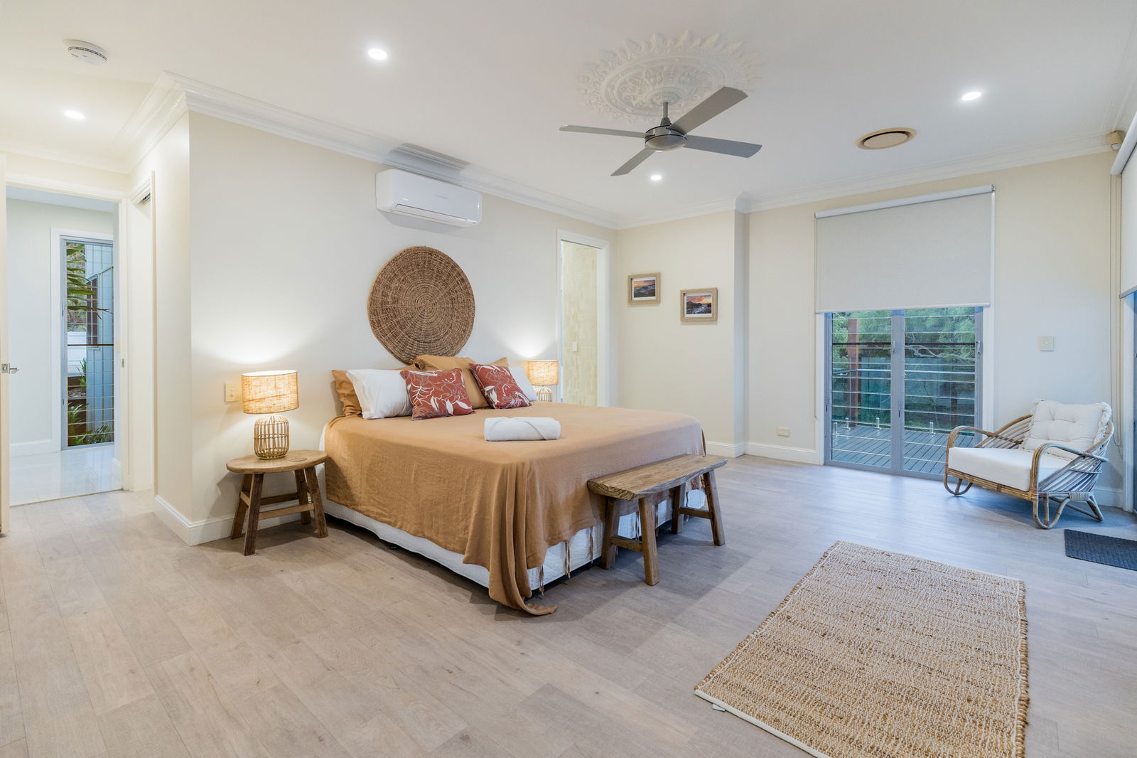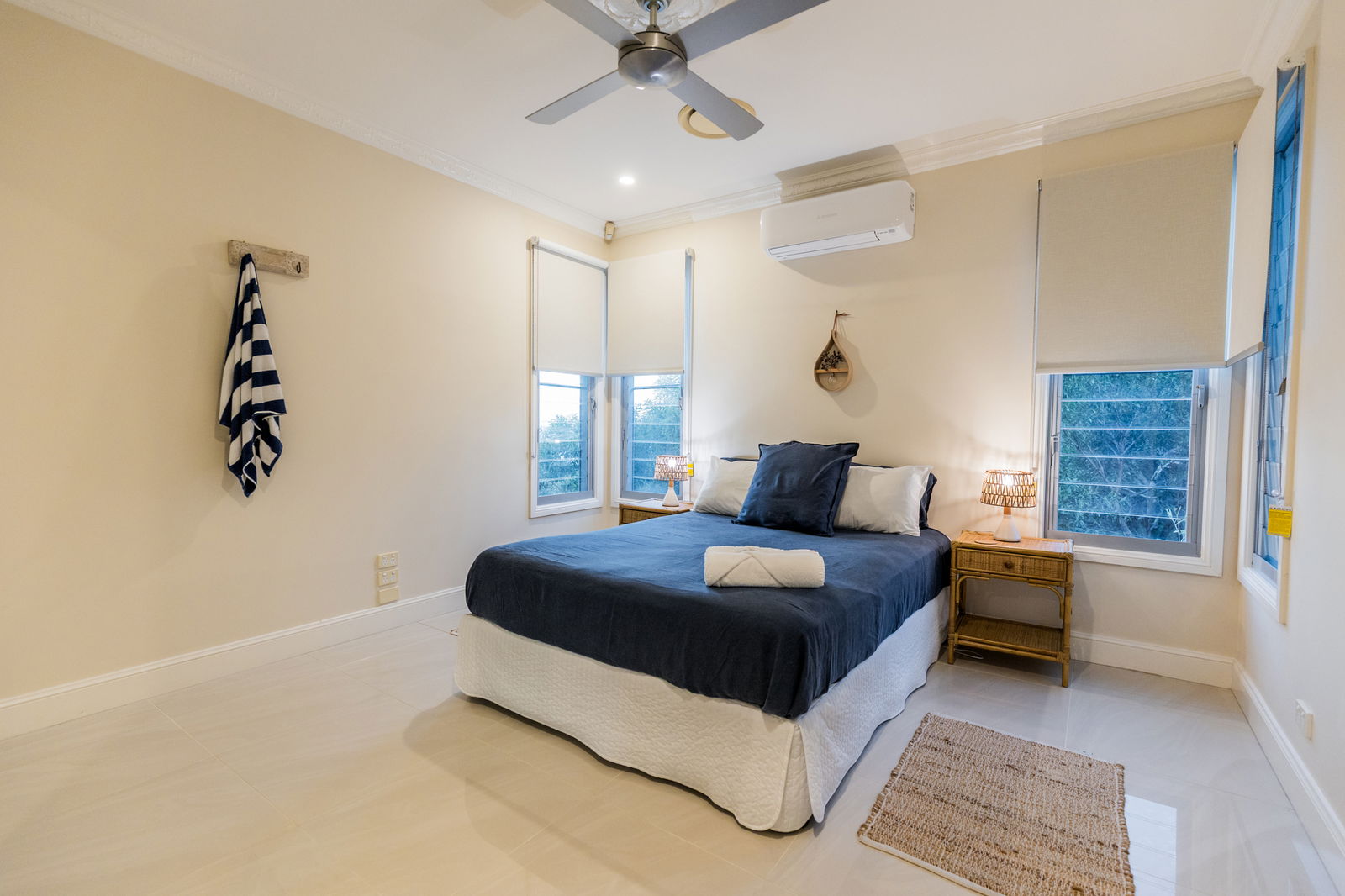 Designed for effortless living, the home features low-maintenance landscaping with automated irrigation, an outdoor shower, and a double lock-up garage with generous storage. The home is air-conditioned throughout and benefits from exceptional natural ventilation through banks of louvres, allowing cooling ocean breezes to flow through the home and often requiring little or no use of the air conditioning.