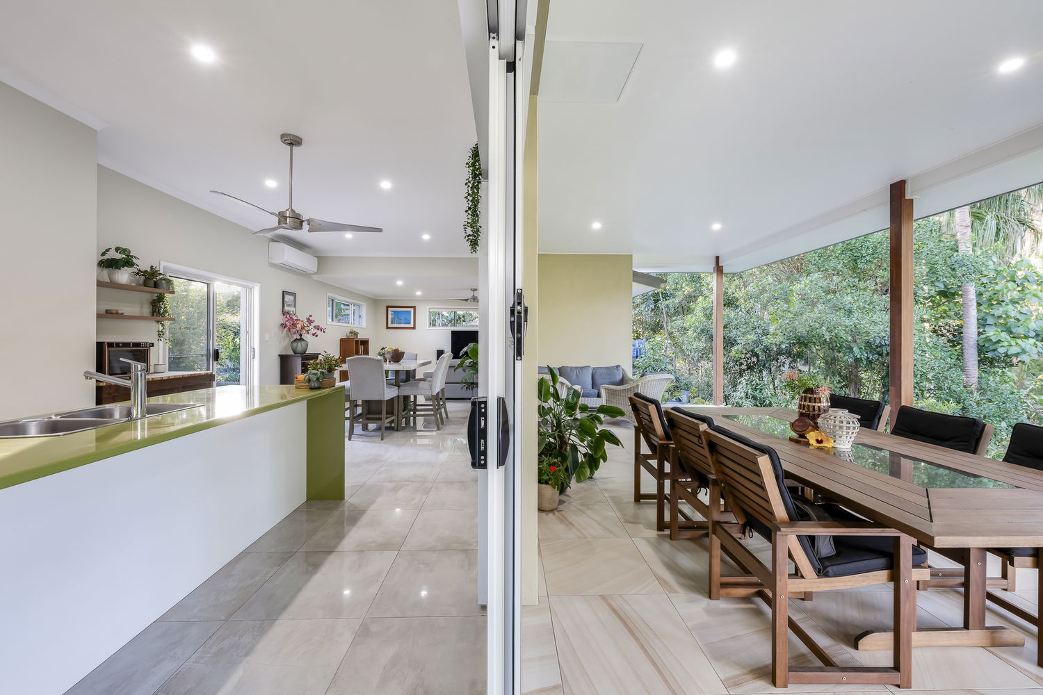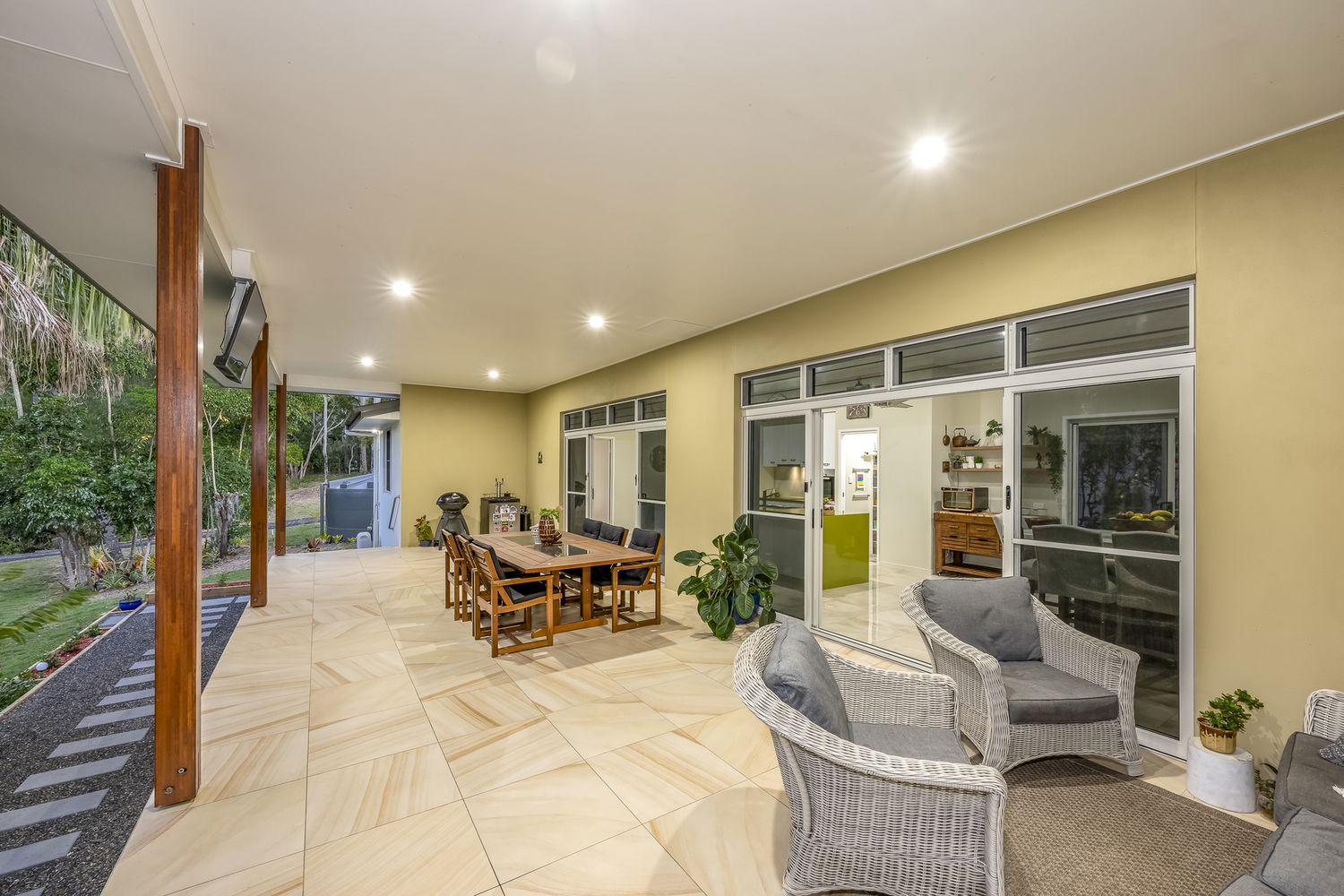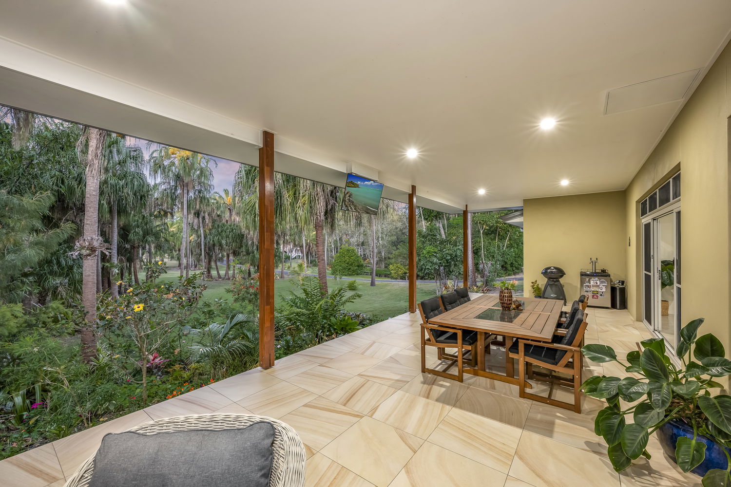 - 12m x 6m undercover entertaining terrace with sandstone-look tiles, framed by picturesque garden outlooks