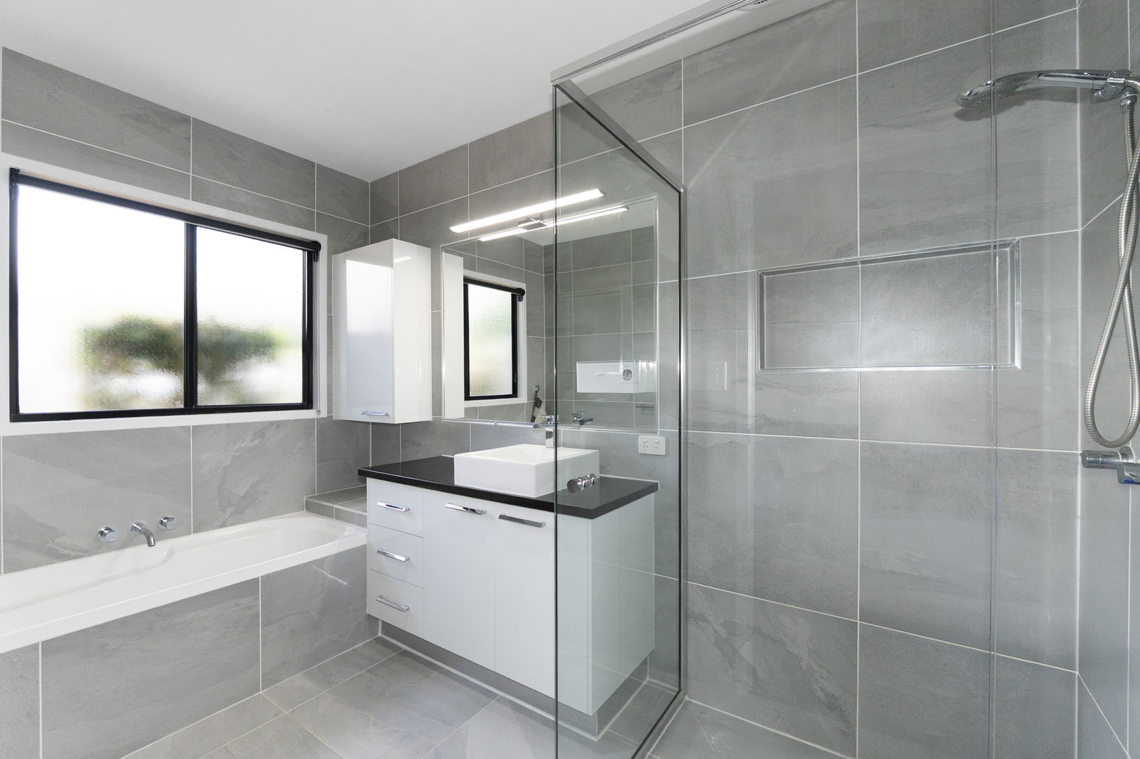 - Fully tiled main bathroom offering a large walk-in corner shower, separate bathtub, and central vanity, serving the additional bedrooms with style; the toilet is separate for added convenience
