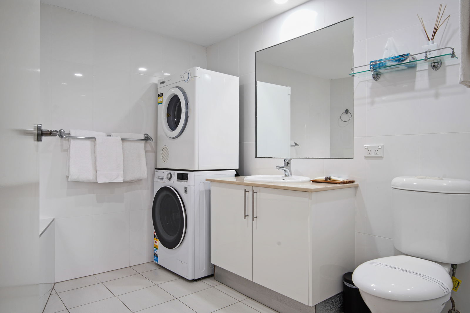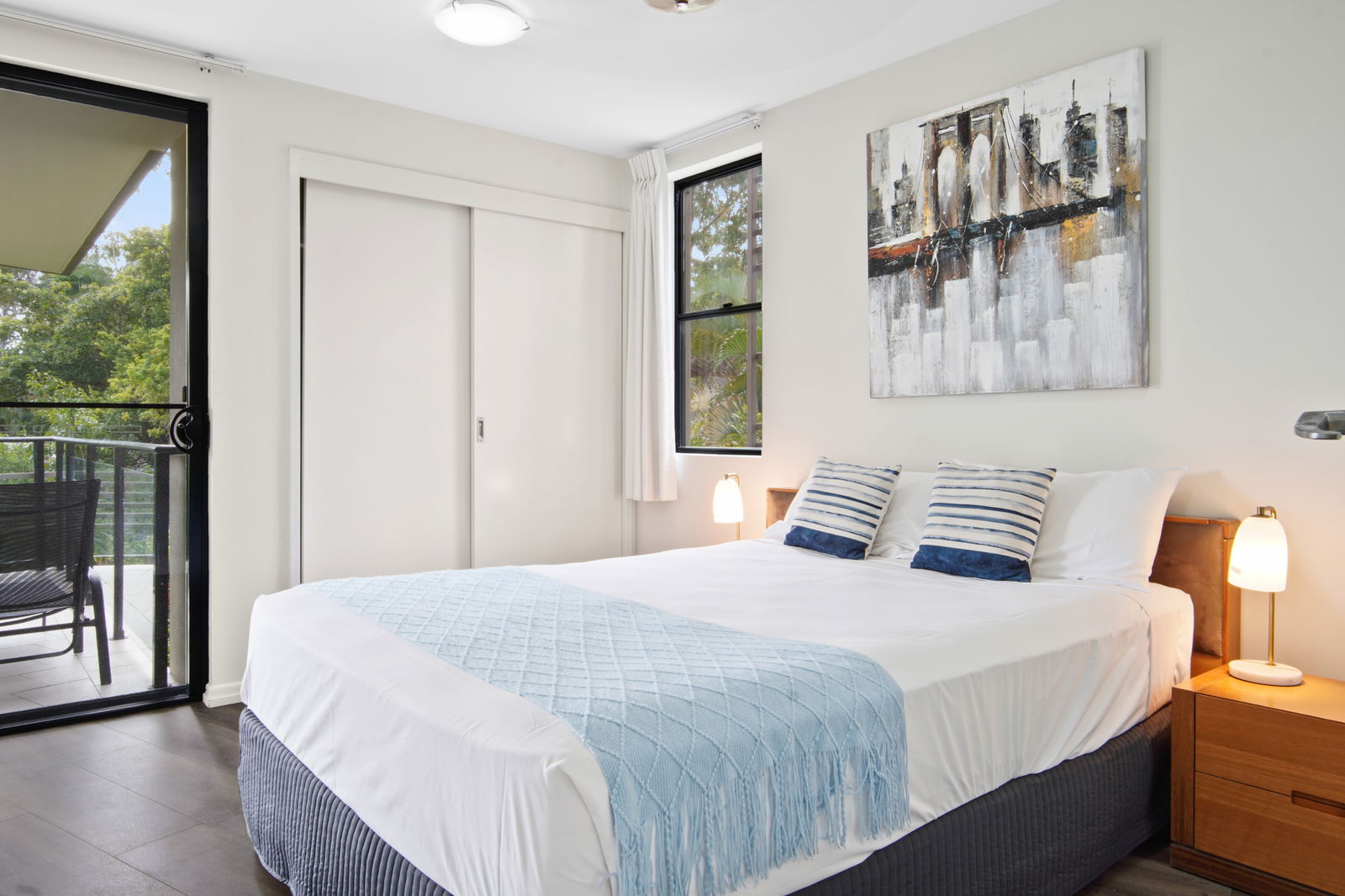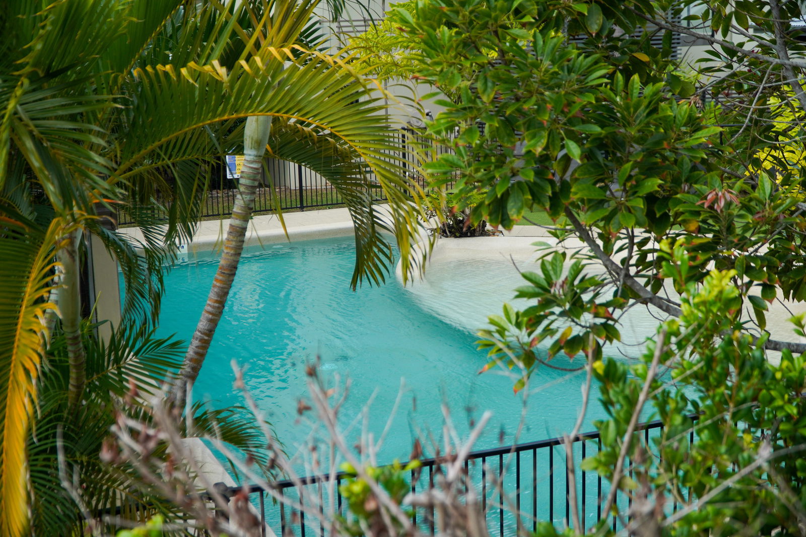 The master bedroom is a standout, with floorboards, a built-in robe, and glass doors leading to the balcony. Wake up to pool views through large windows and enjoy the convenience of an ensuite bathroom, laundry facilities, and ample storage.