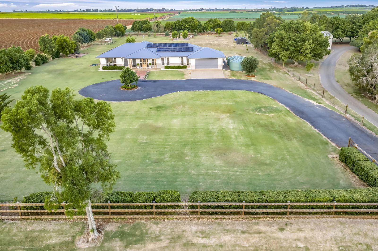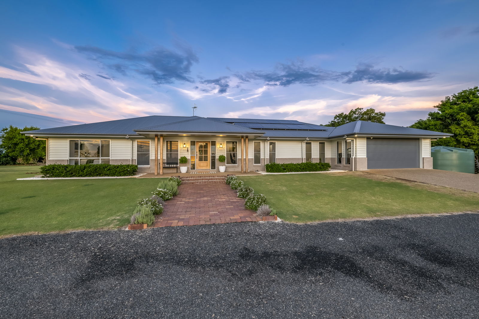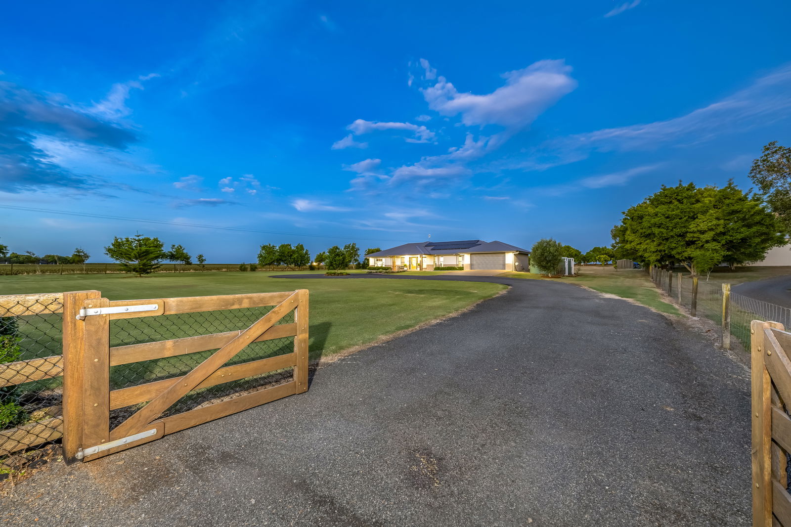 Privately positioned behind automatic timber gates and framed by a fully fenced boundary, the home makes a striking first impression with its circular asphalt driveway, Colourbond roof, timber panelling, brick façade and classic homestead posts.