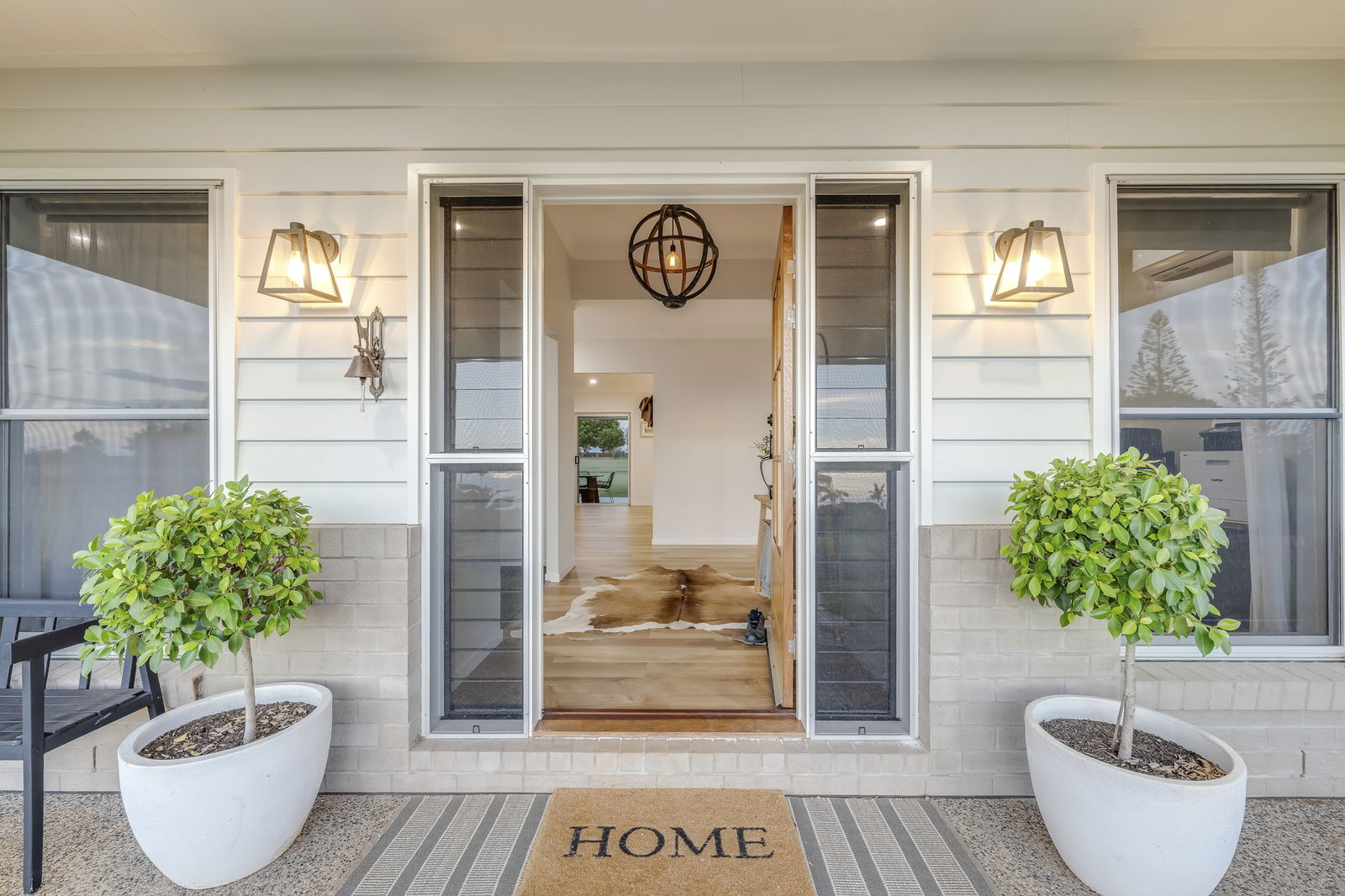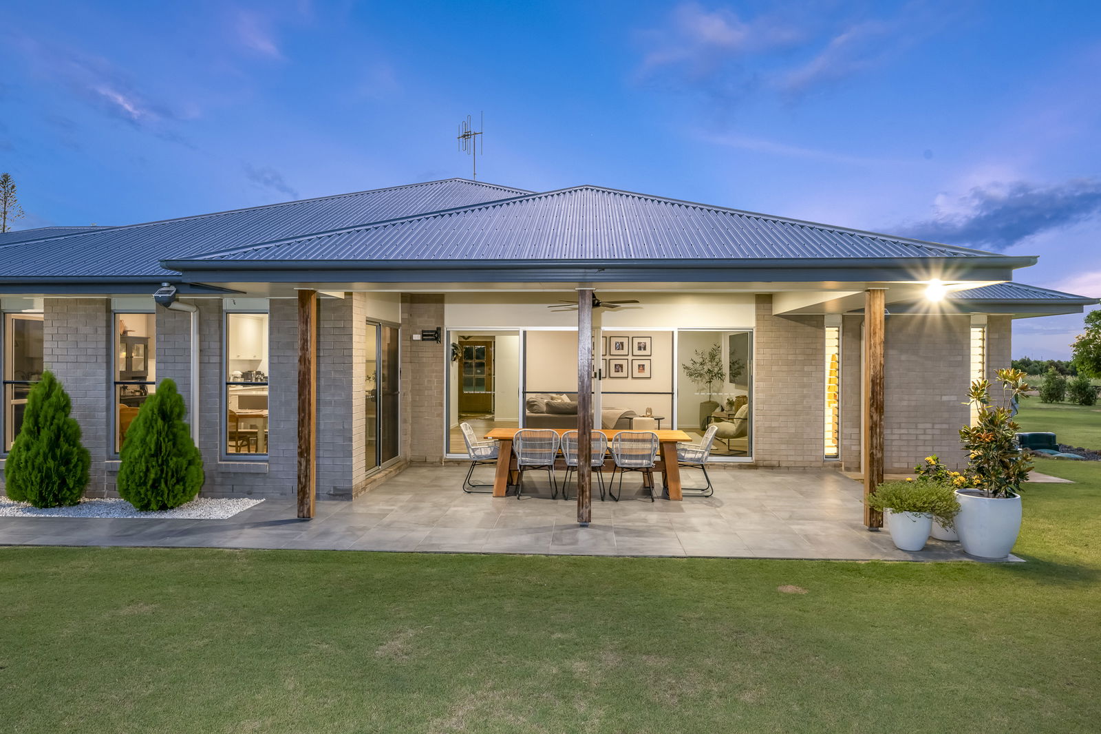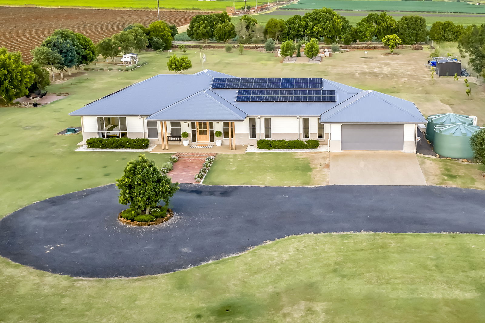Privately positioned behind automatic timber gates and framed by a fully fenced boundary, the home makes a striking first impression with its circular asphalt driveway, Colourbond roof, timber panelling, brick façade and classic homestead posts.