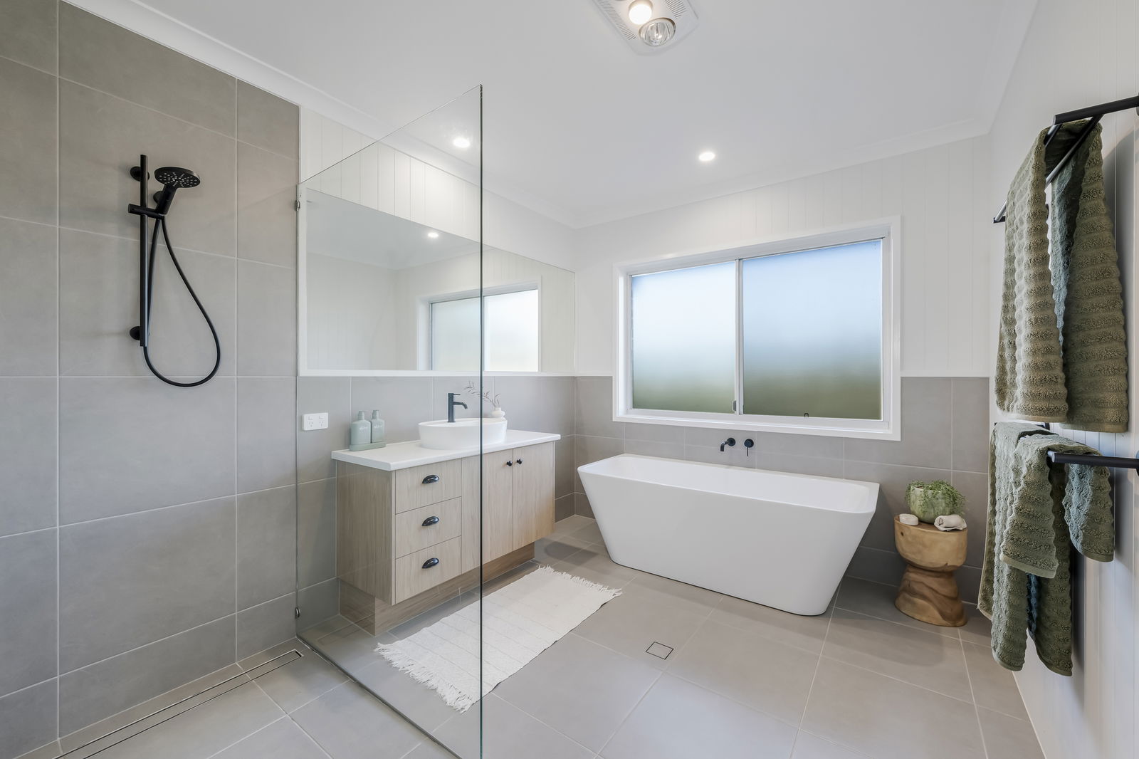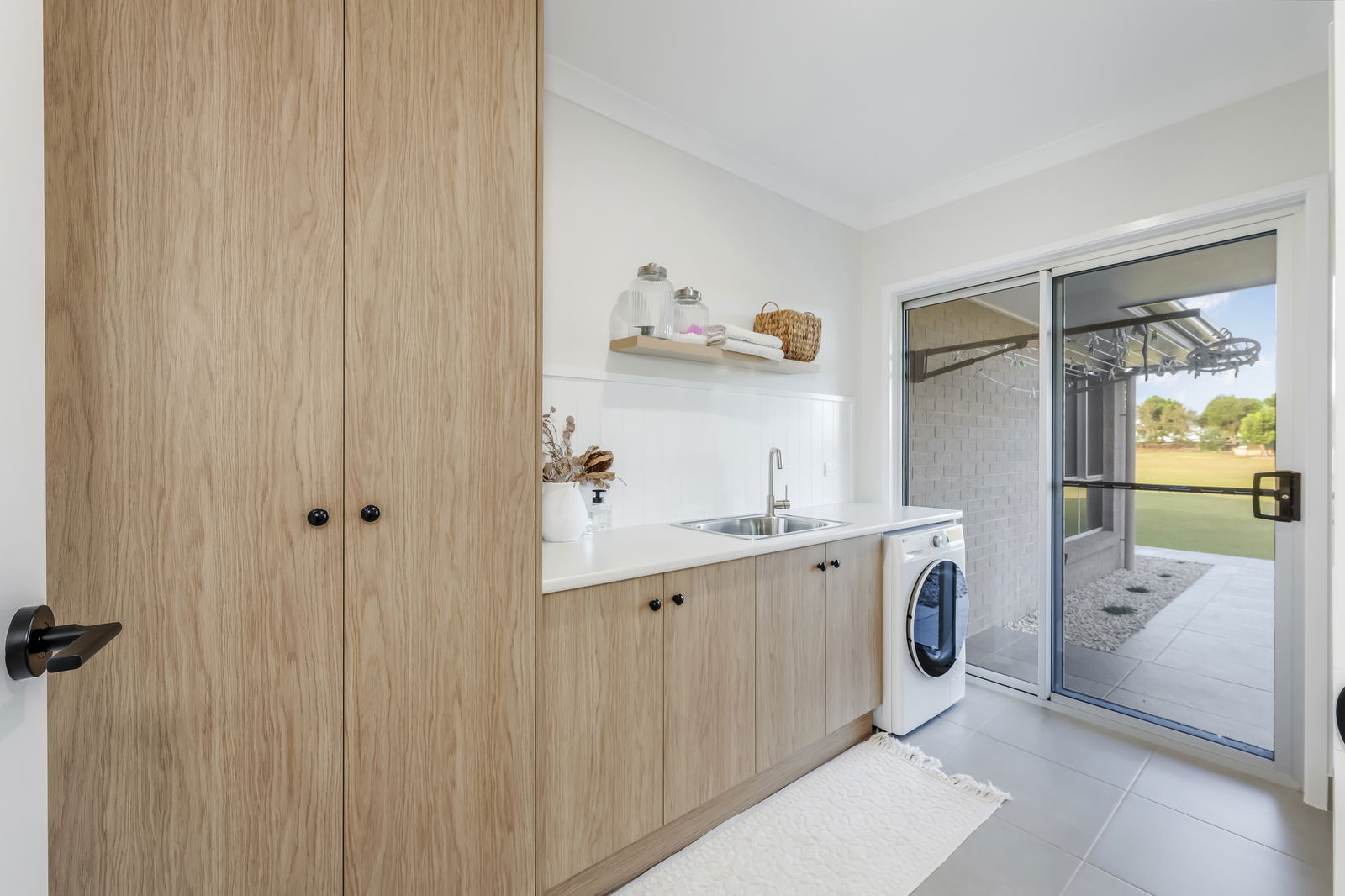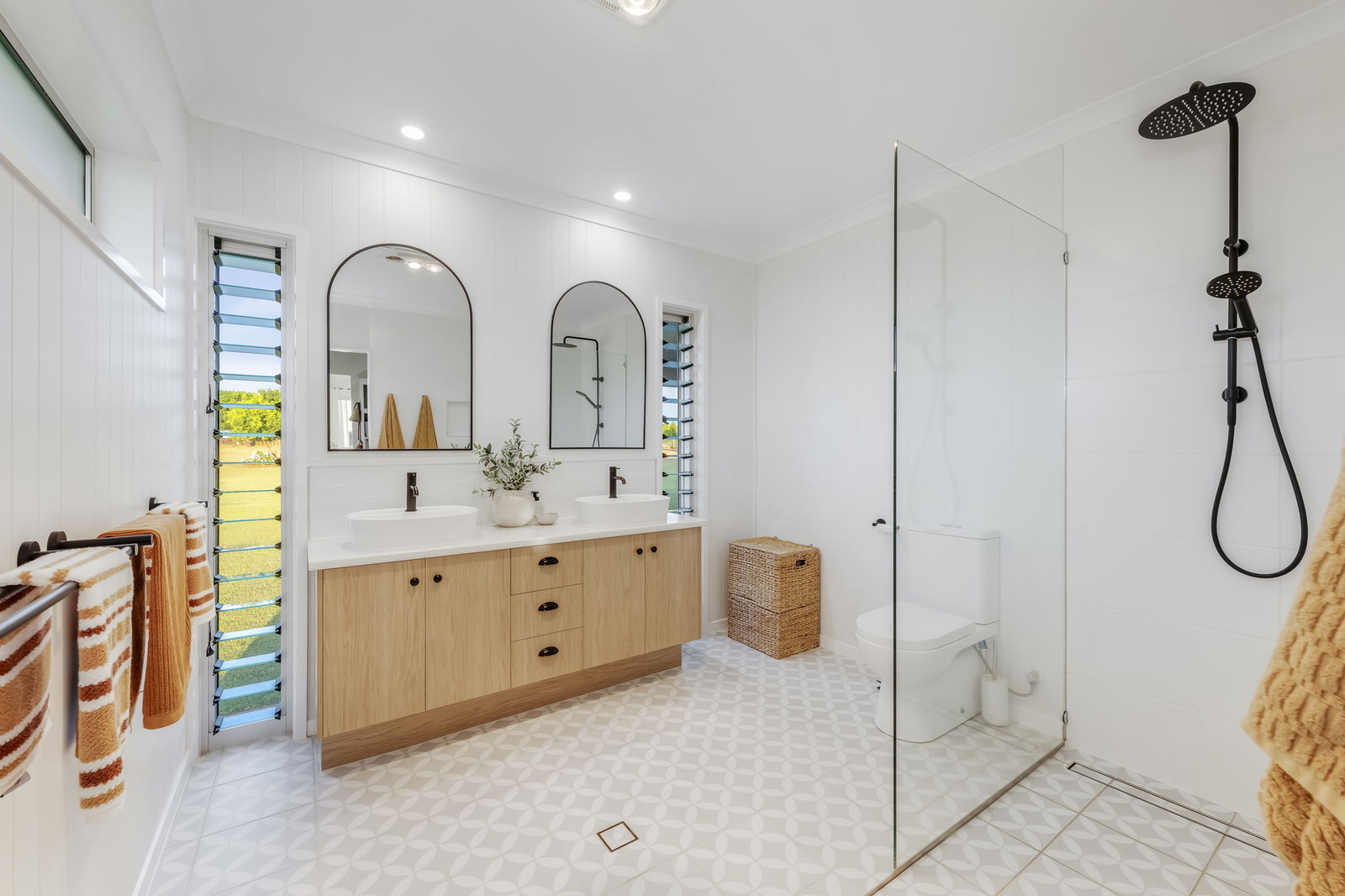 • Striking Moroccan-style feature tiles and black tapware