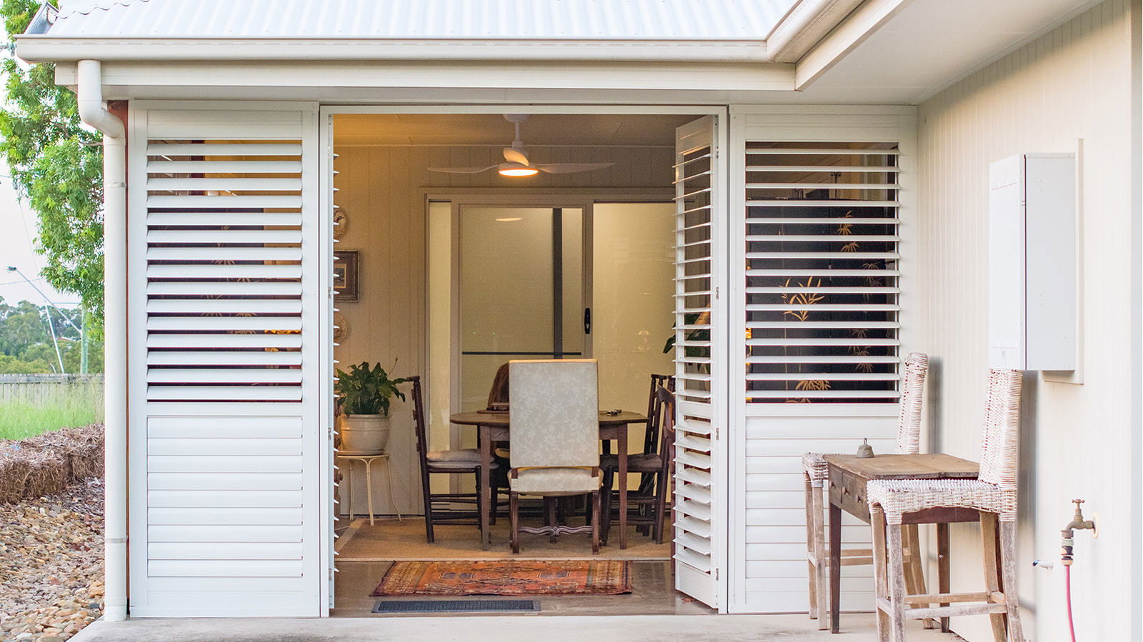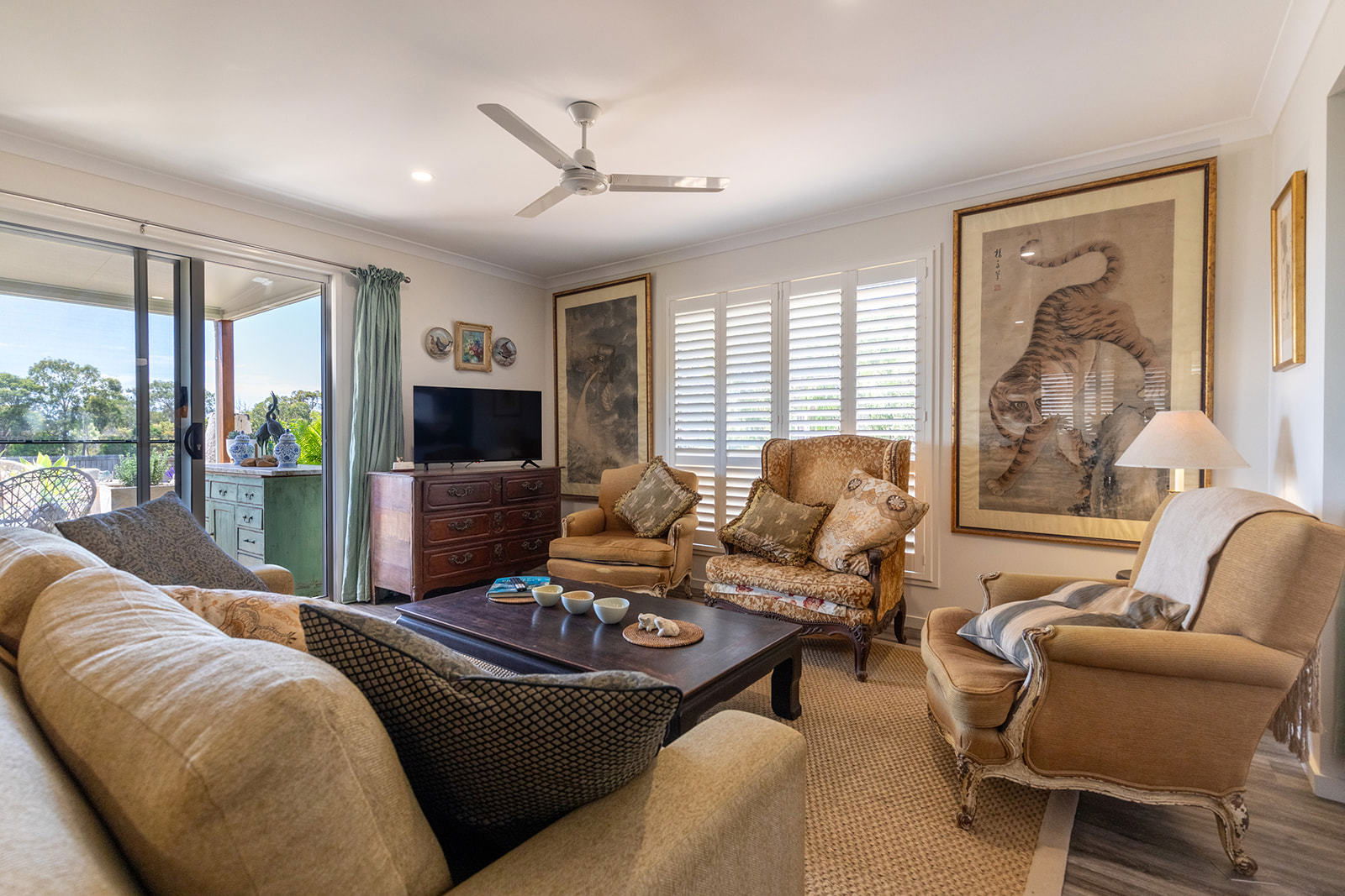 Inside, the home is filled with natural light and character, featuring plantation shutters throughout. The living areas flow seamlessly to two patios, perfect for morning coffee, casual entertaining, or simply enjoying the peaceful surroundings.