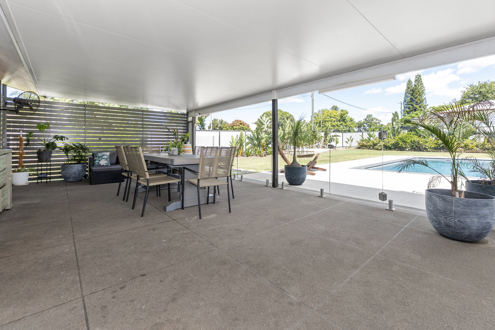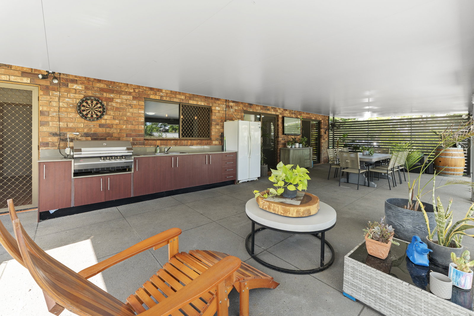 * Undercover entertaining area with outdoor kitchen, inbuilt barbecue, and sink - looking out over the pool, established gardens, and the full depth of the backyard beyond