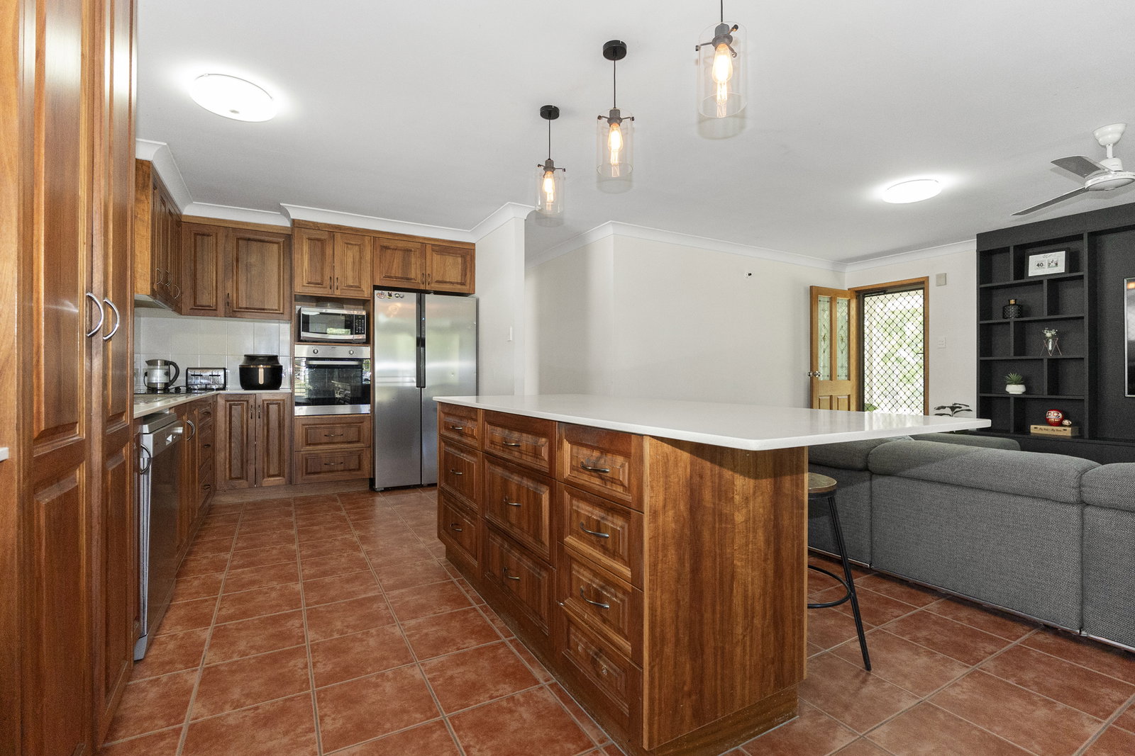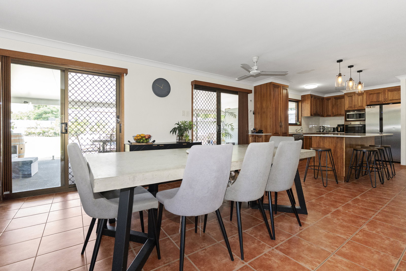 From the living room windows, the Burnett River stretches out before you - a view that shifts with the seasons and never gets old. The open-plan living and dining space creates the kind of room that naturally draws a family together. It flows seamlessly into the entertaining area that overlooks the pool, gardens, and the full expanse of the backyard. This is a home that was built for living in - and it shows.