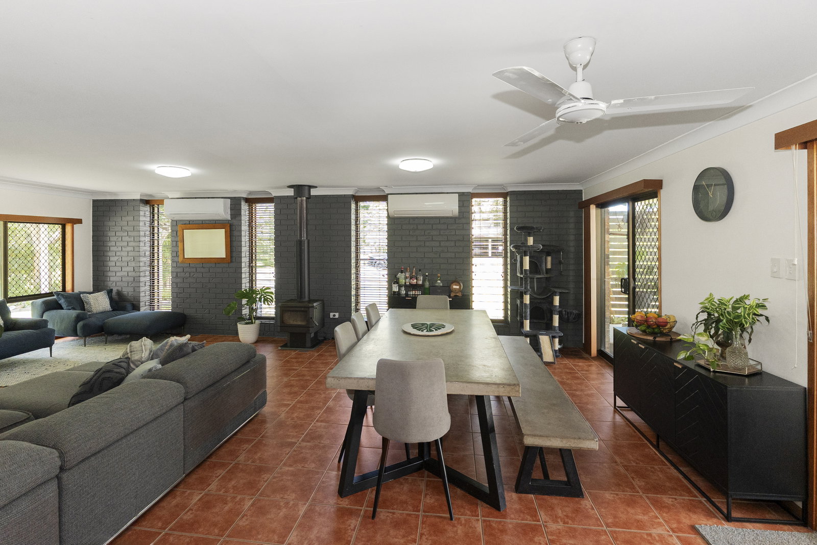 * Air-conditioned open-plan living and dining with Burnett River views through the living room windows - anchored by a fireplace and flowing naturally toward the entertaining area and outdoors