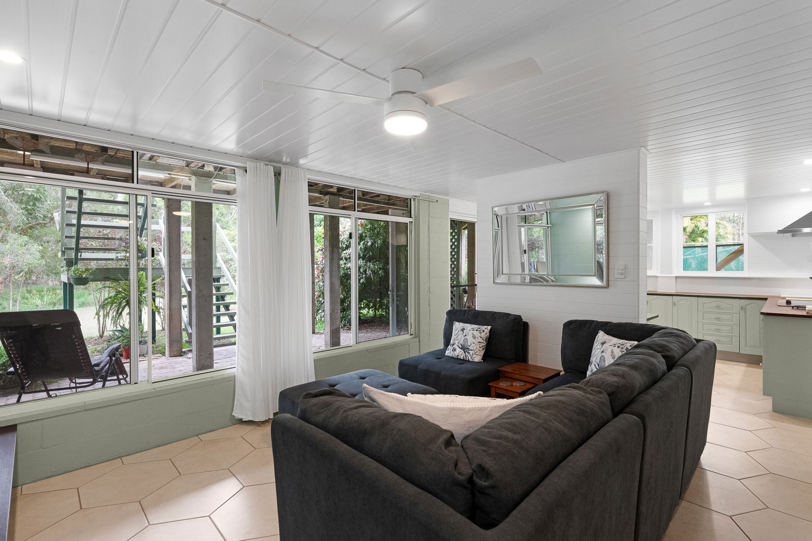 -Established gardens including 2 Kauri Pines, bougainvillea, jacaranda, hibiscus, frangepani, 15 varieties of fruit trees and a kitchen garden.