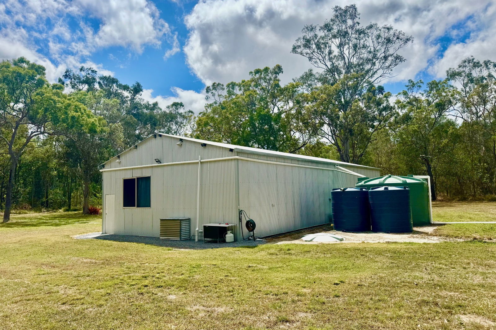 A private gravel driveway leads to an impressive 20m x 9m (approx.) insulated four-bay shed, featuring three high-clearance roller doors, a self-contained bathroom with flushing toilet and running water, and a solar power system with battery storage. With three water tanks (approx. 30,000L total), you're set up for off-grid living from day one.