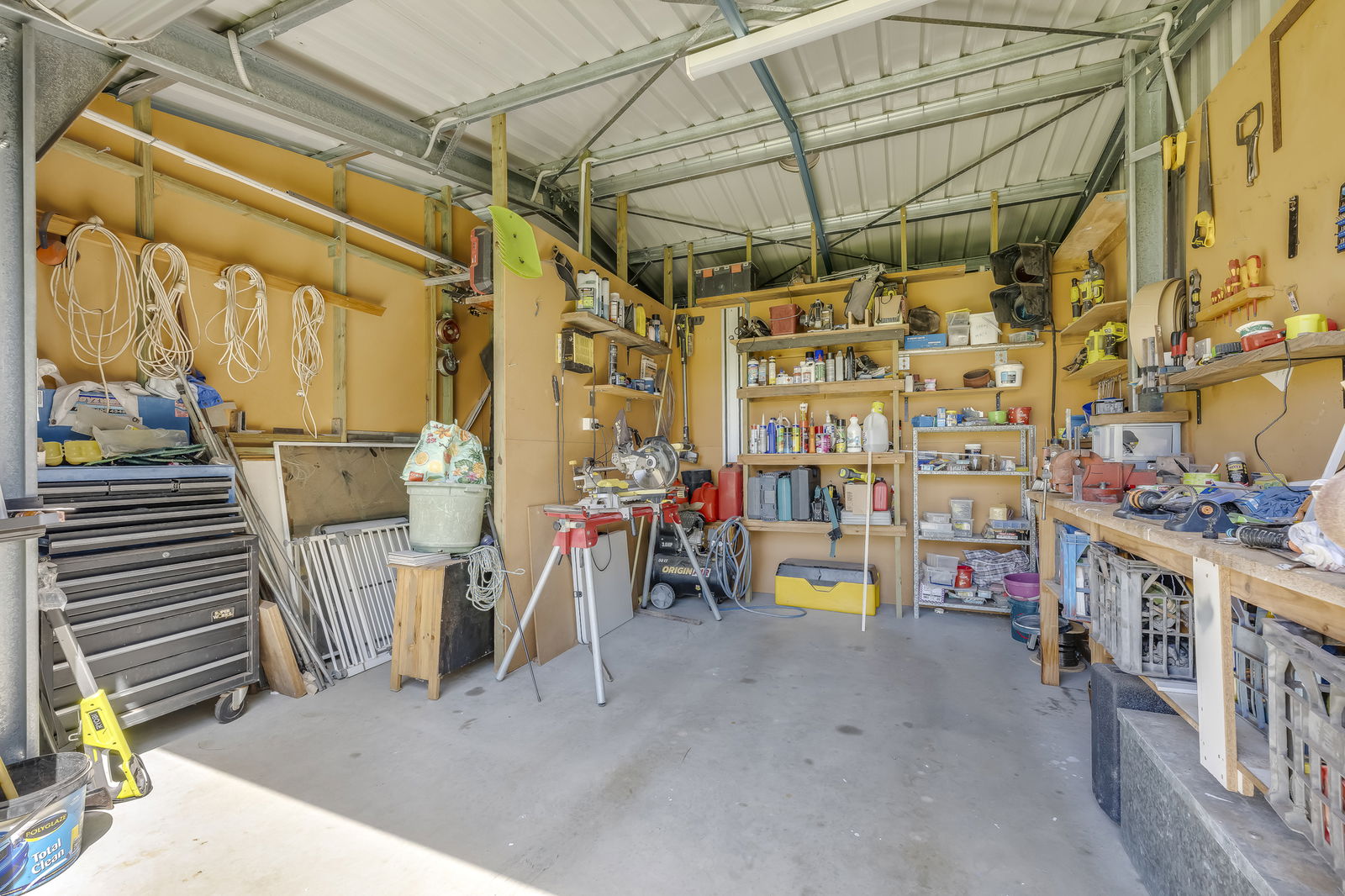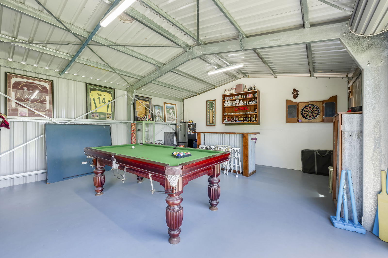 - One bay converted to an entertaining space with pool table and overlooking the fire pit
