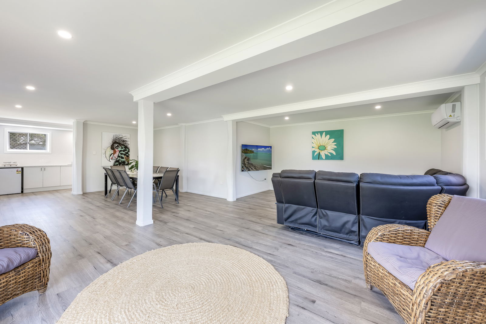- Large open-plan lounge, dining, and living space with air-conditioning