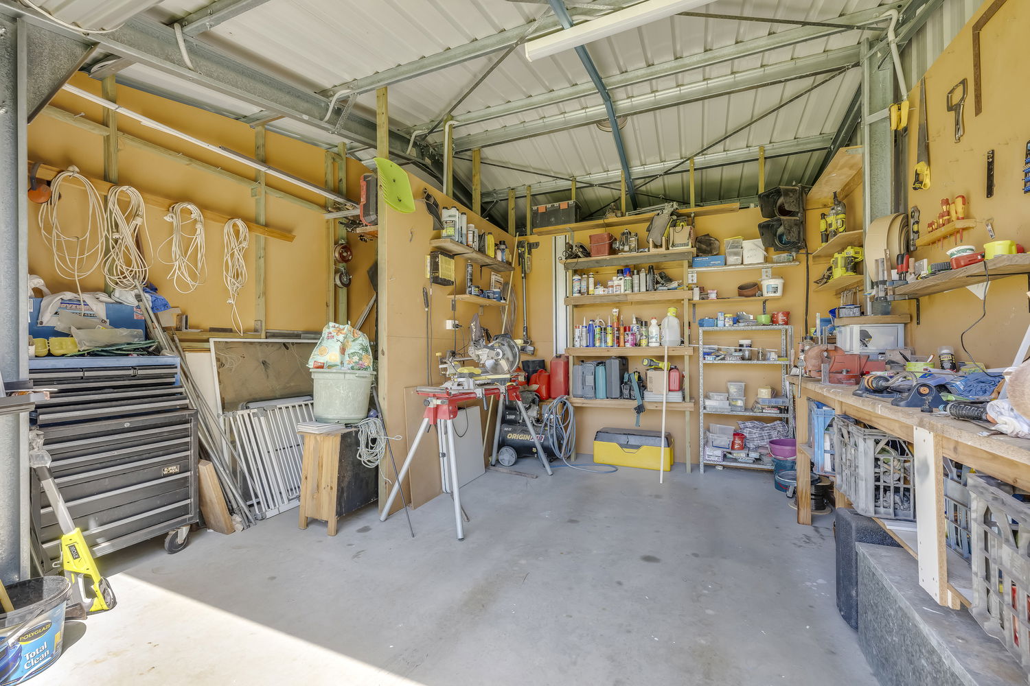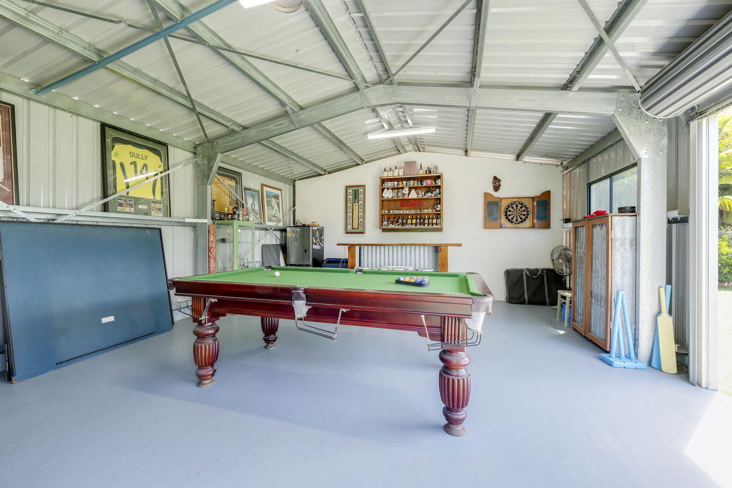 - One bay converted to an entertaining space with pool table and overlooking the fire pit