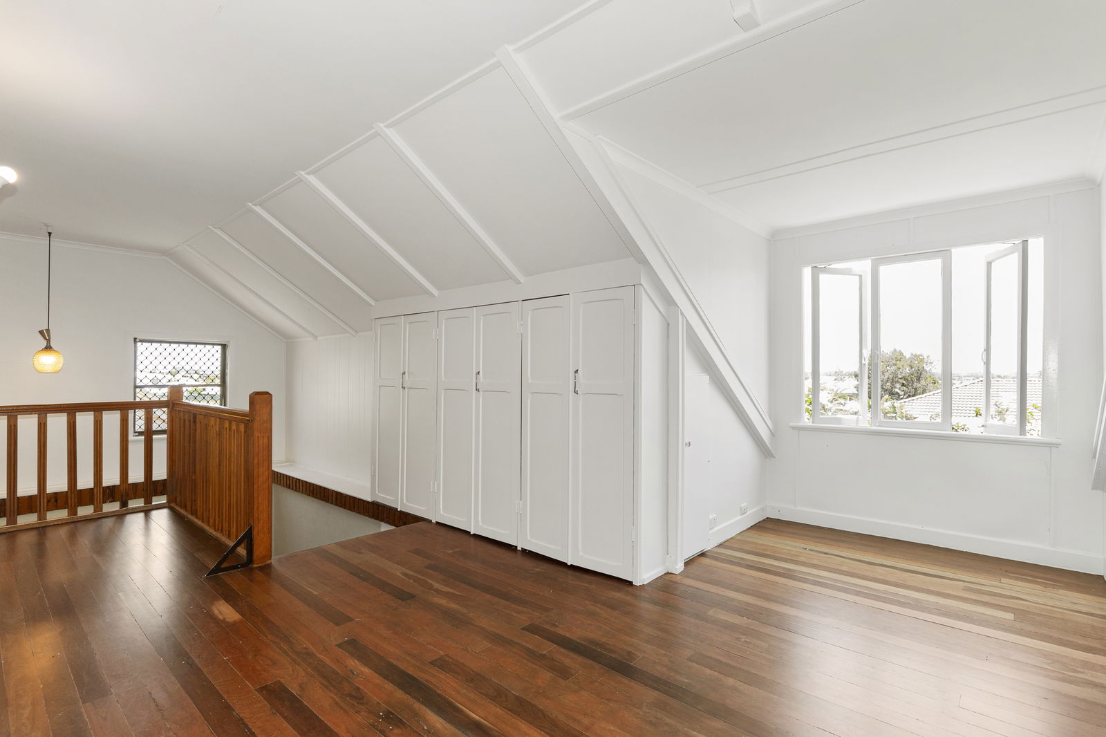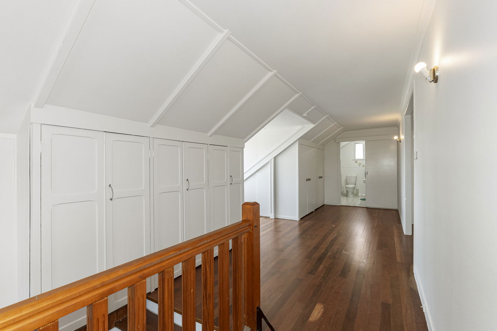 • Striking large timber staircase ascending to a hardwood landing with vaulted ceiling, plentiful storage, and a bay window that drenches the space in sunlight