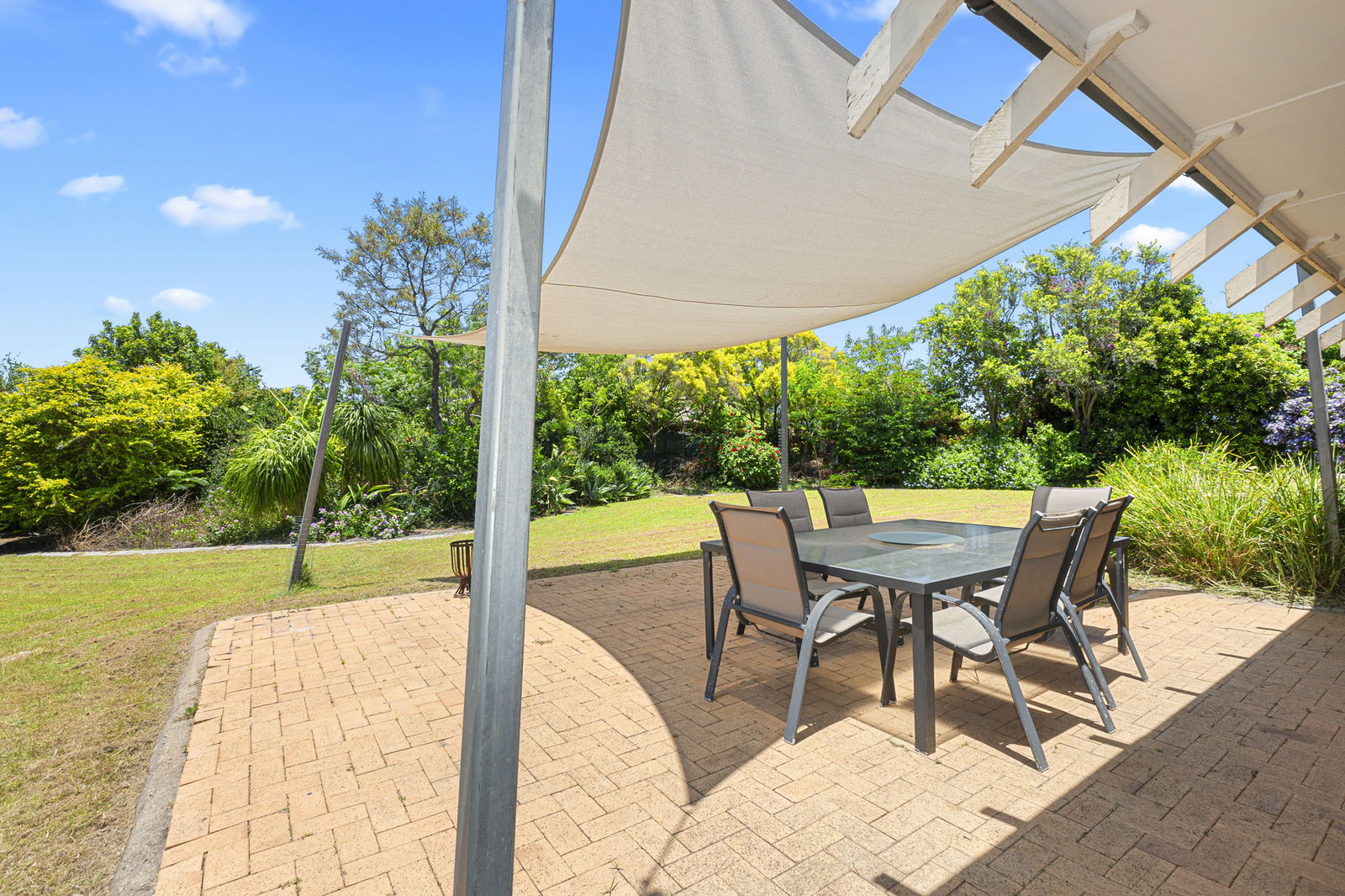 • Shade sail-covered paved patio gazing out over a expansive backyard alive with gardens, forming a serene outdoor oasis for unwinding or playful moments