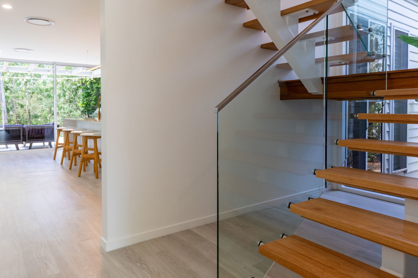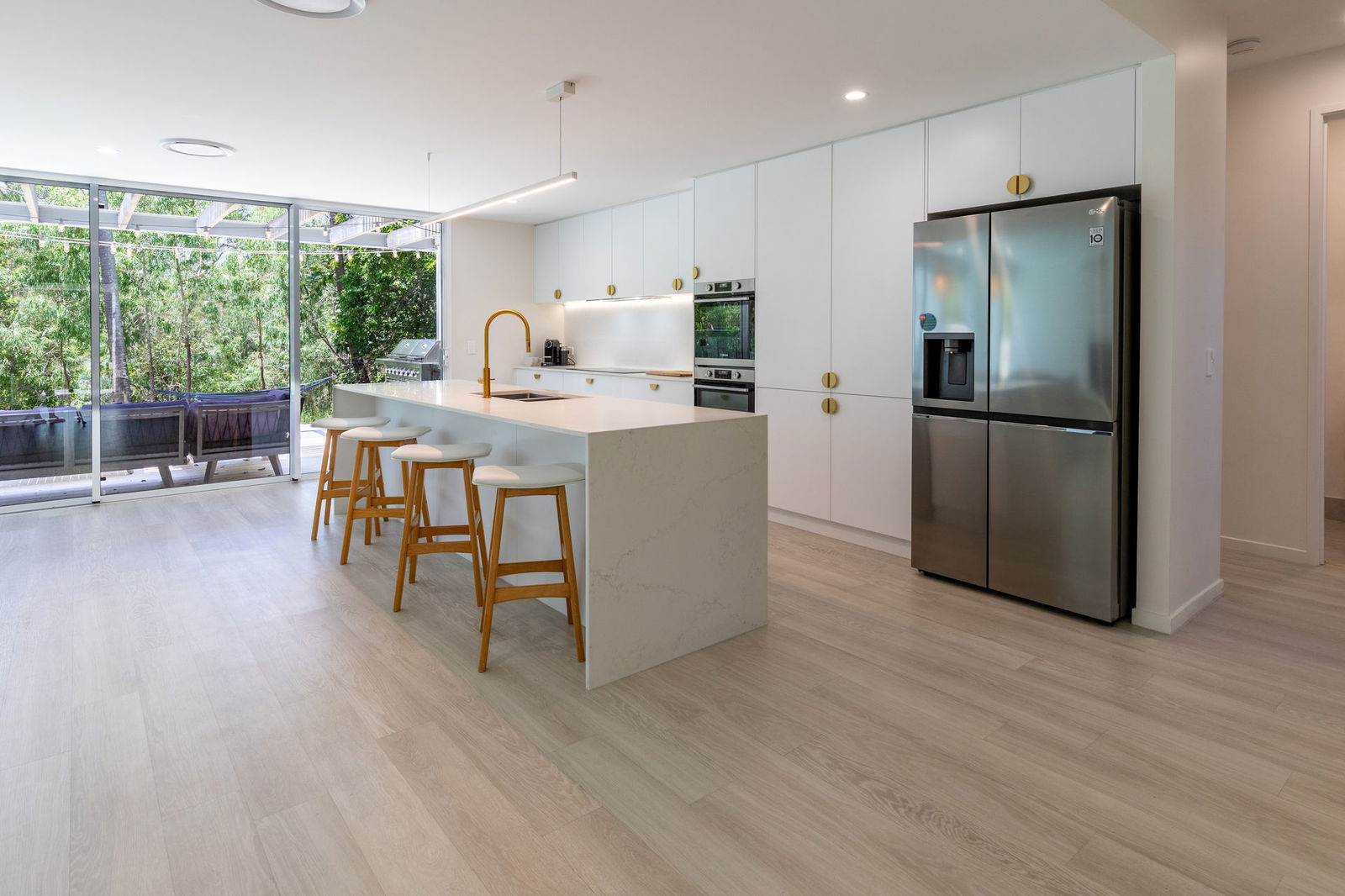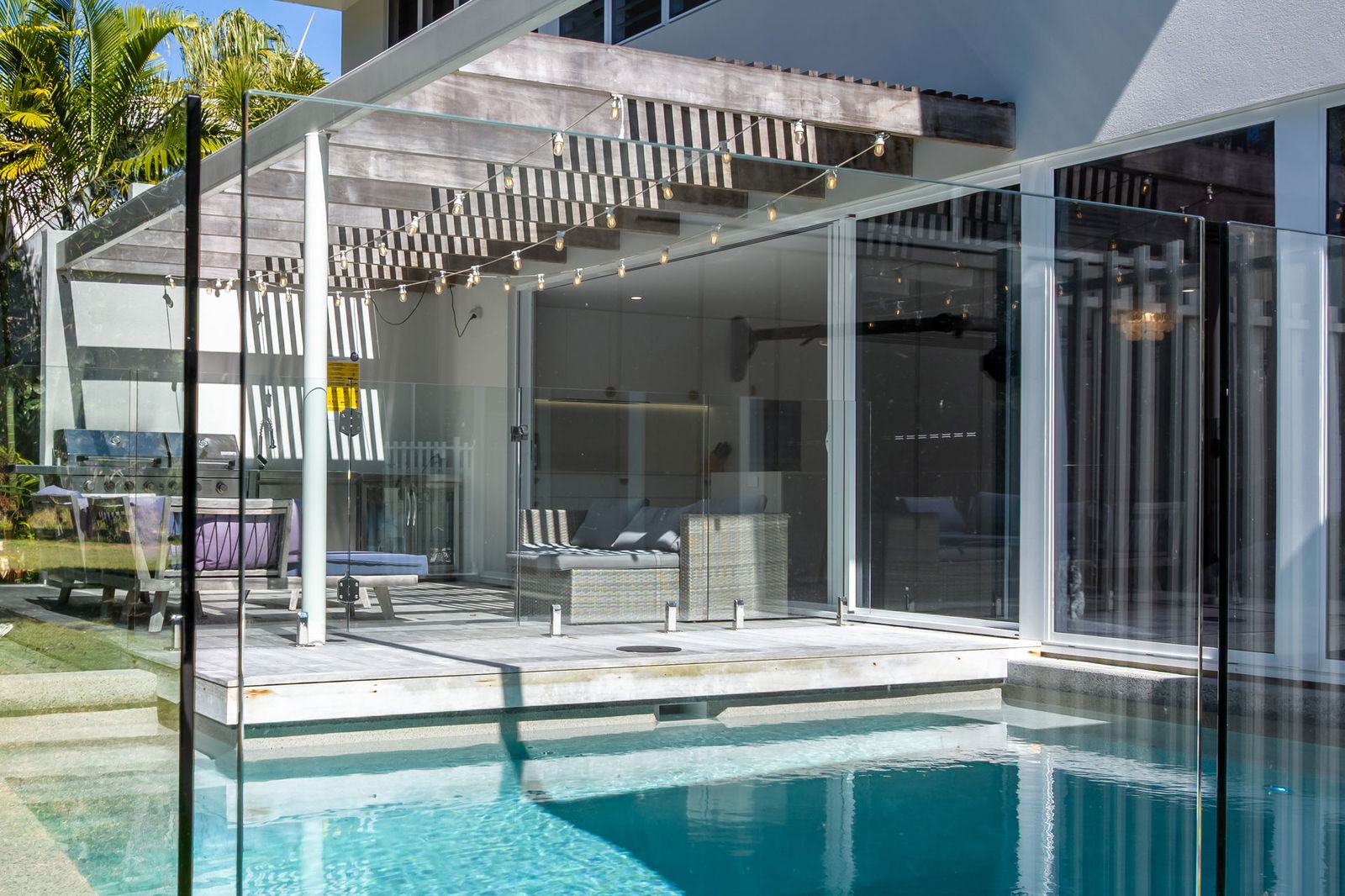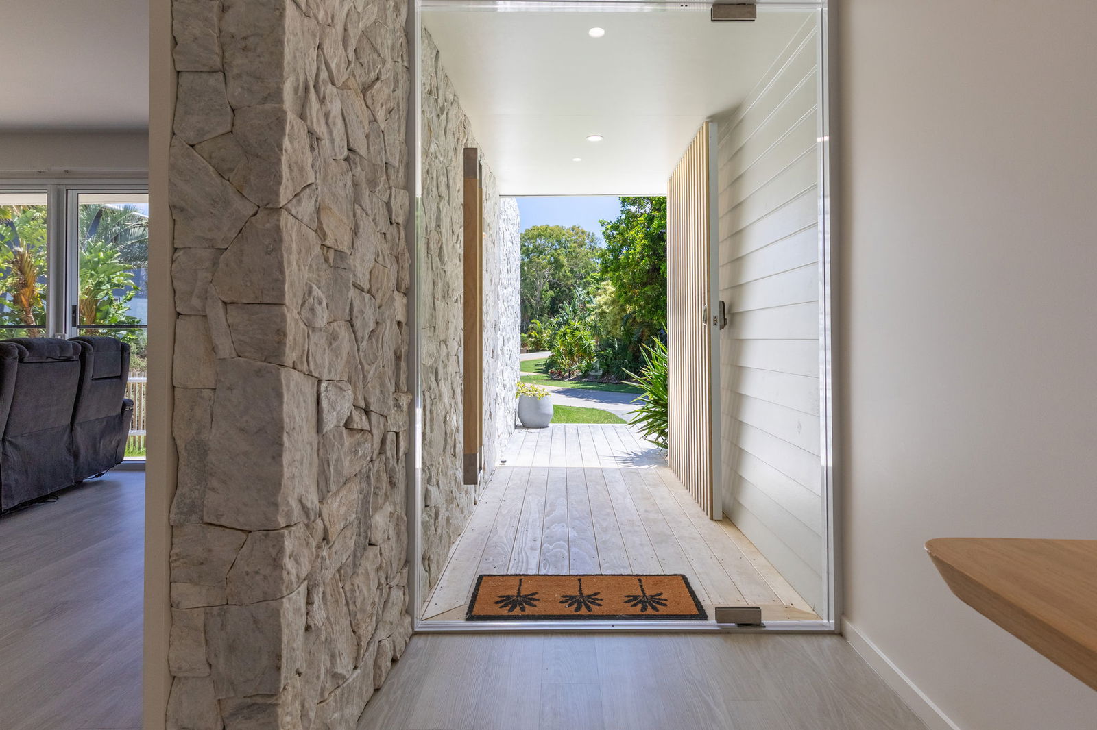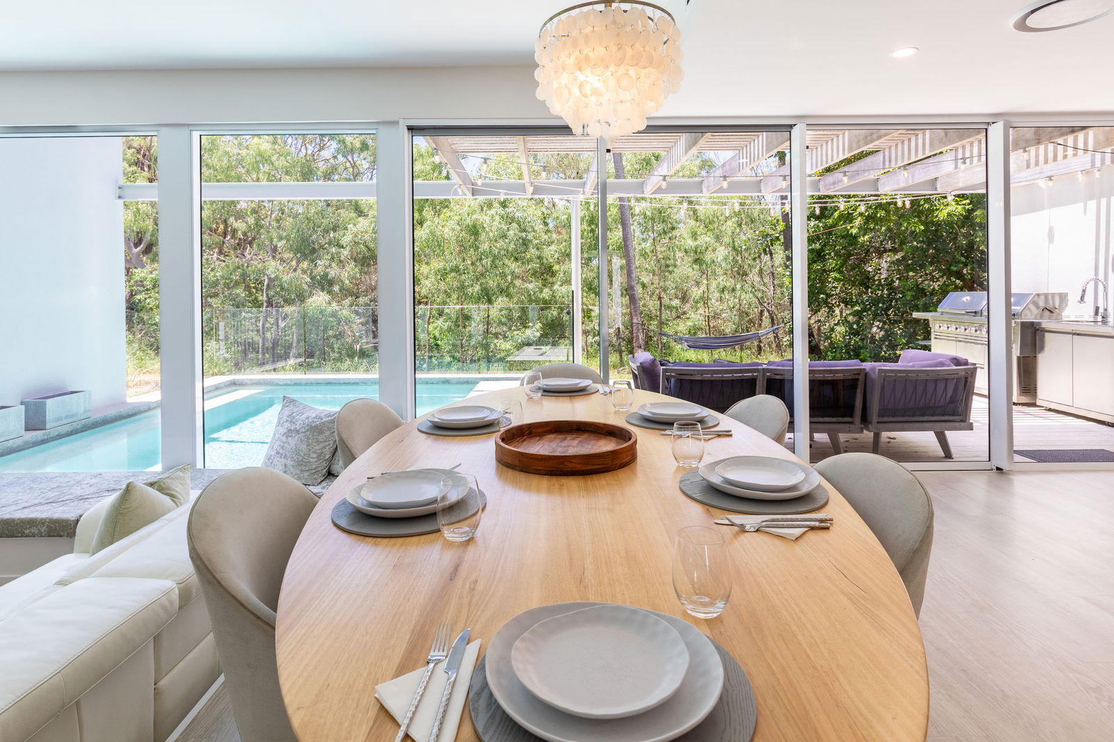 From its striking quartz crystal stone feature walls, the Accoya timber decks, to the dramatic sunken lounge with formed seating, crystal clear plunge pool, the home radiates sophisticated design layered with tactile luxury. Designer furnishings by Nick Scali further enhance the interiors.