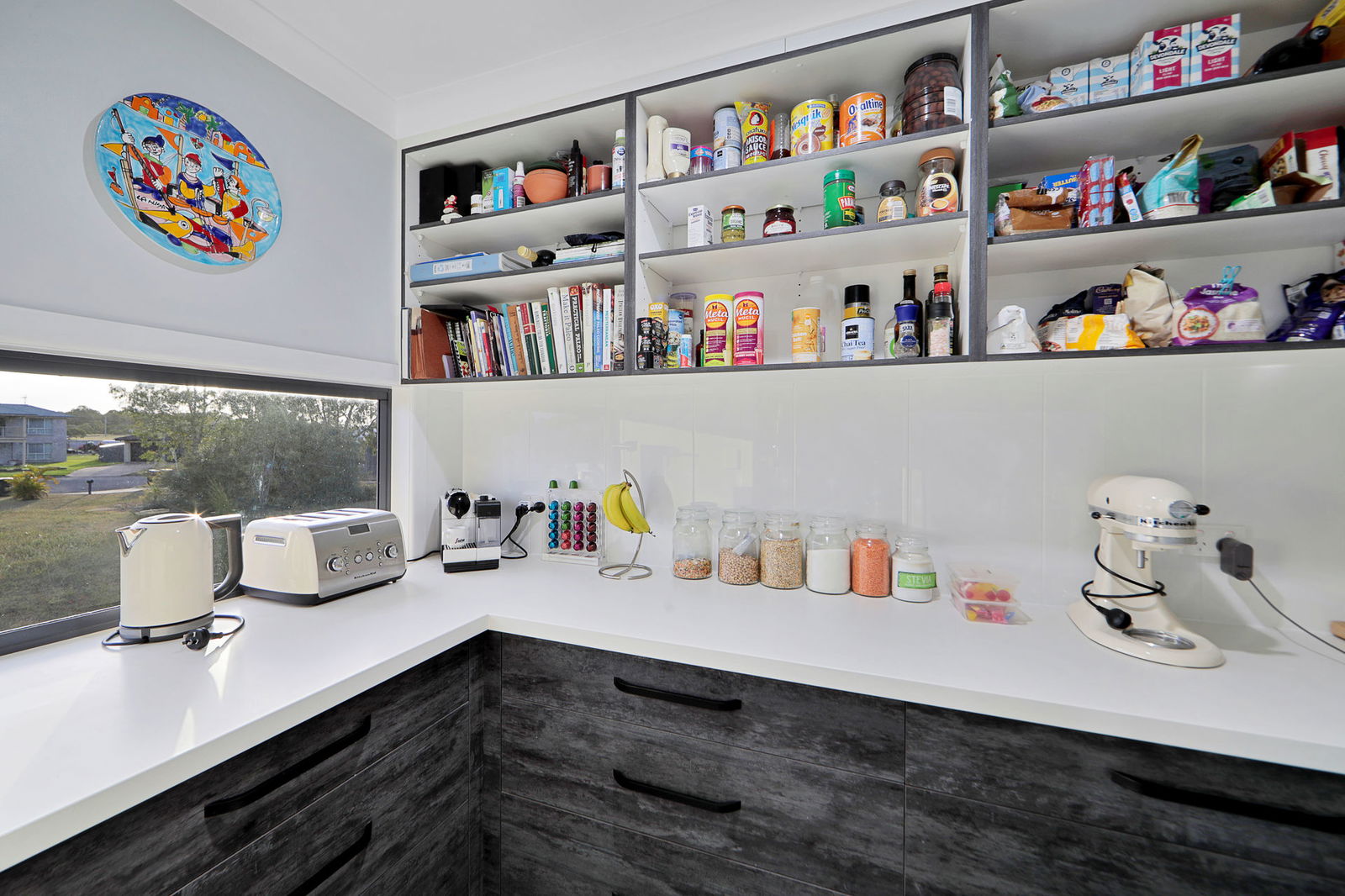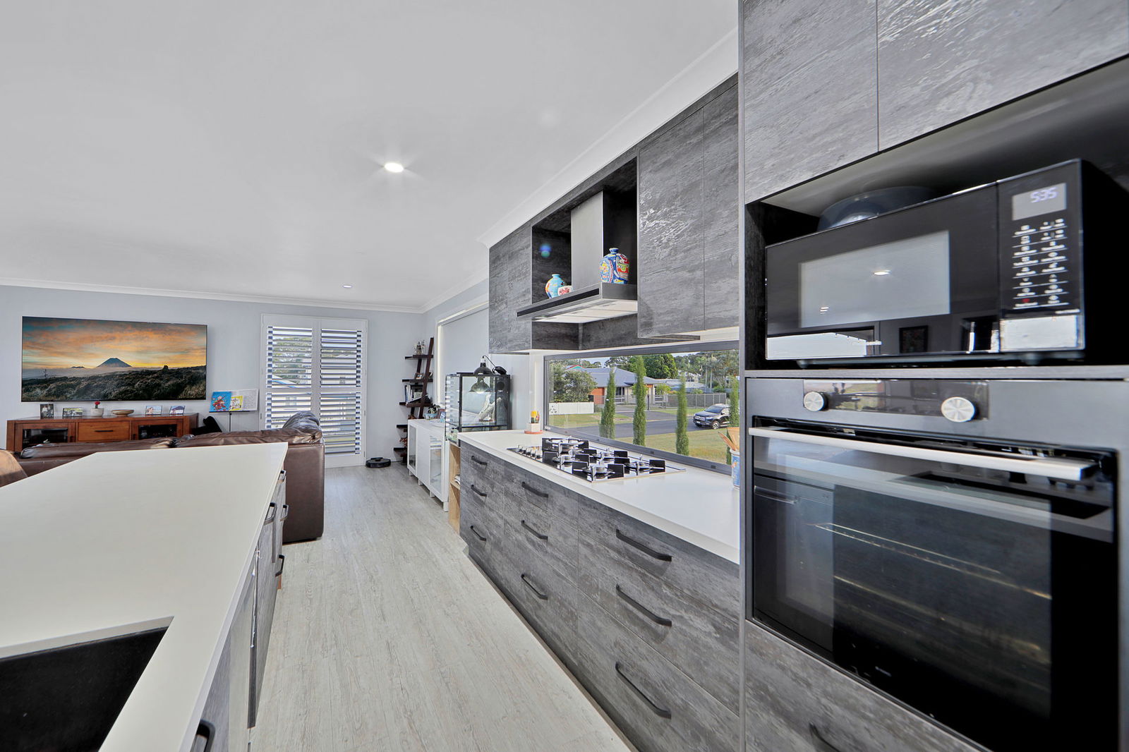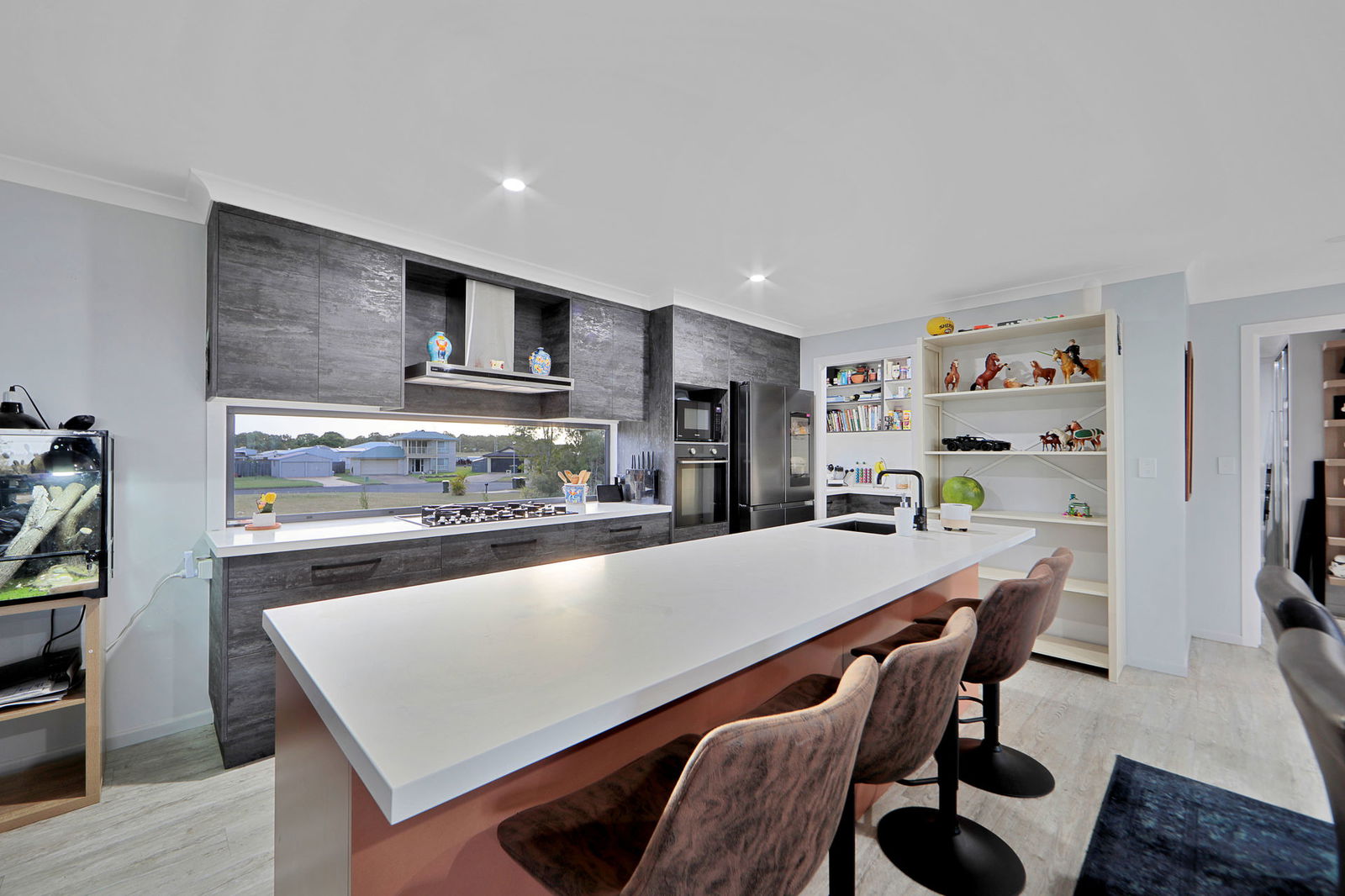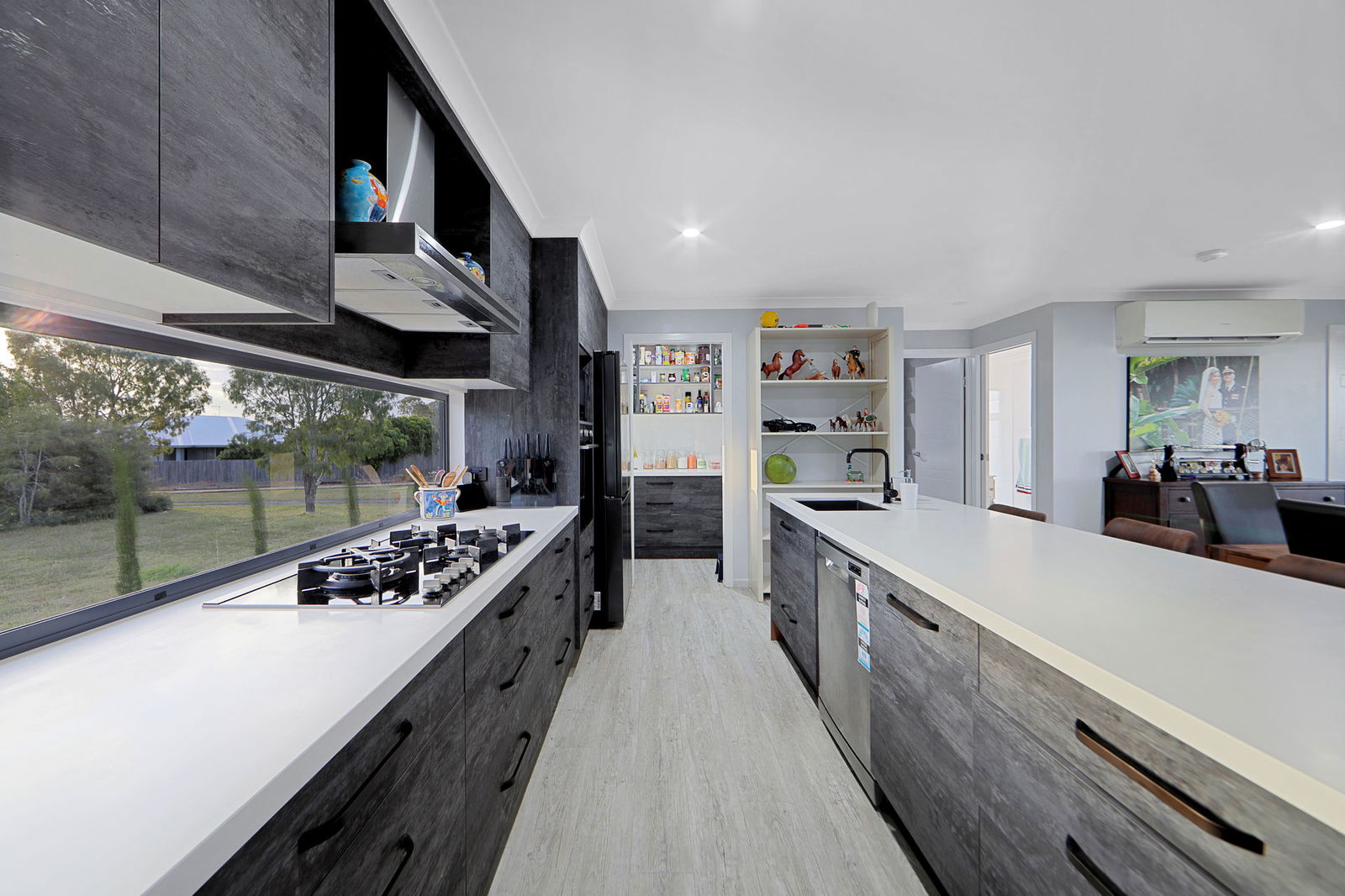 The gourmet kitchen is both stylish and functional, featuring stone benchtops, an oversized gas cooktop, quality appliances, glass splashbacks, soft-close cabinetry, and a well-appointed butler's pantry.