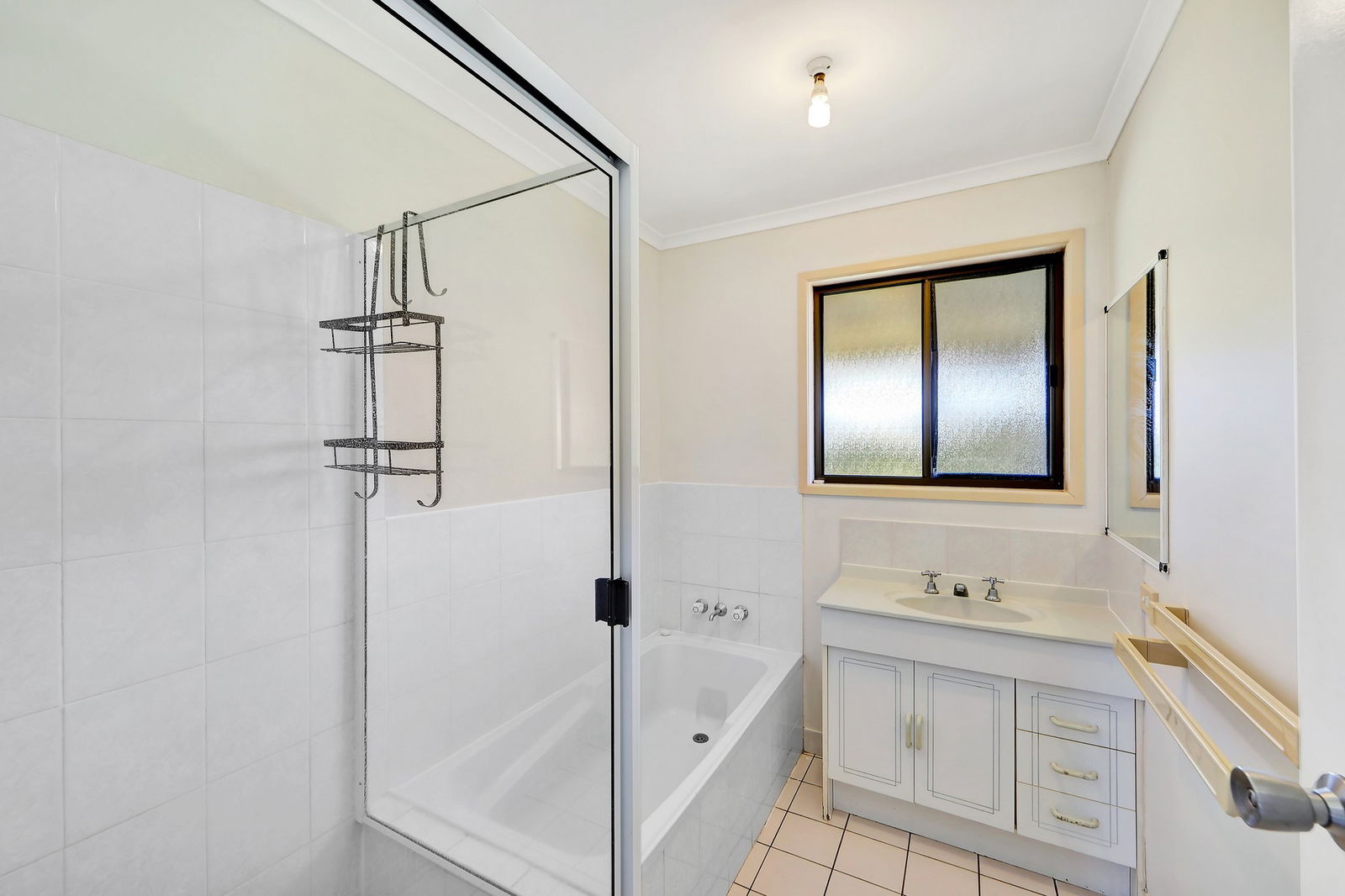 - Main bathroom with both shower and bathtub.