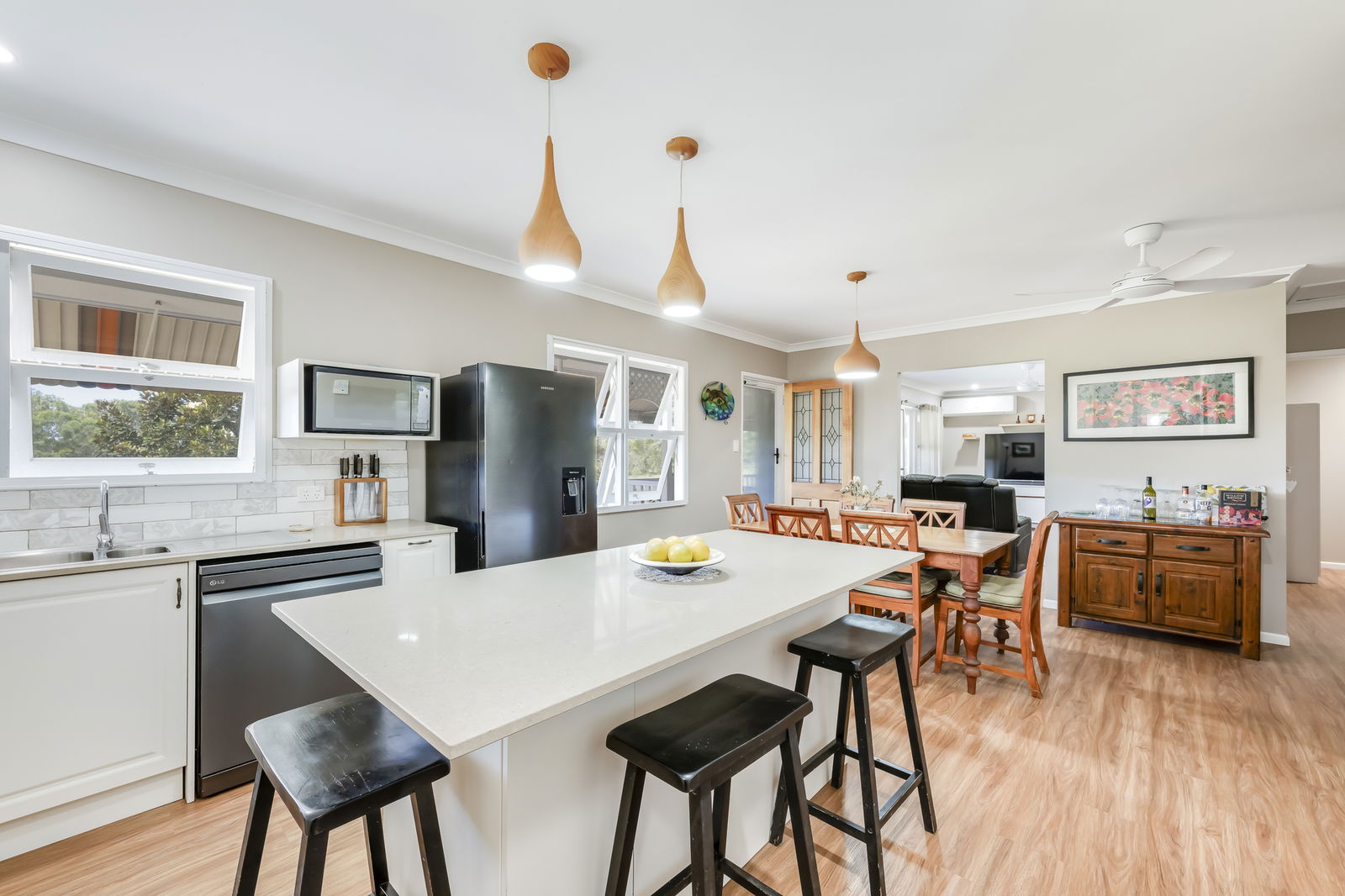 - Large open-plan kitchen with stone benchtops