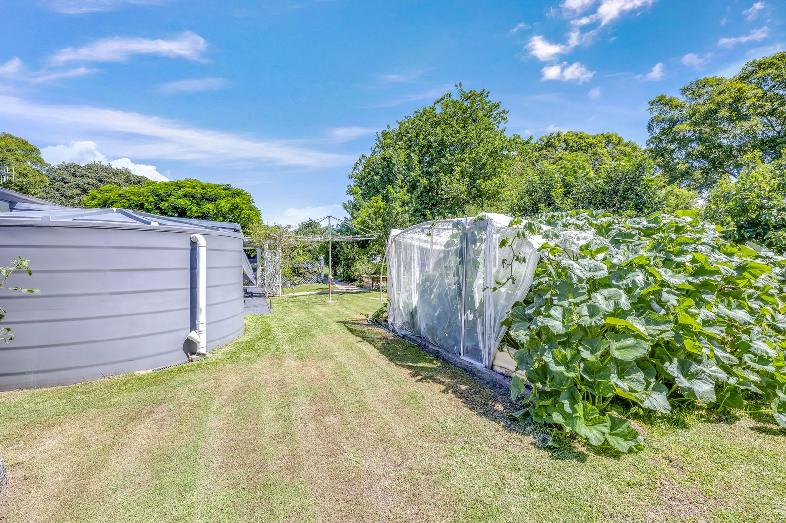 - Two 5,000-gallon water tanks plus bore water for gardens