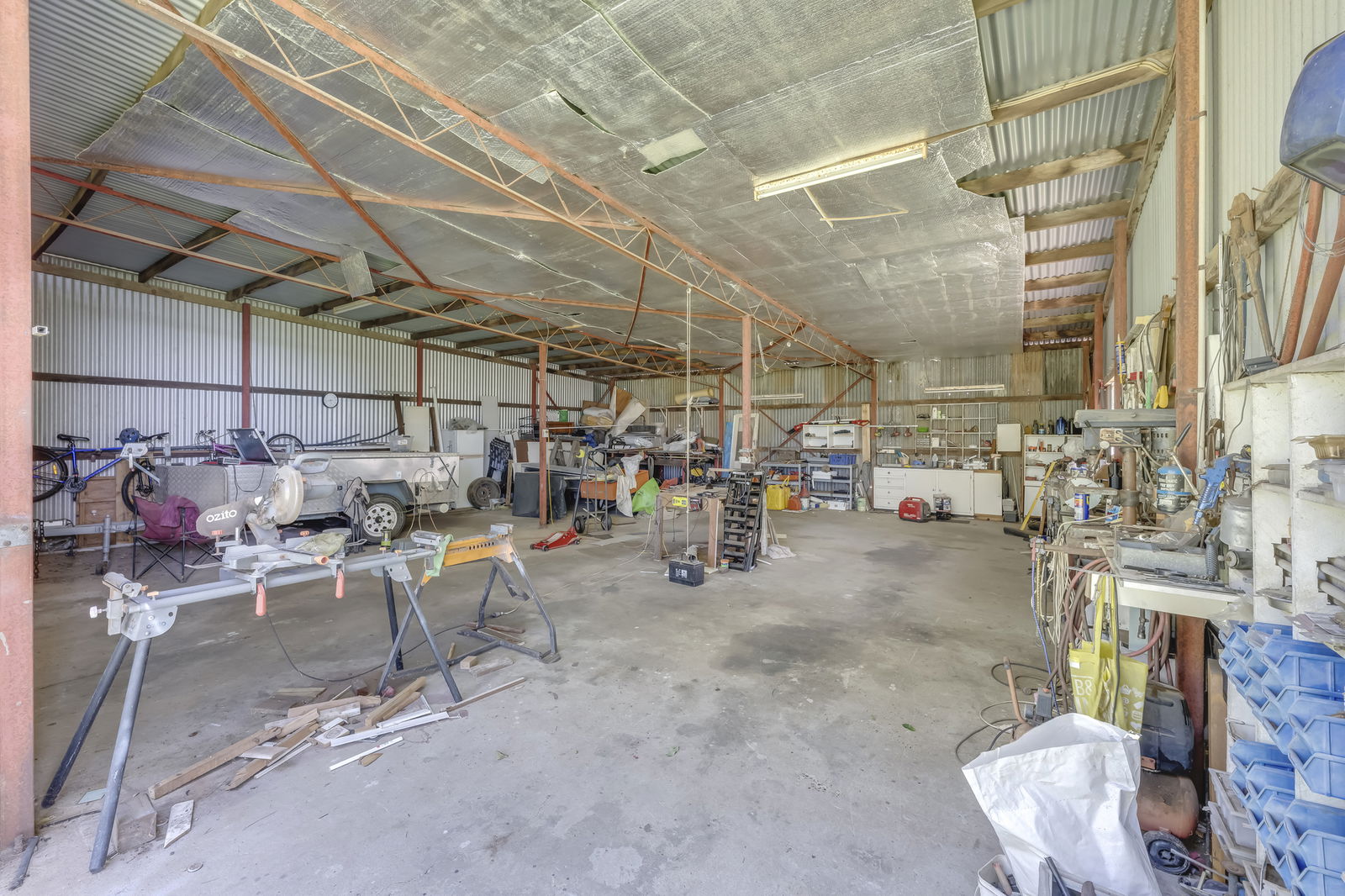 - Large high-clearance powered shed on concrete slab (fits multiple vehicles)