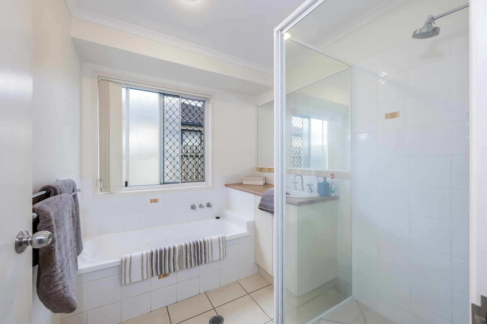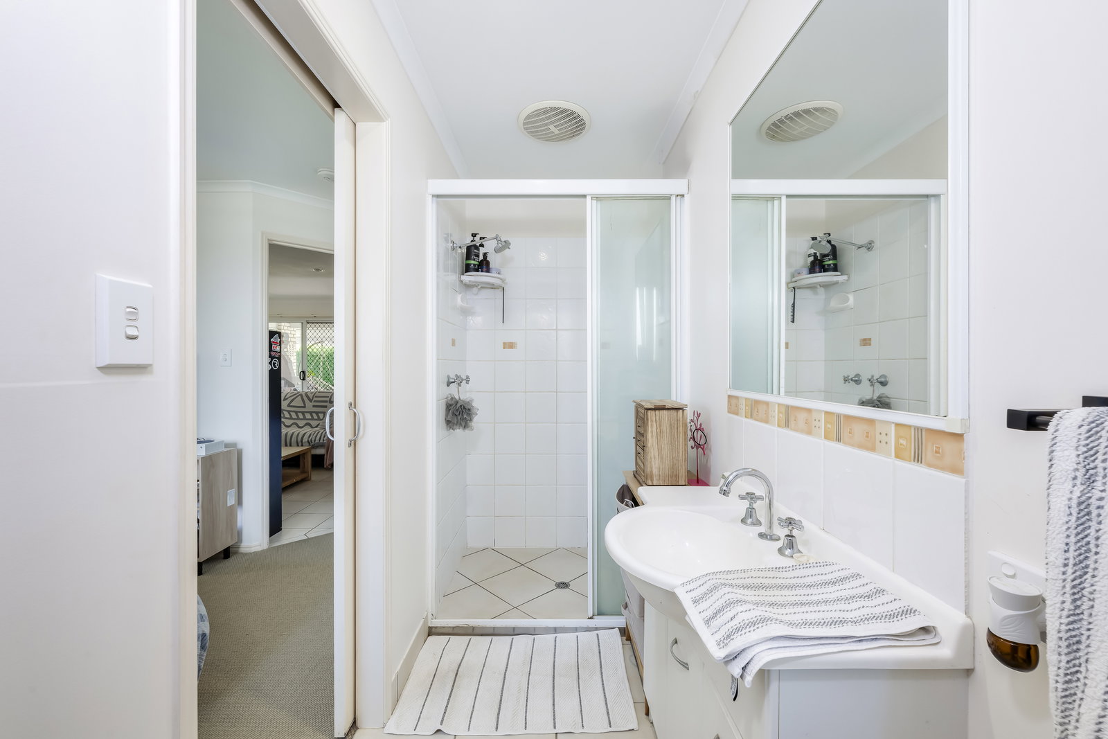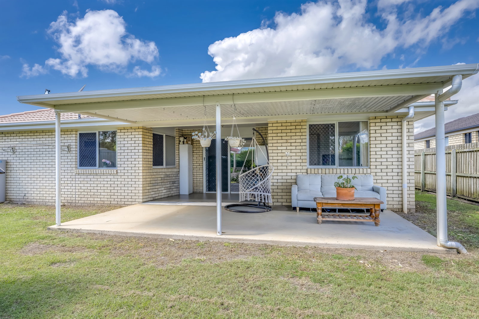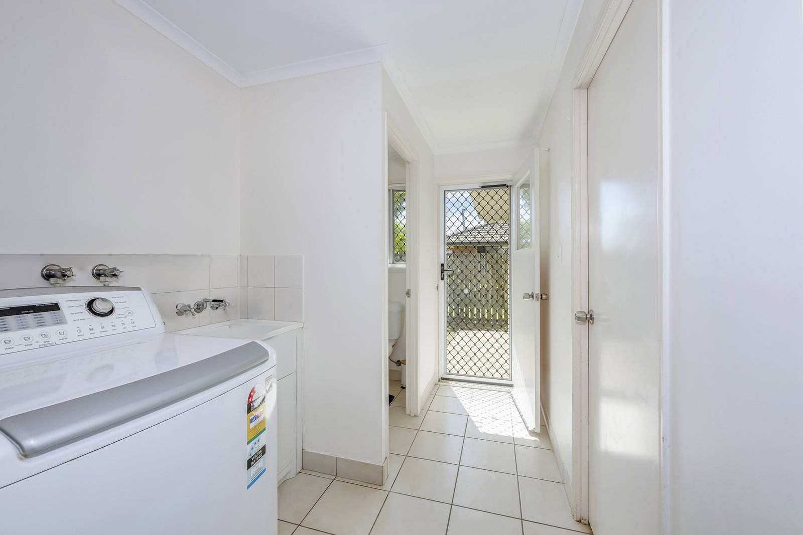 The home is serviced by a full-size main bathroom with vanity, shower, and bathtub, complemented by a separate toilet. The laundry is spacious and practical, with built-in storage and direct access to the backyard clothesline, making everyday living effortless.