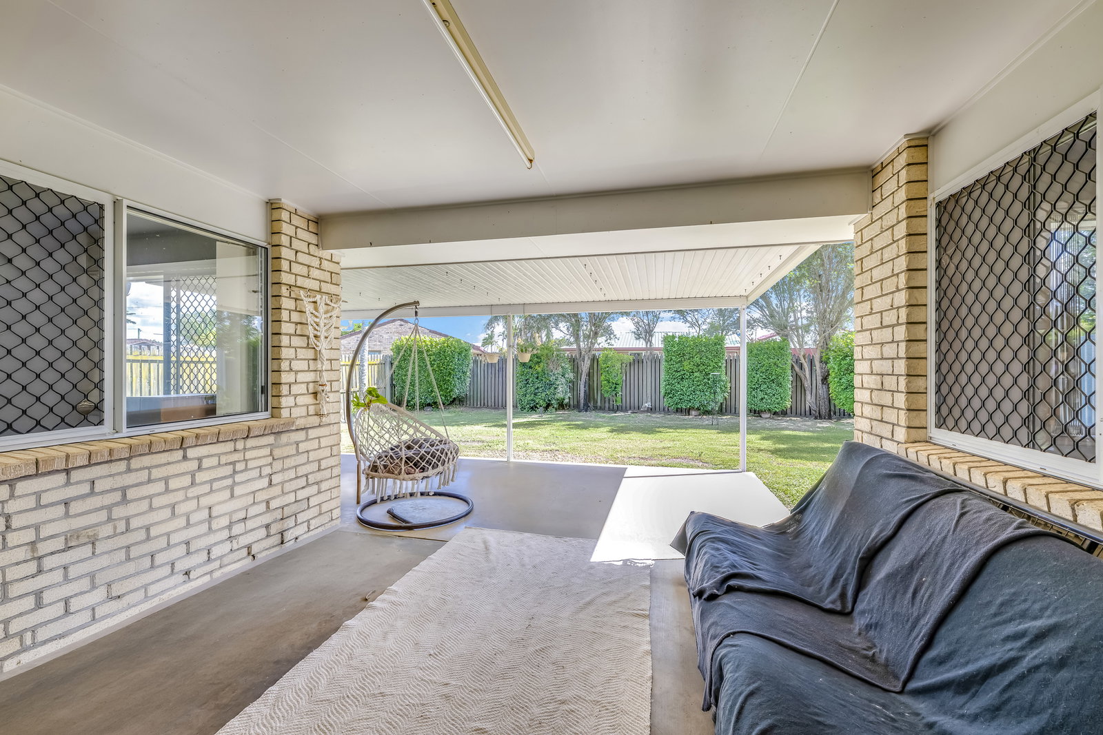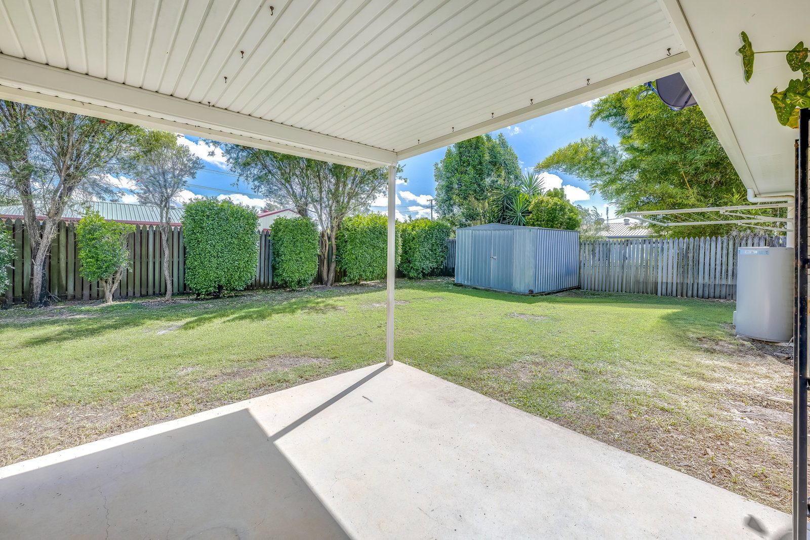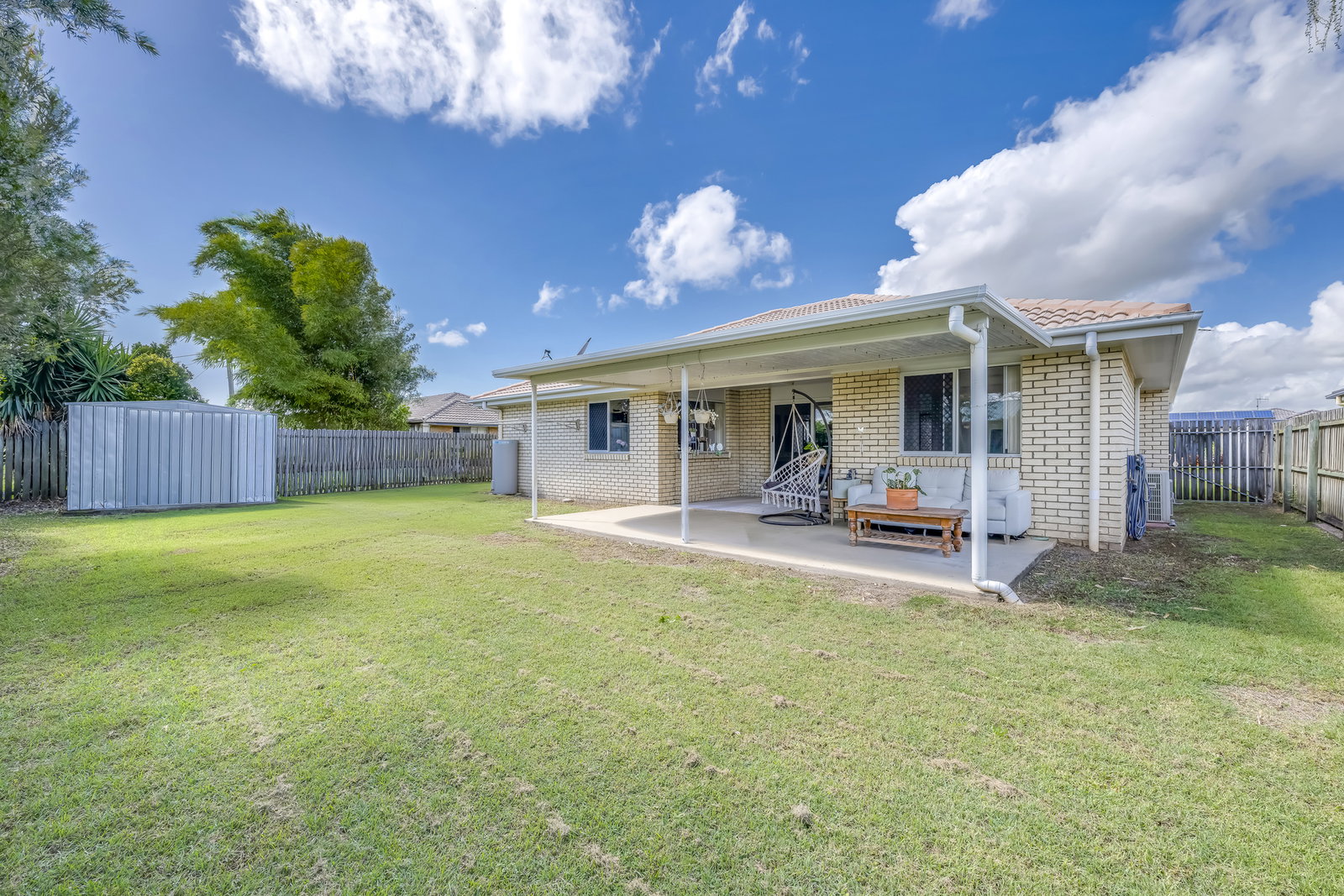 Outdoors, the property truly shines. An extended patio and concrete entertaining area create a relaxing, all-weather space for family gatherings or casual entertaining, shaded by established trees and surrounded by neatly hedged gardens. The private backyard includes a garden shed, providing additional storage and ample space for children to play or for future enhancements.