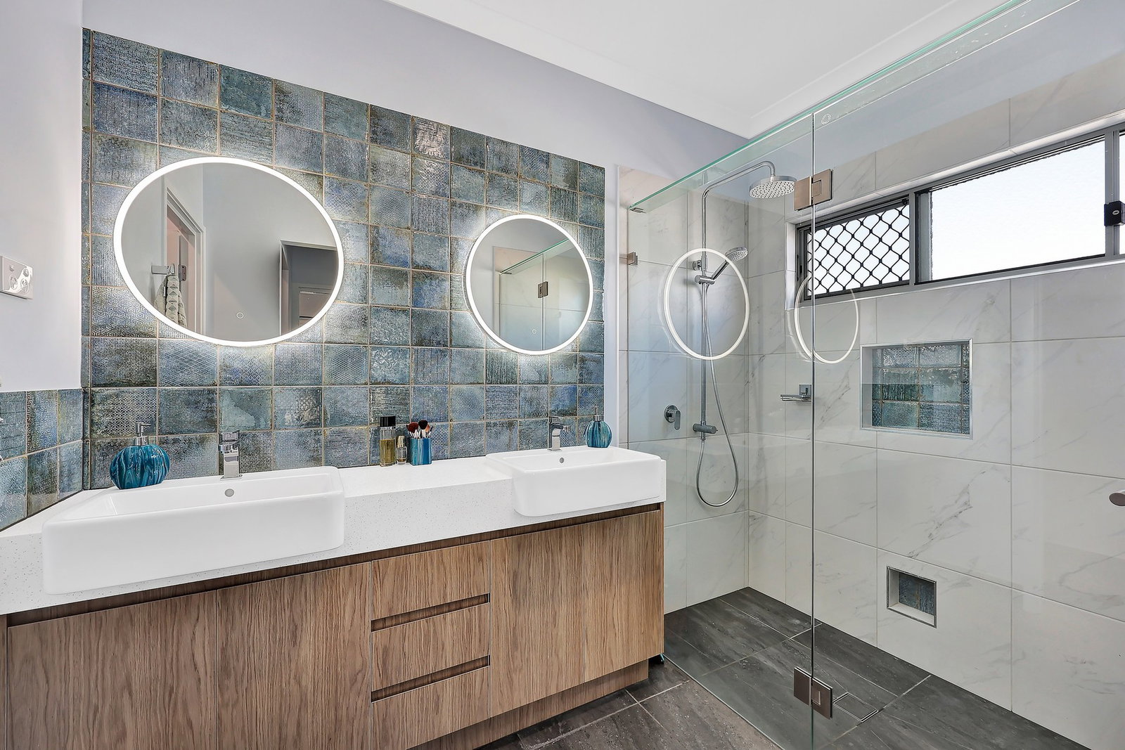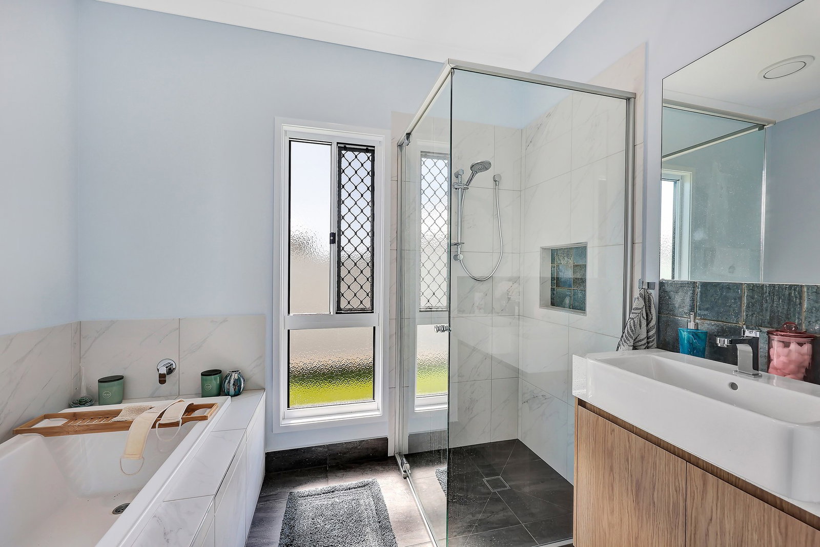 Accommodation comprises four generously proportioned bedrooms, including a private master retreat with a beautifully appointed ensuite featuring double vanities and a considered layout for comfort and separation.