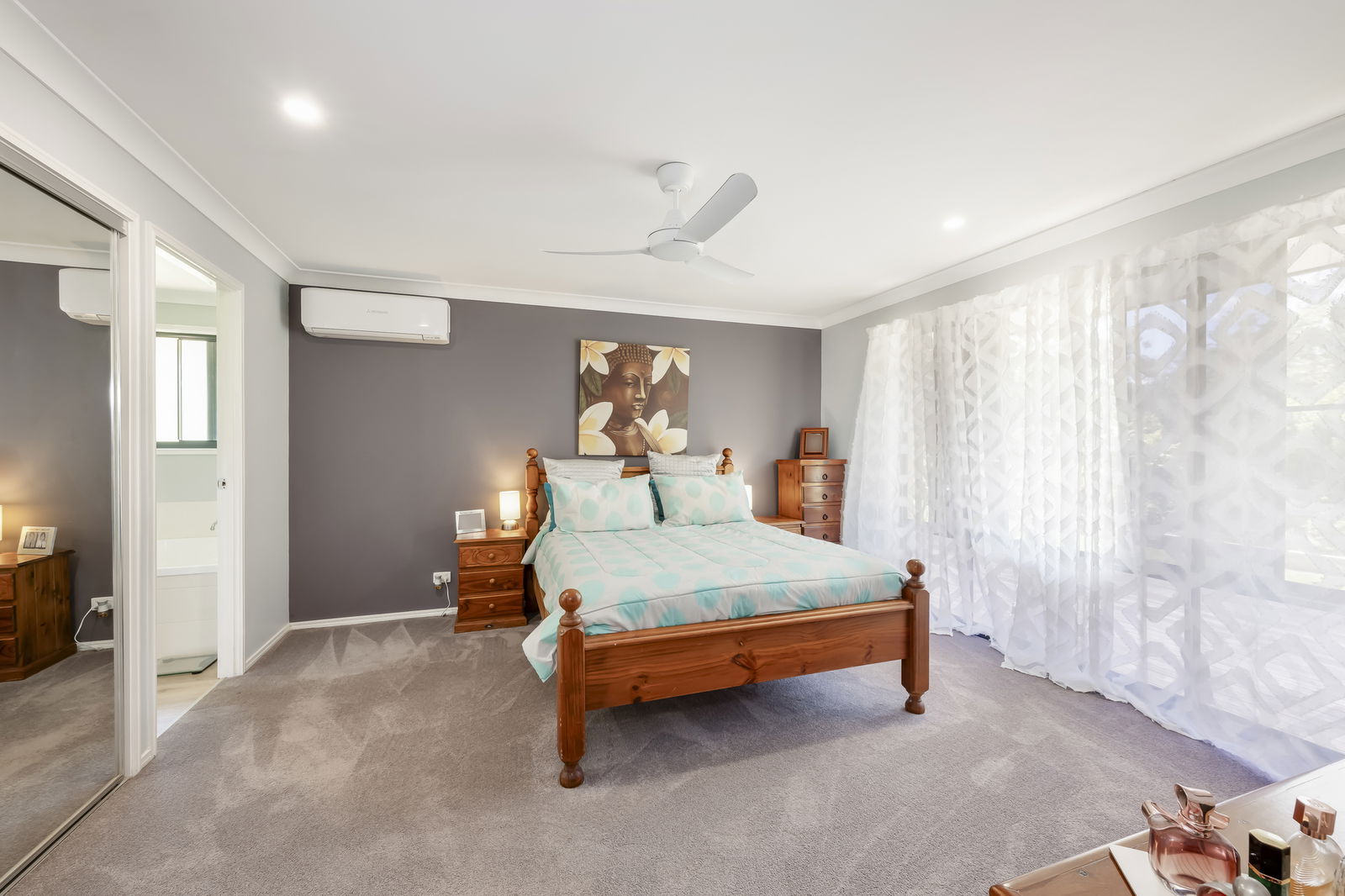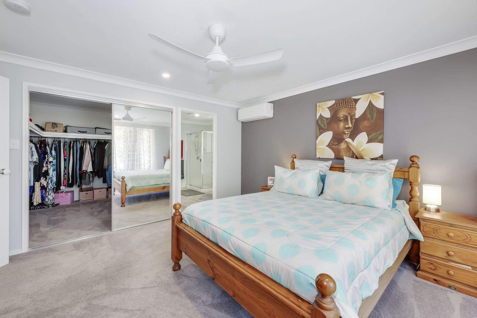 -Master suite well above average size and includes air-conditioning, spacious ensuite and large walk in robe with shelving.