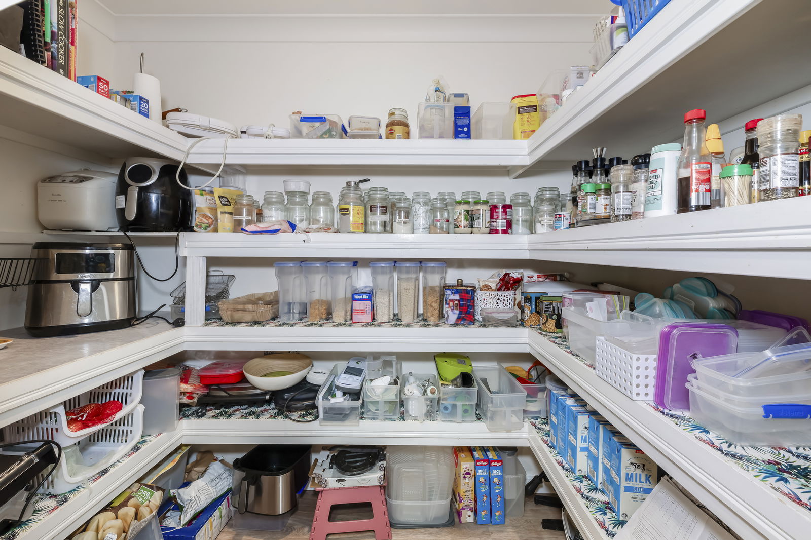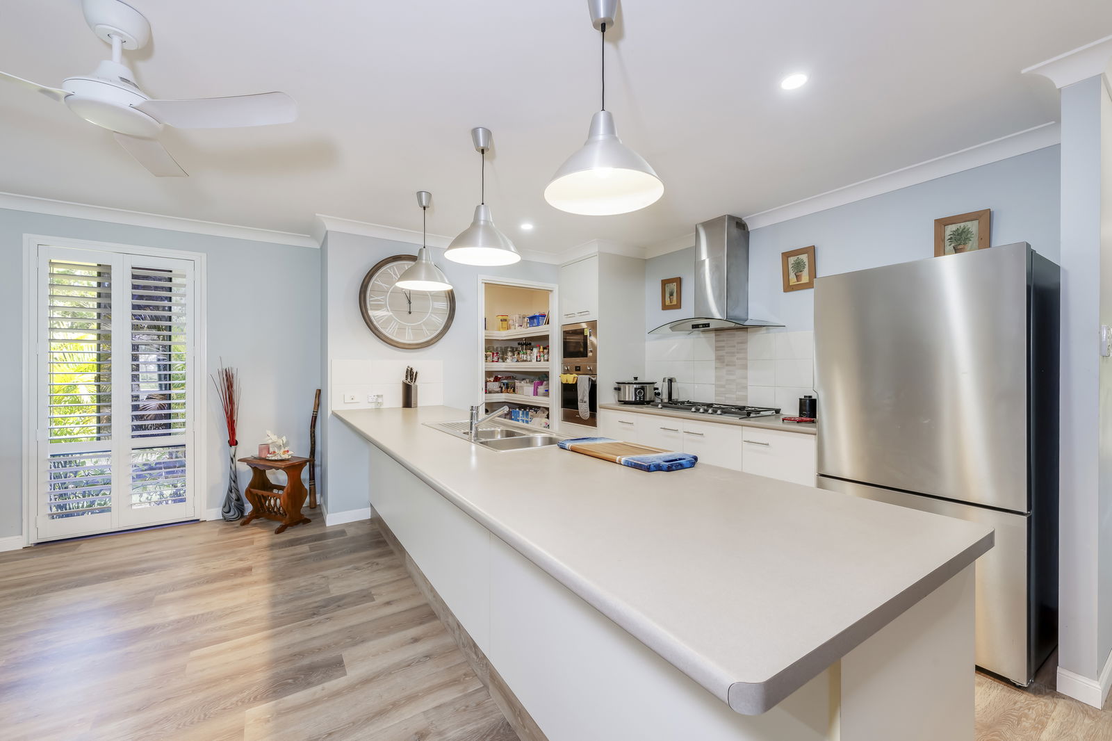 - Spacious kitchen with SMEG gas cooktop, electric wall over and built in microwave, BOSCH dishwater, breakfast bar and walk-in pantry.