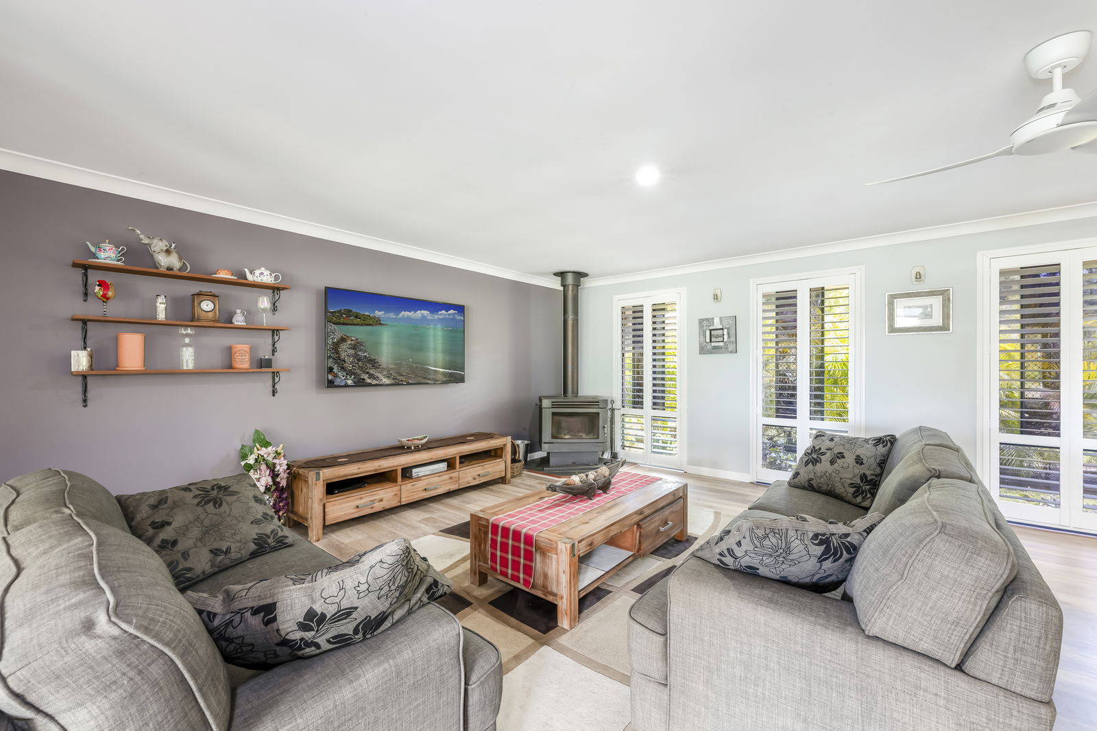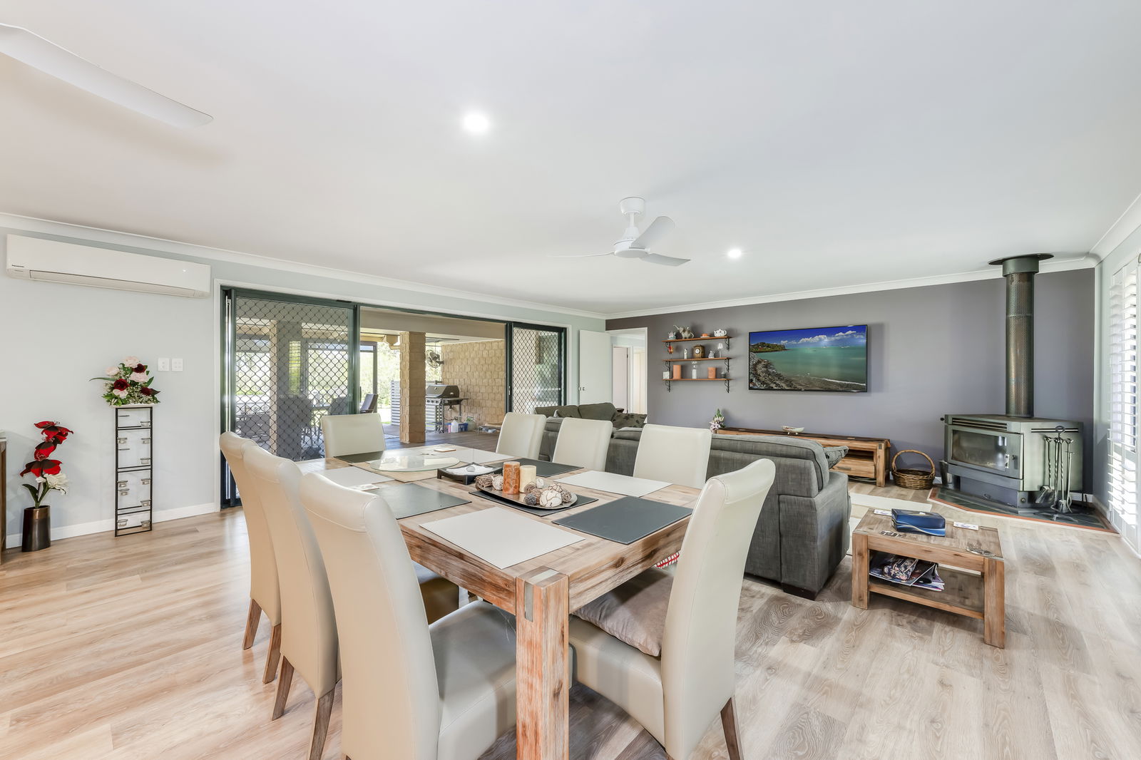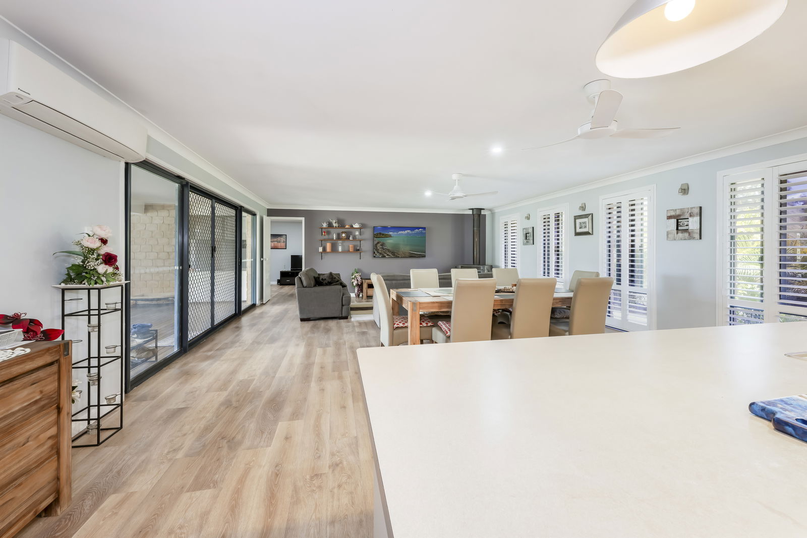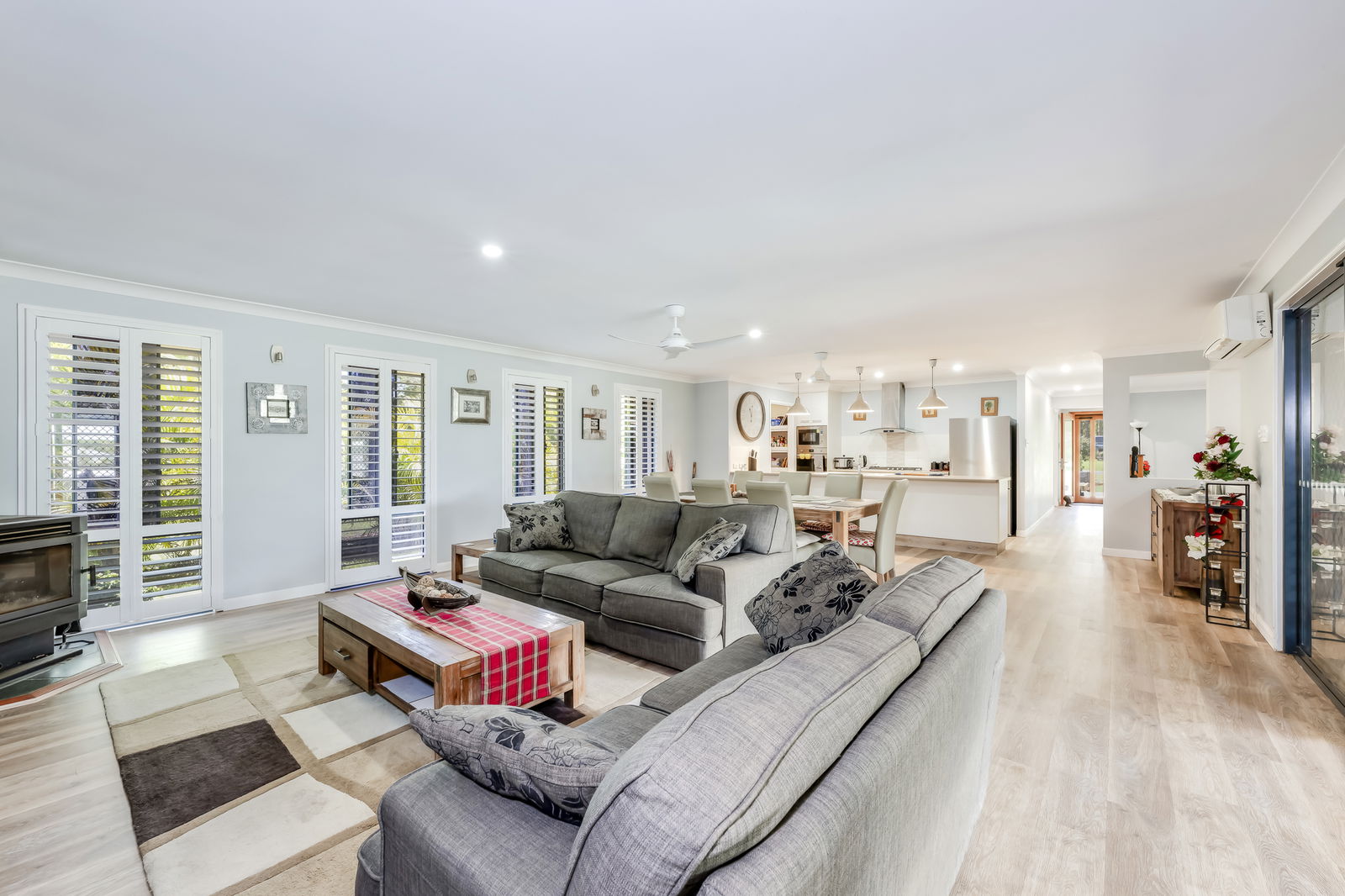 4 bedroom, 2 bathroom with study and multiple living areas offering approximately 339m² under roof. The home has been thoughtfully designed for family living. A supersized open-plan zone incorporates kitchen, dining, lounge with plantation shutters and family areas. All complete with reverse-cycle air-conditioning and a combustion fireplace capable of warming the entire home through winter. The kitchen is both functional and refined.
