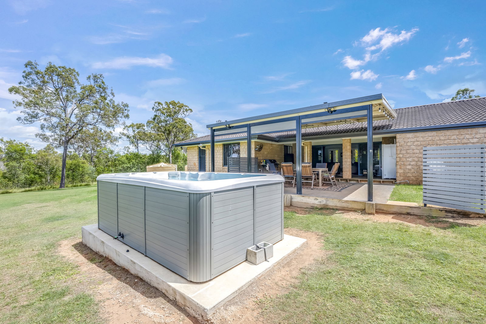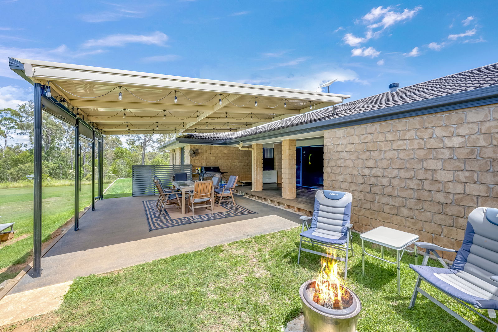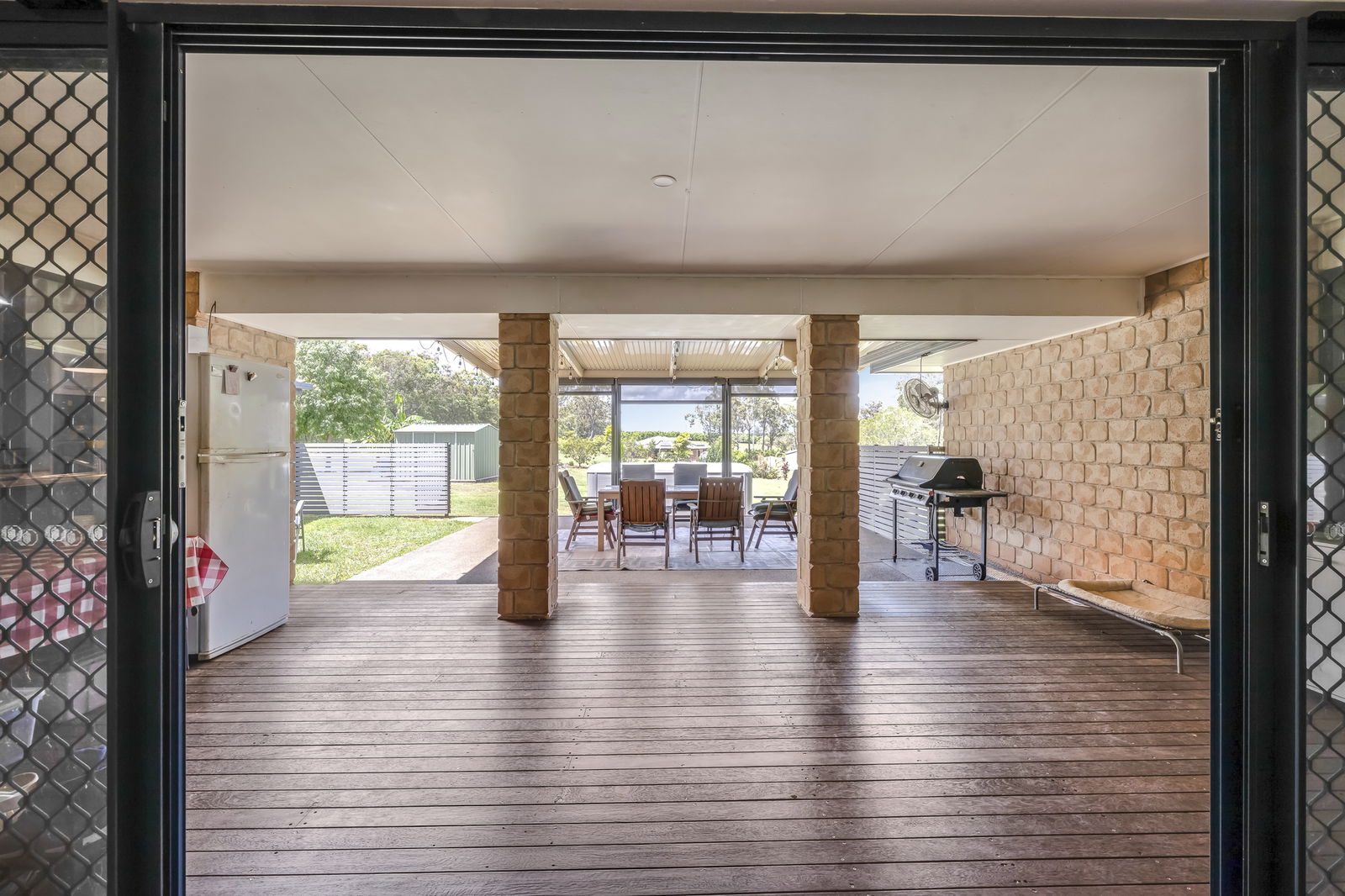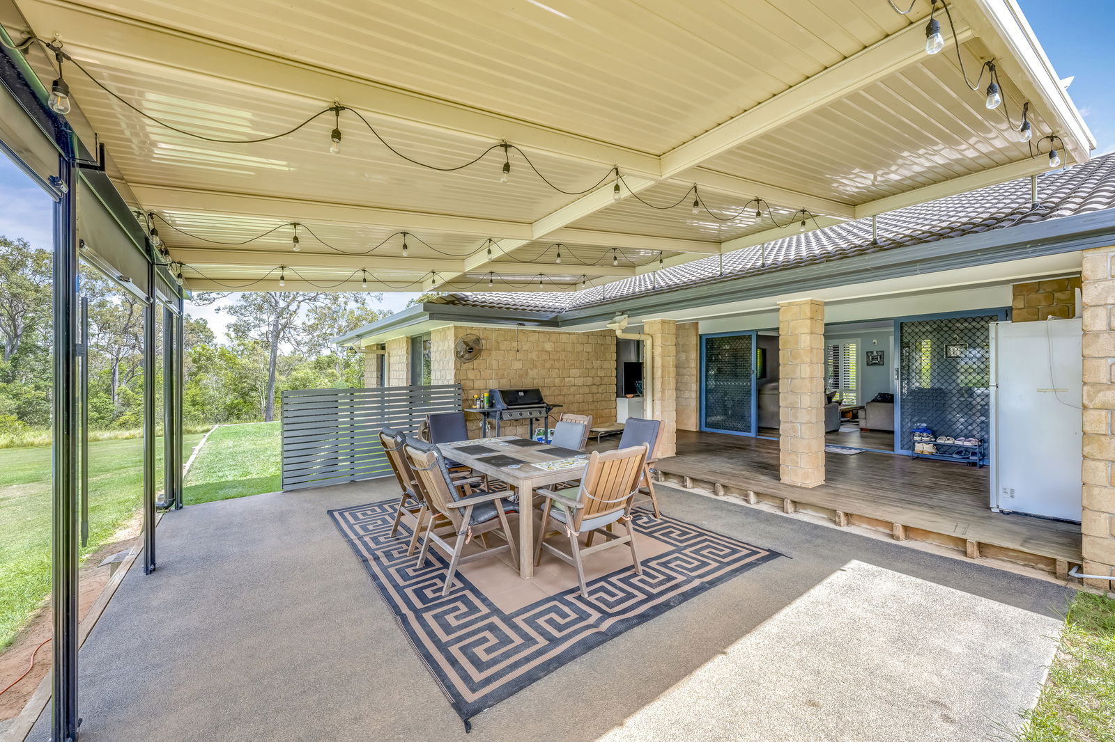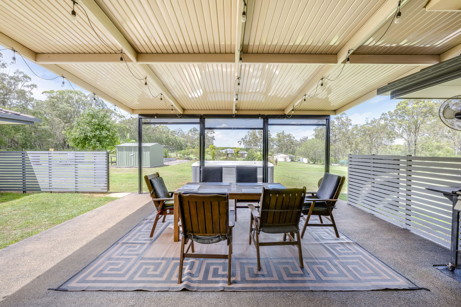 - Main outdoor entertainment area comes complete with blinds for all-weather use and lockable fenced enclosure with gate.