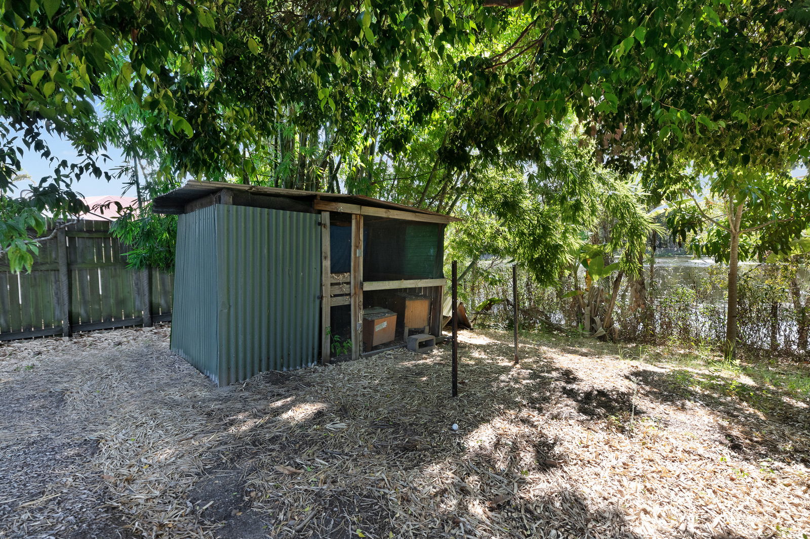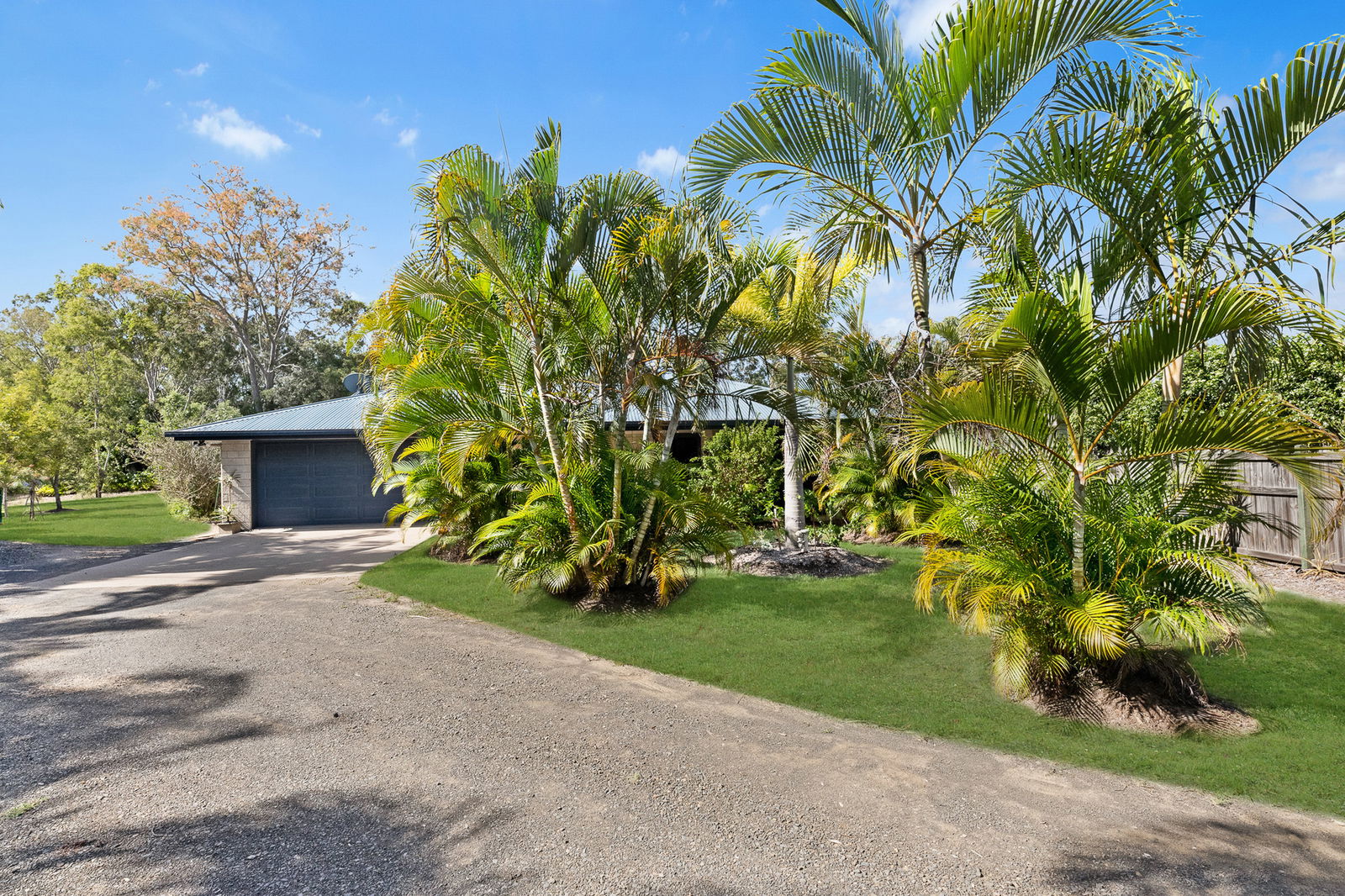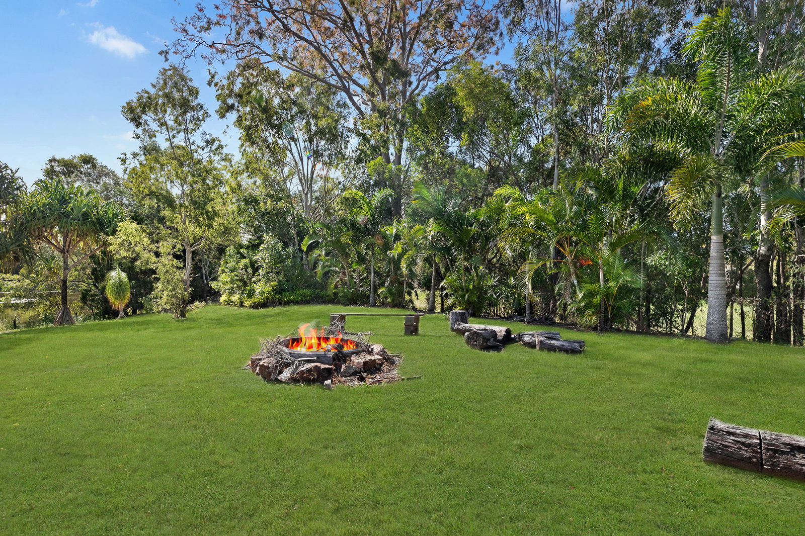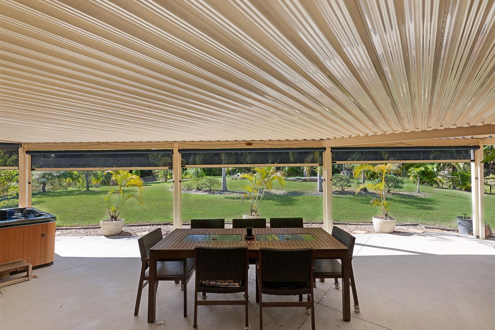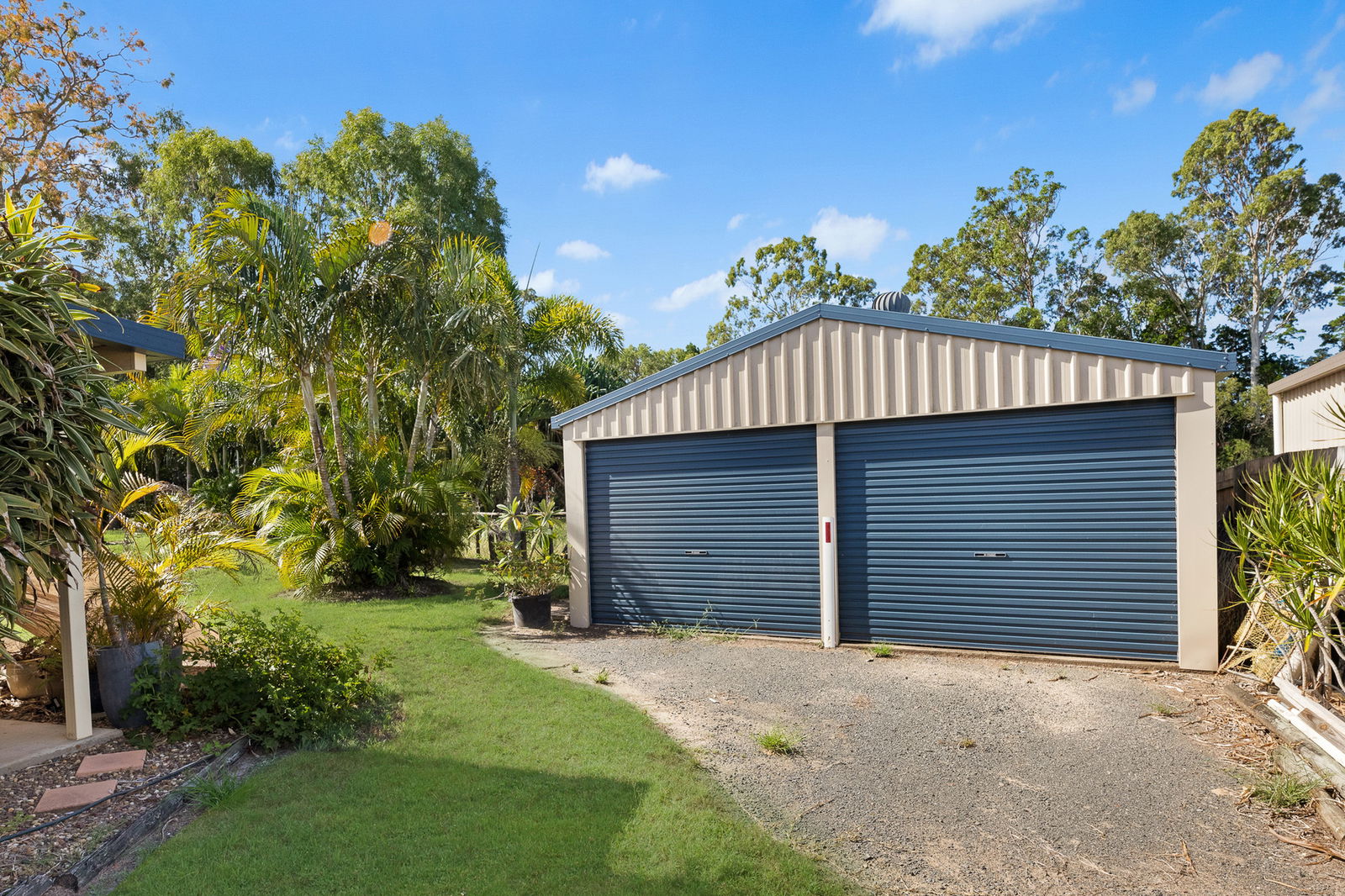 The large outdoor entertaining area overlooks the rear yard and lagoon and includes pull-down privacy and shade blinds, making it usable year-round. A separate double Colorbond garage provides excellent additional storage or workshop space, while the established orchard and fire pit area complete the setting.