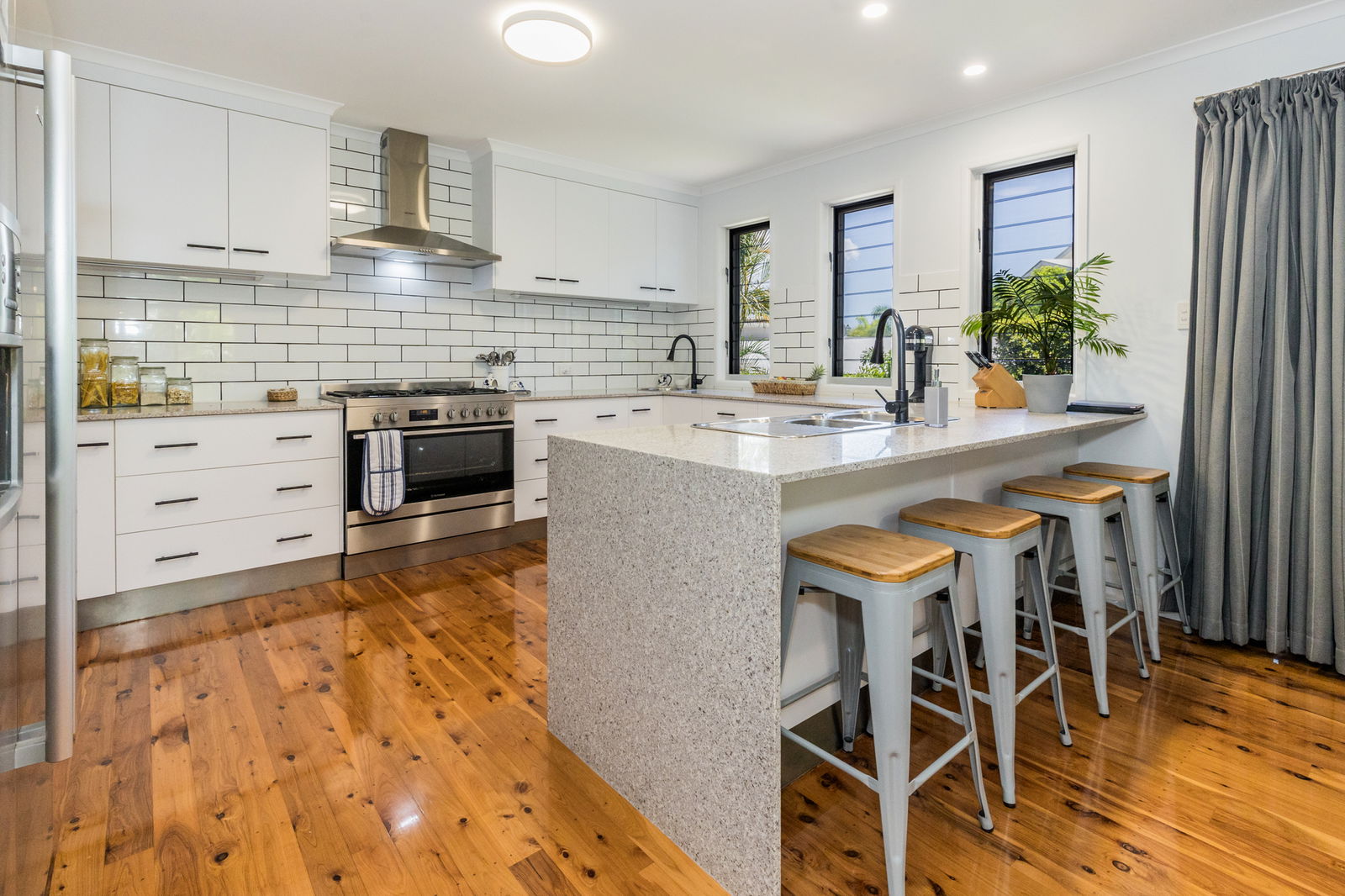 From the moment you step inside, the home reveals a fresh, contemporary palette of soft whites and misty greys, perfectly complementing the light-filled interiors. At the heart of the home, the designer kitchen showcases quality appliances, sleek finishes, and generous preparation space-ideal for everyday living or hosting in style.