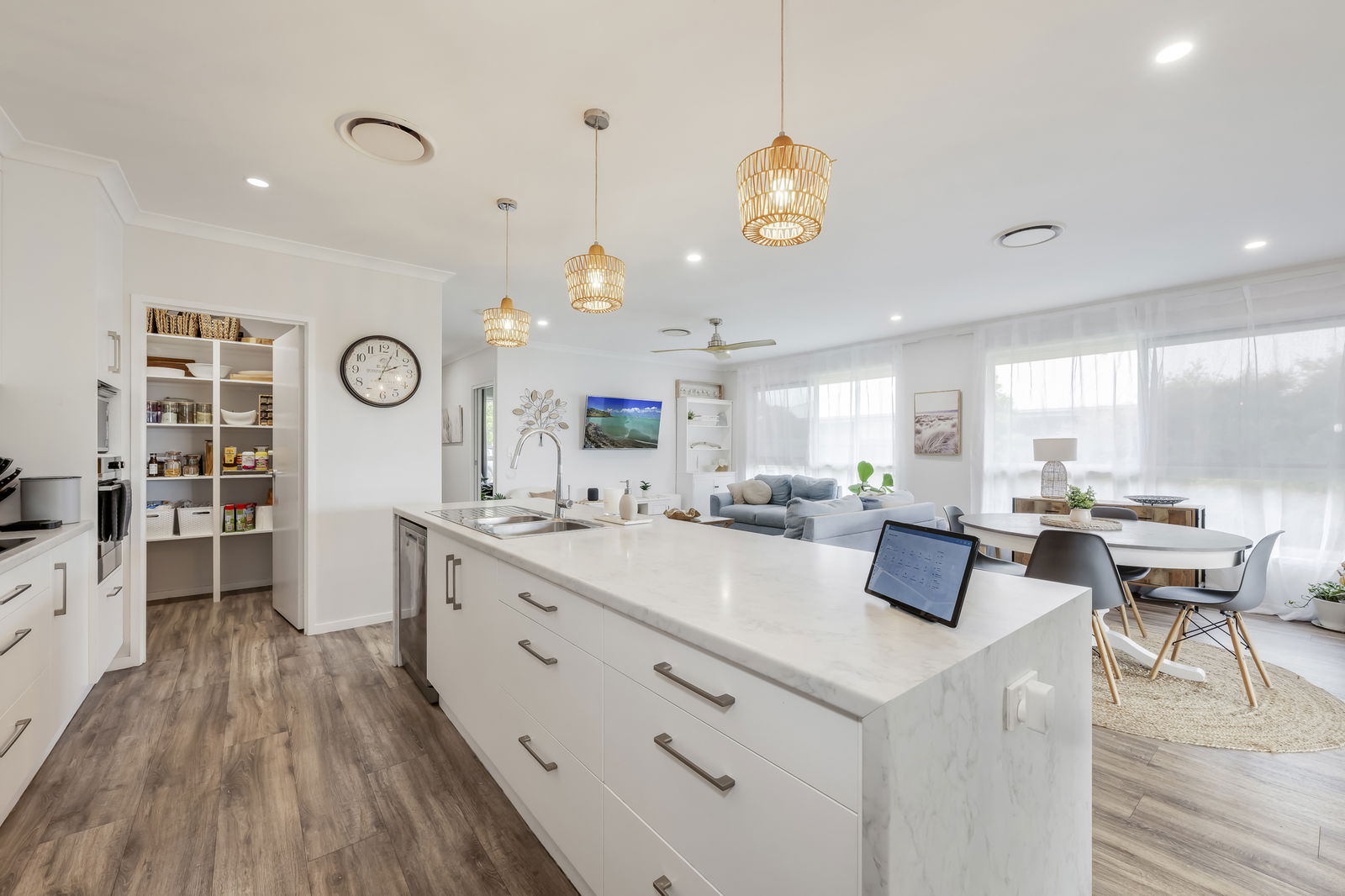 - Open-plan kitchen, living and dining area bathed in natural light.
