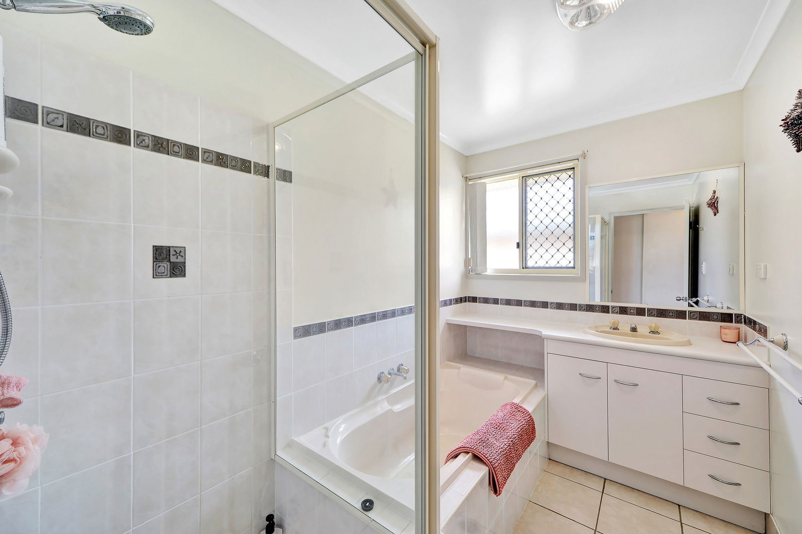 - Main bathroom in immaculate condition with bath, corner shower and vanity.