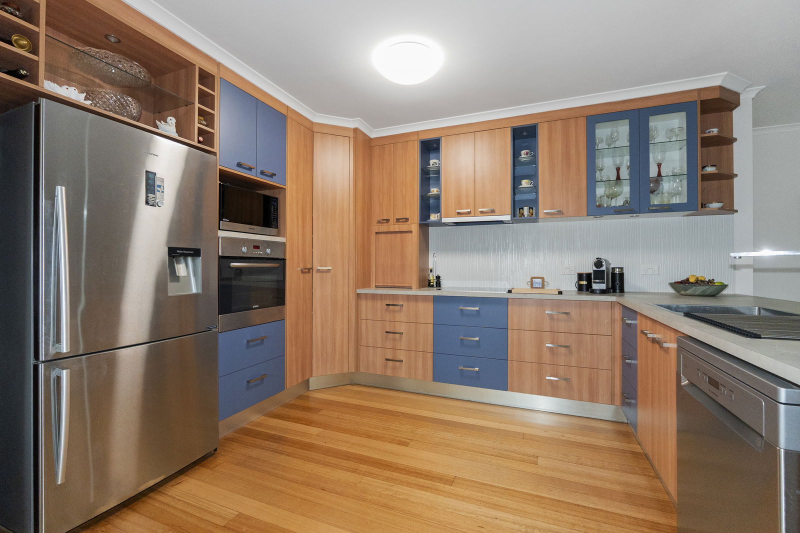 The updated C-shaped kitchen is the true heart of the home, featuring an induction cooktop, waist-height wall oven, stainless steel dishwasher and a convenient coffee station complete with a roller door, integrated wine storage and breakfast bar