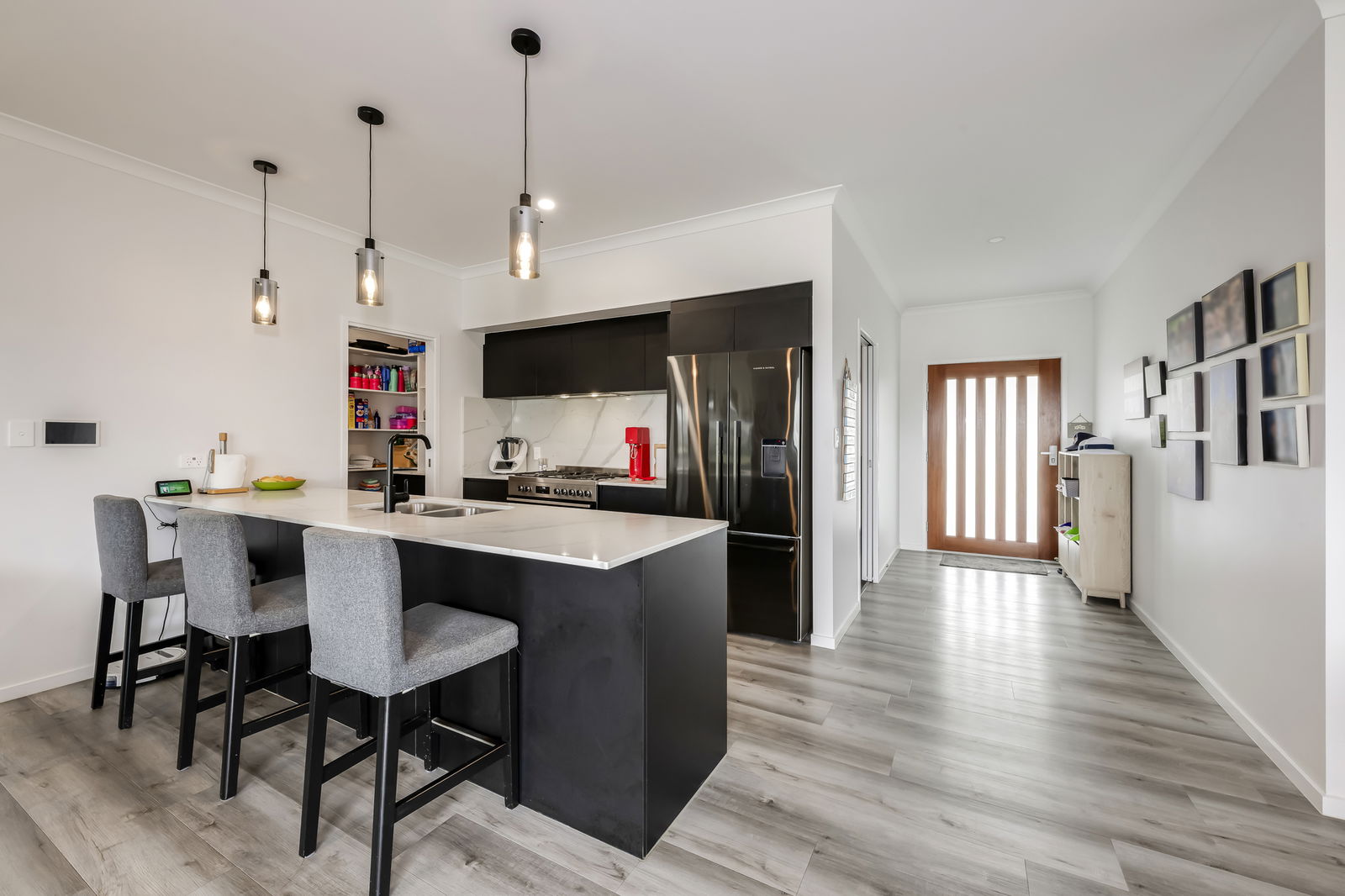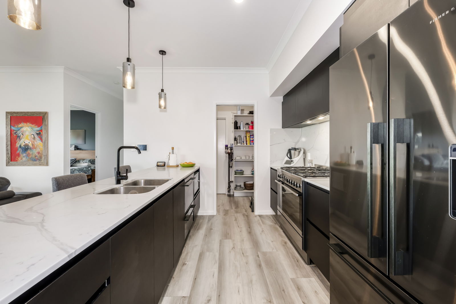 - Designer kitchen with stone benchtops and splashbacks, plumbed fridge space, gas cooktop and oven, and large walk-in pantry