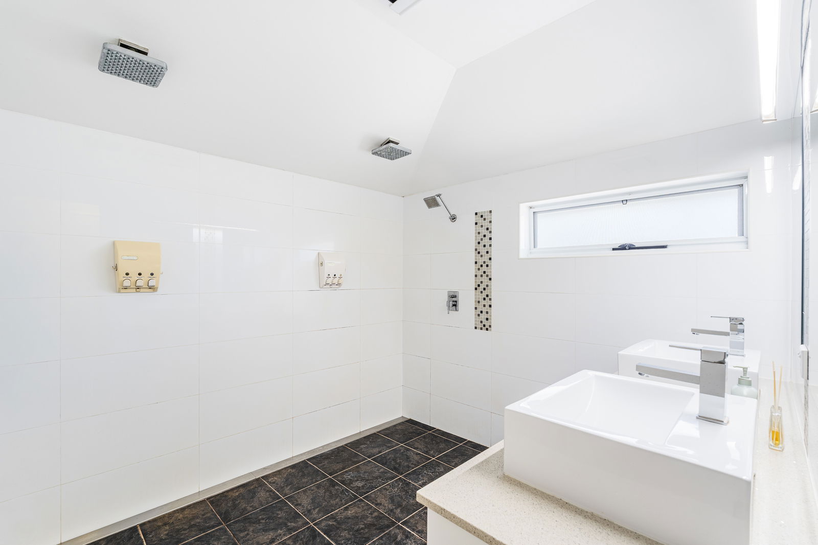 Stylish modern double shower and vanity main bathroom