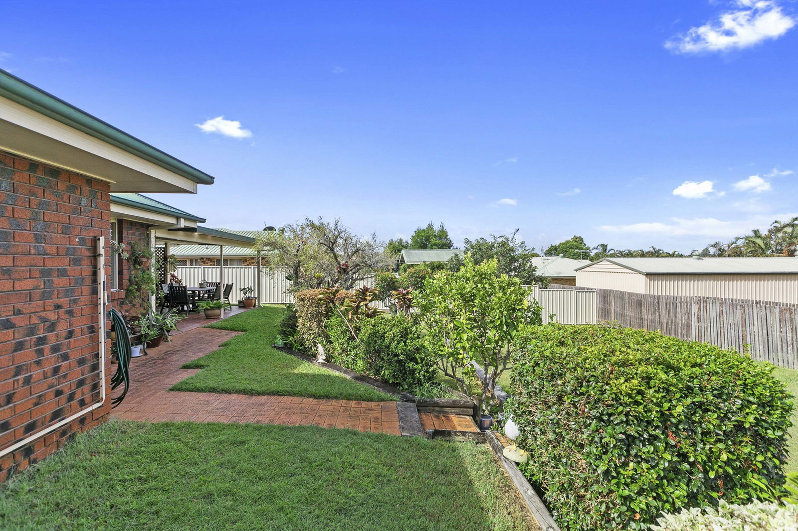 Four well-proportioned bedrooms all include built-in wardrobes, while the main bedroom enjoys the privacy of its own ensuite. Both bathrooms are neat and functional, fitted with practical quarter-turn taps. Outdoors, the covered patio and entertaining area provide the perfect setting for relaxed gatherings, overlooking the picturesque backyard complete with garden shed. A secure carport accommodates up to two vehicles, adding further convenience.