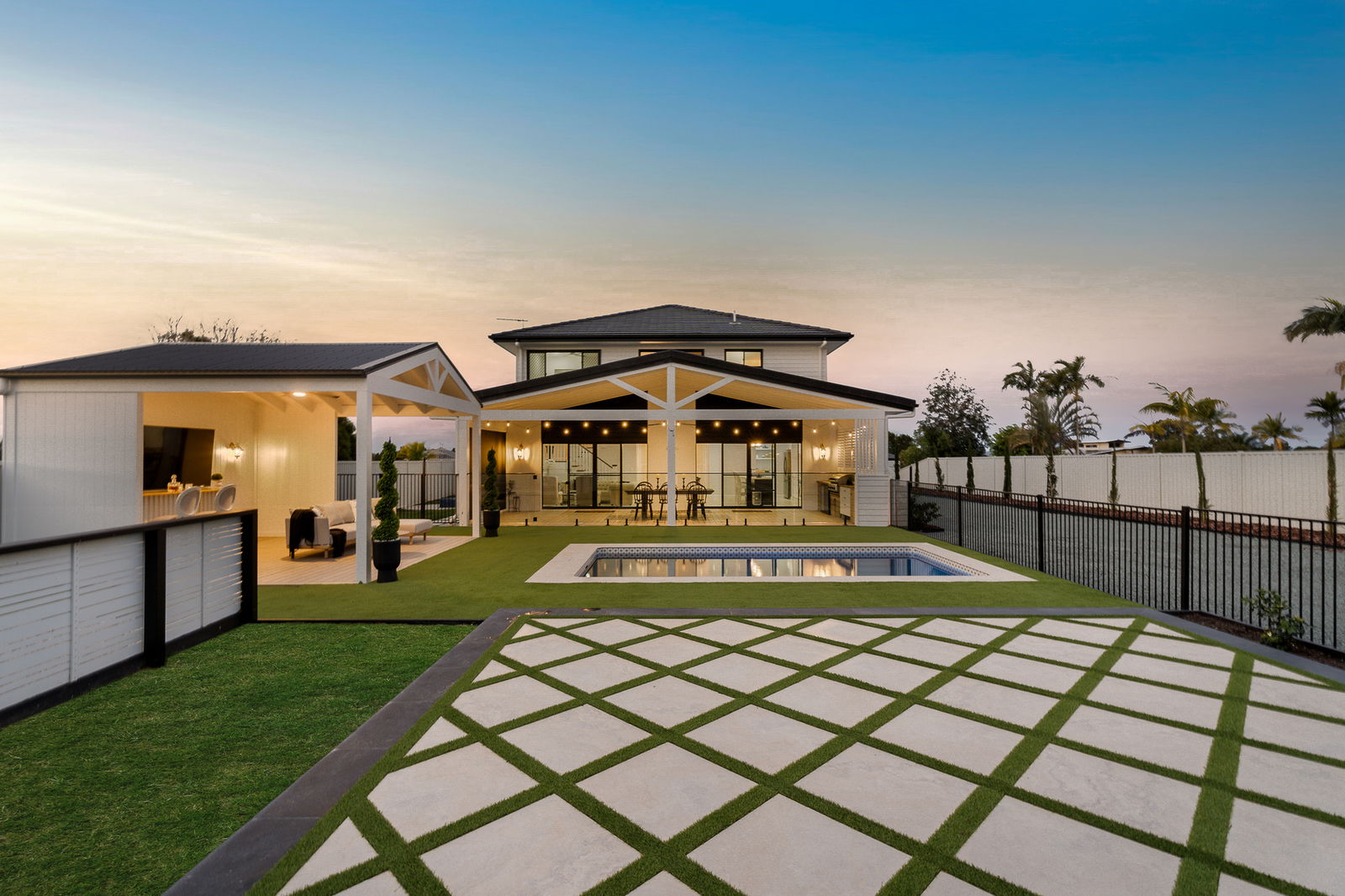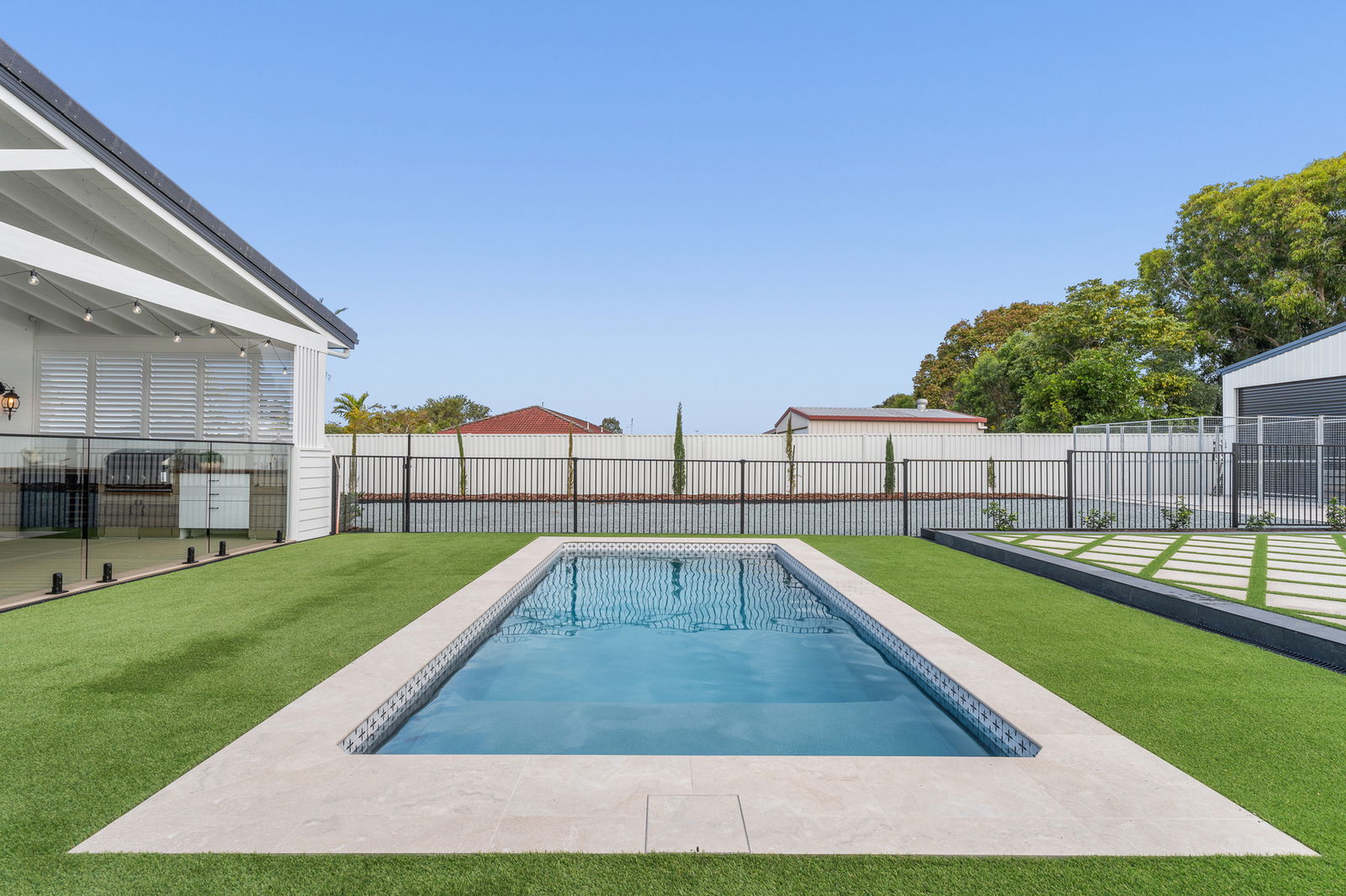 • Plungie Australia pool (6 × 3m) with astroturf surrounds, diamond-pattern travertine paving, and cartridge magnesium pool filtration system