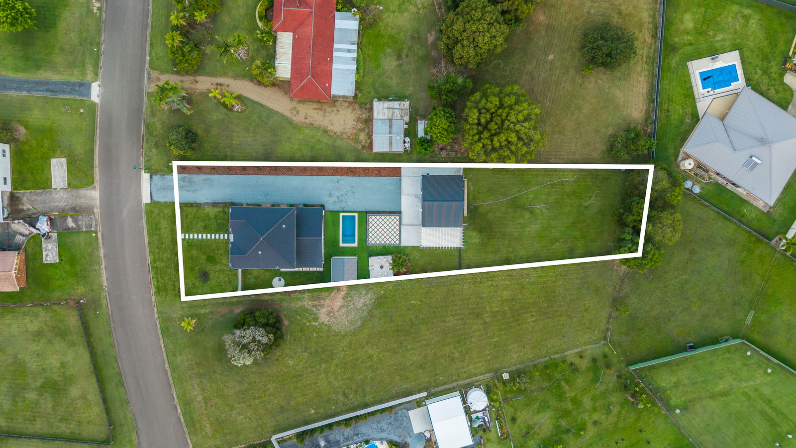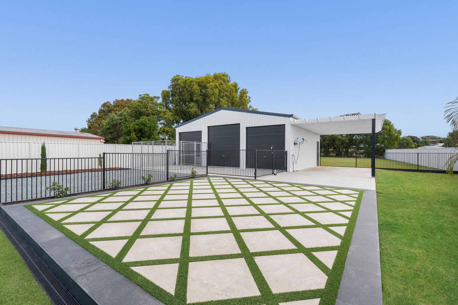 • Wide side access leading to a 10 × 8m three-bay shed plus garage and carport