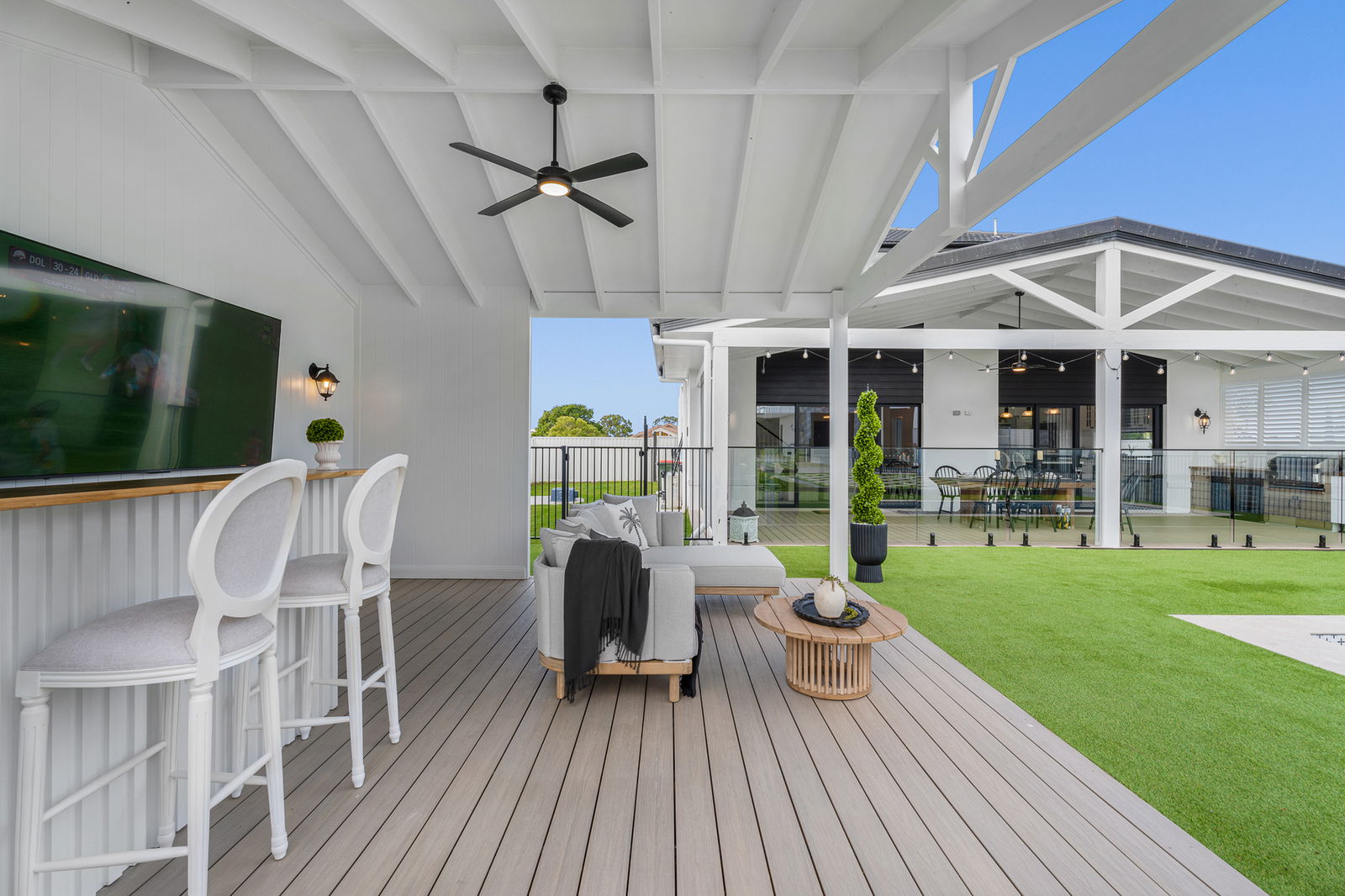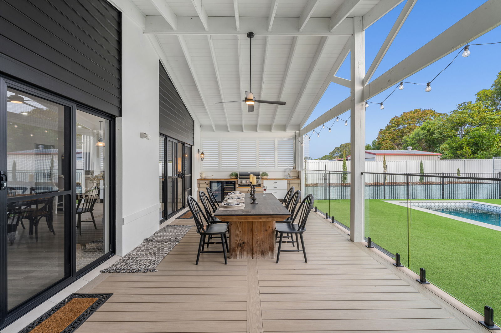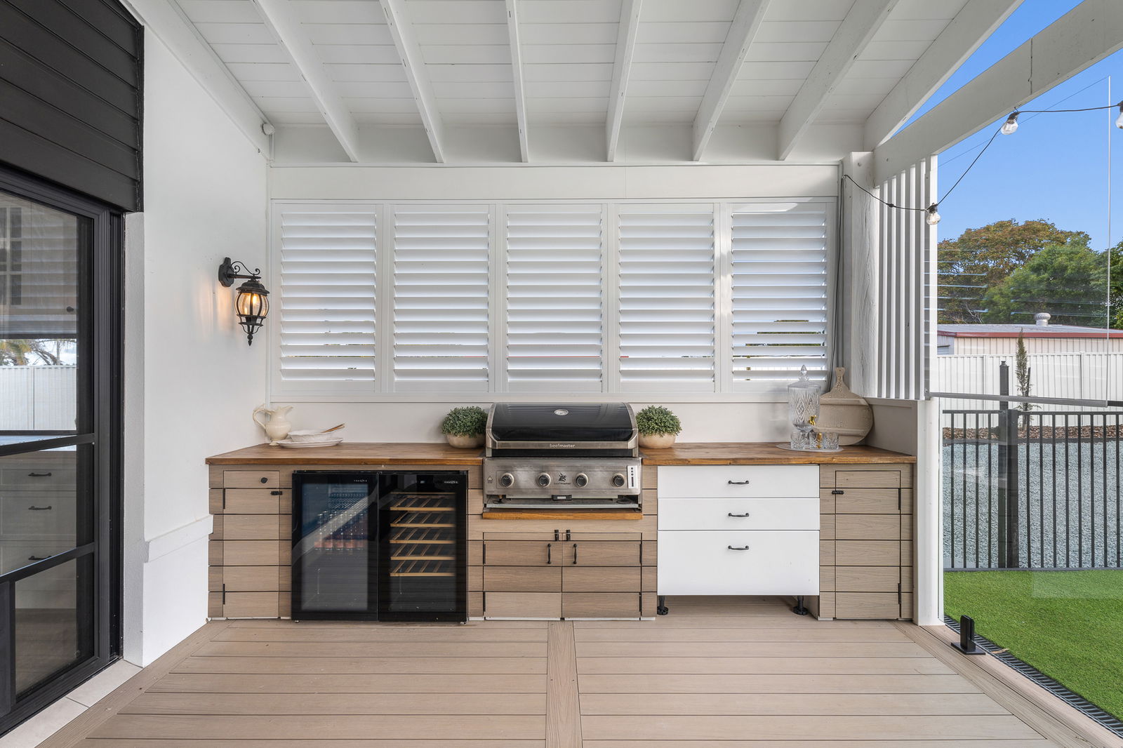 • Built-in outdoor kitchen with Beefmaster 4-burner BBQ, dual Harbour bar & wine fridges, timber benchtops, and cabinetry
