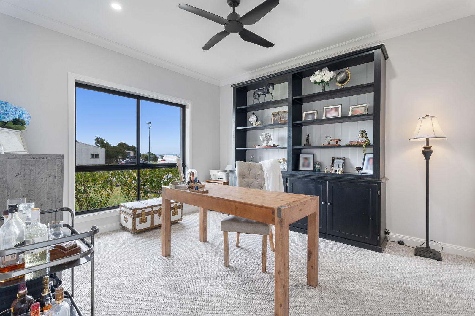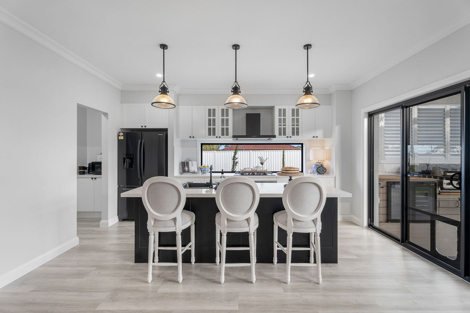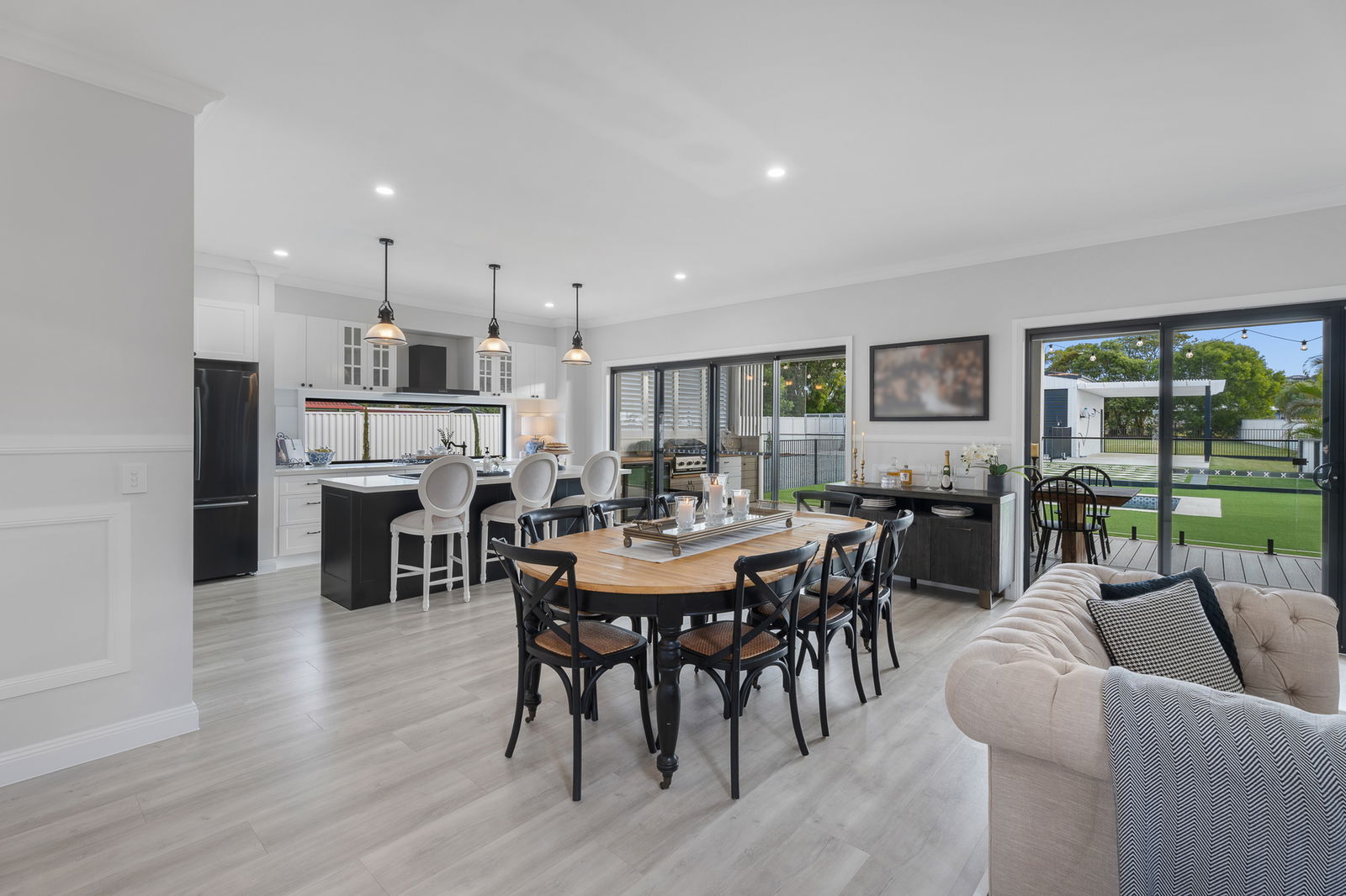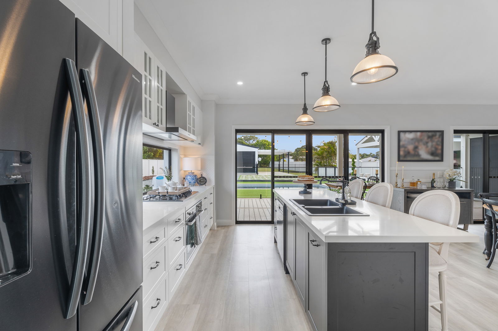 • Built-in outdoor kitchen with Beefmaster 4-burner BBQ, dual Harbour bar & wine fridges, timber benchtops, and cabinetry