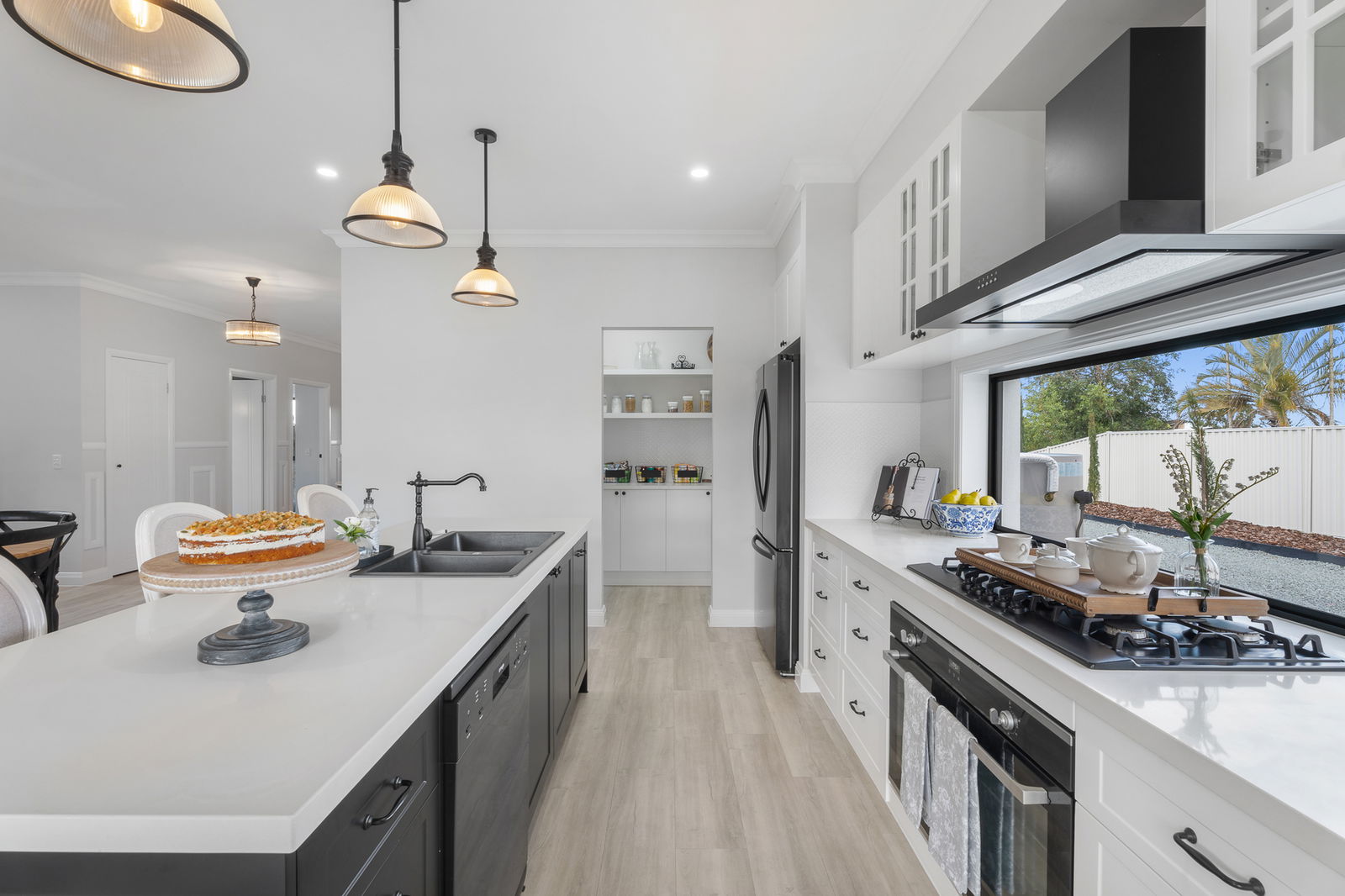 • Hampton-style kitchen with 40mm stone benchtops, Omega five-burner gas stove, Omega oven, and Omega dishwasher