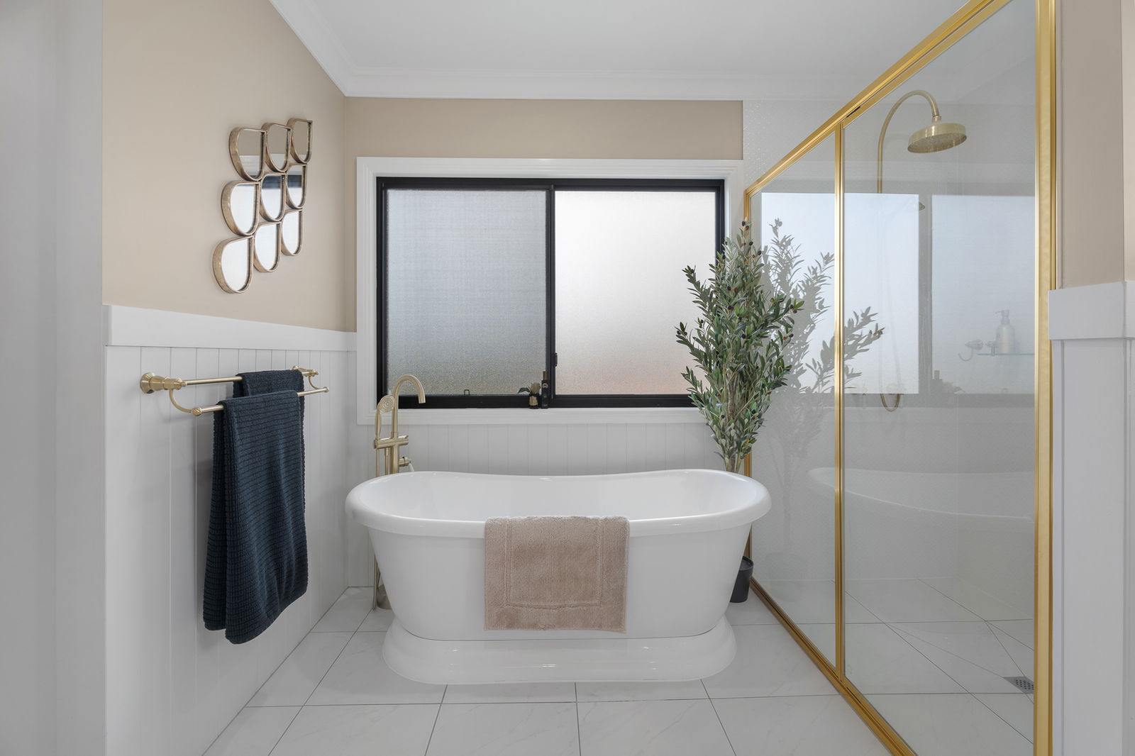 • Freestanding bath with Samios tapware and Axon bathroom walls